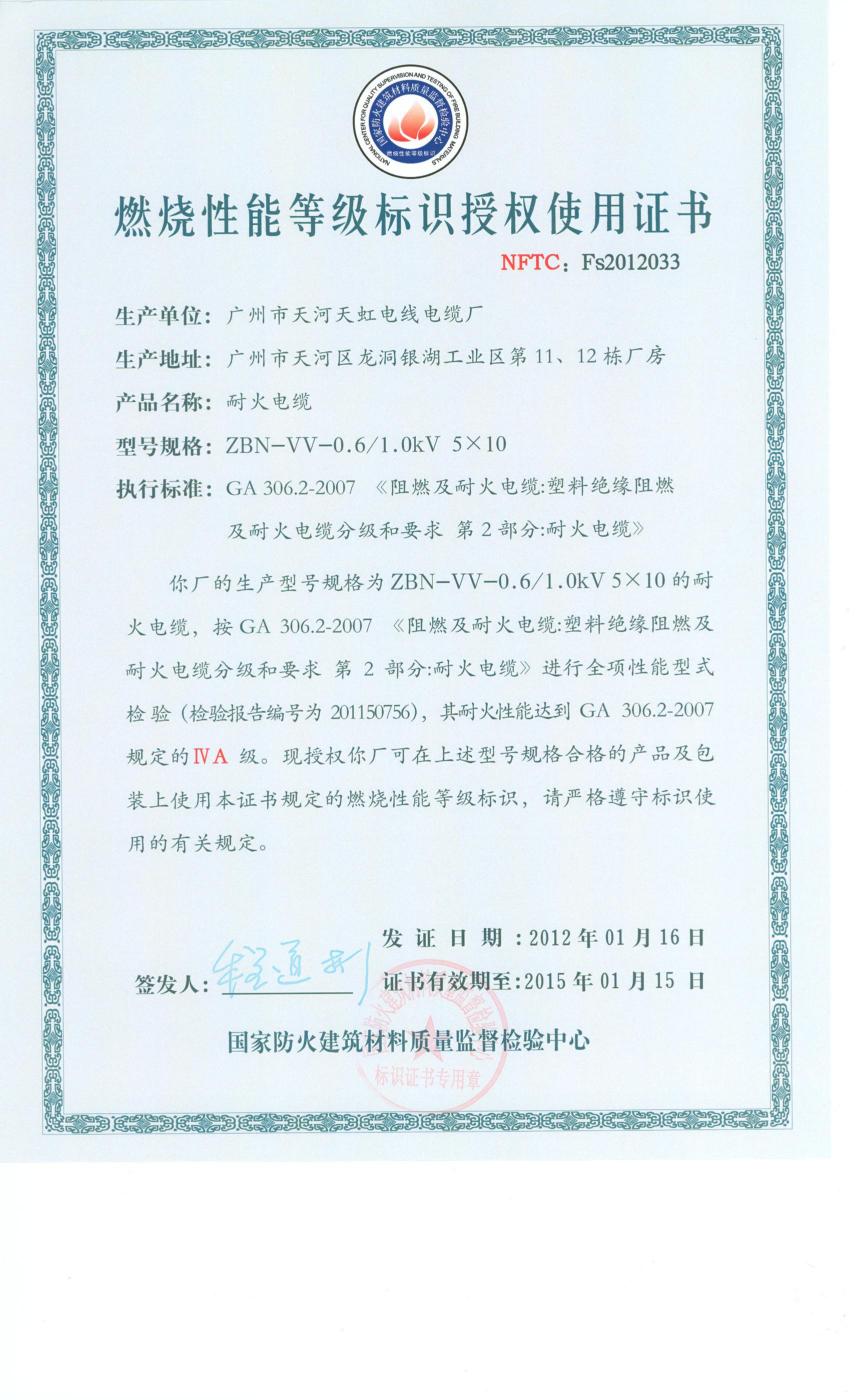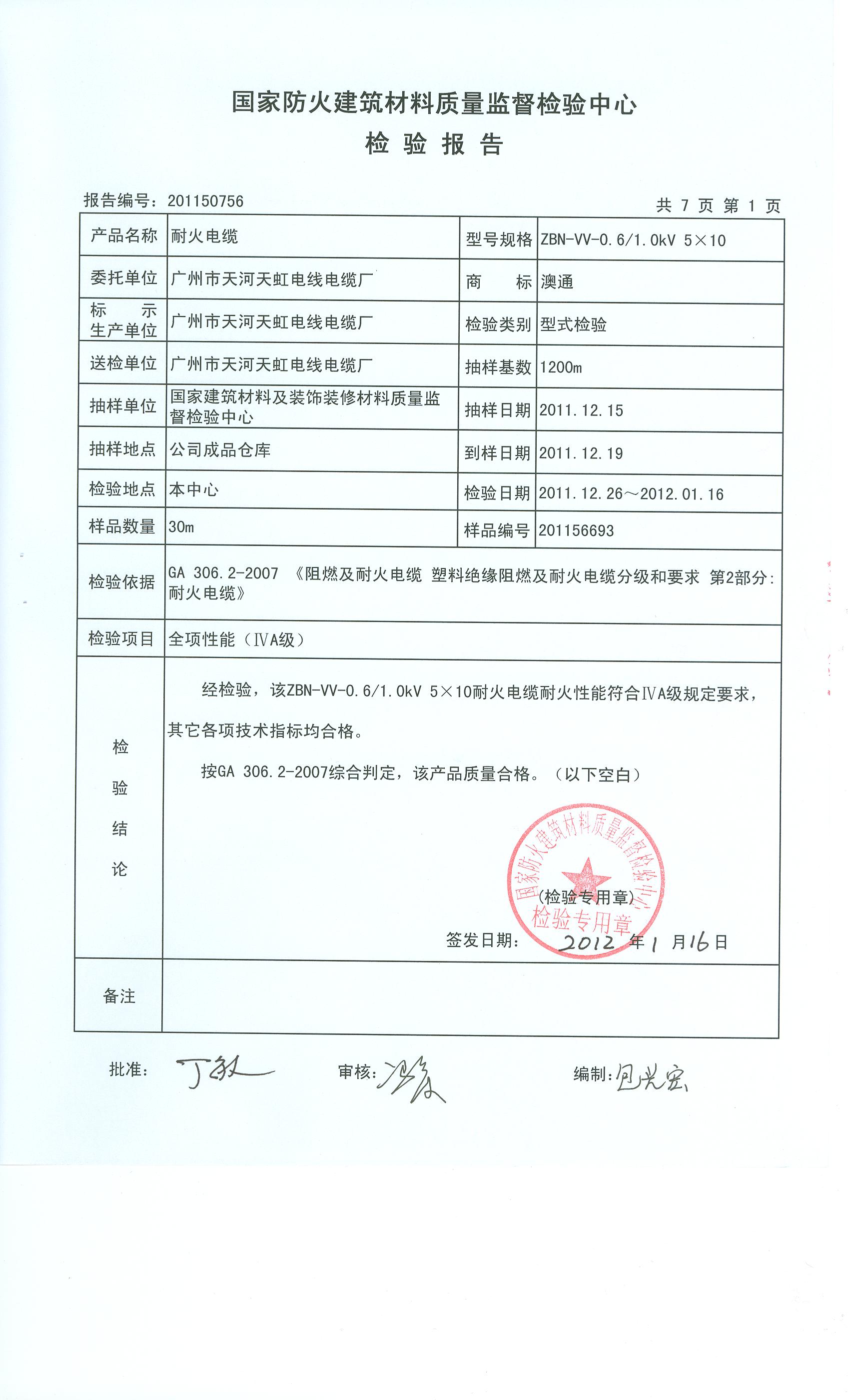 经检验,该ZBN-VV-0.6/1.0kV 5×10耐火电缆耐火性能符合ⅣA级规定要求,其它各项技术指标均合格。 按GA 306.2-2007综合判定,该产品质量合格。(以下空白)