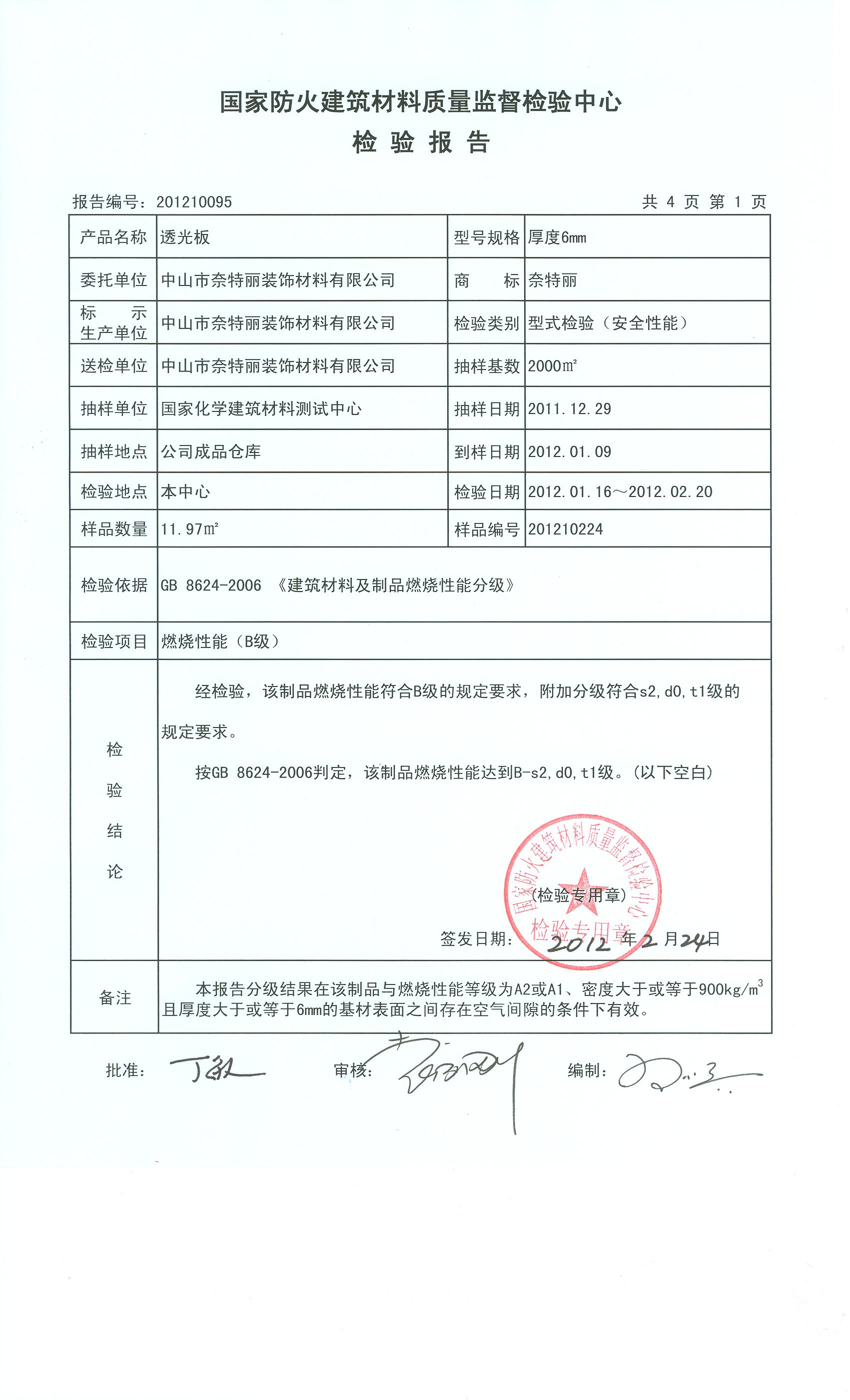 经检验,该制品燃烧性能符合B级的规定要求,附加分级符合s2,d0,t1级的 规定要求。 按GB 8624-2006判定,该制品燃烧性能达到B-s2,d0,t1级。(以下空白)