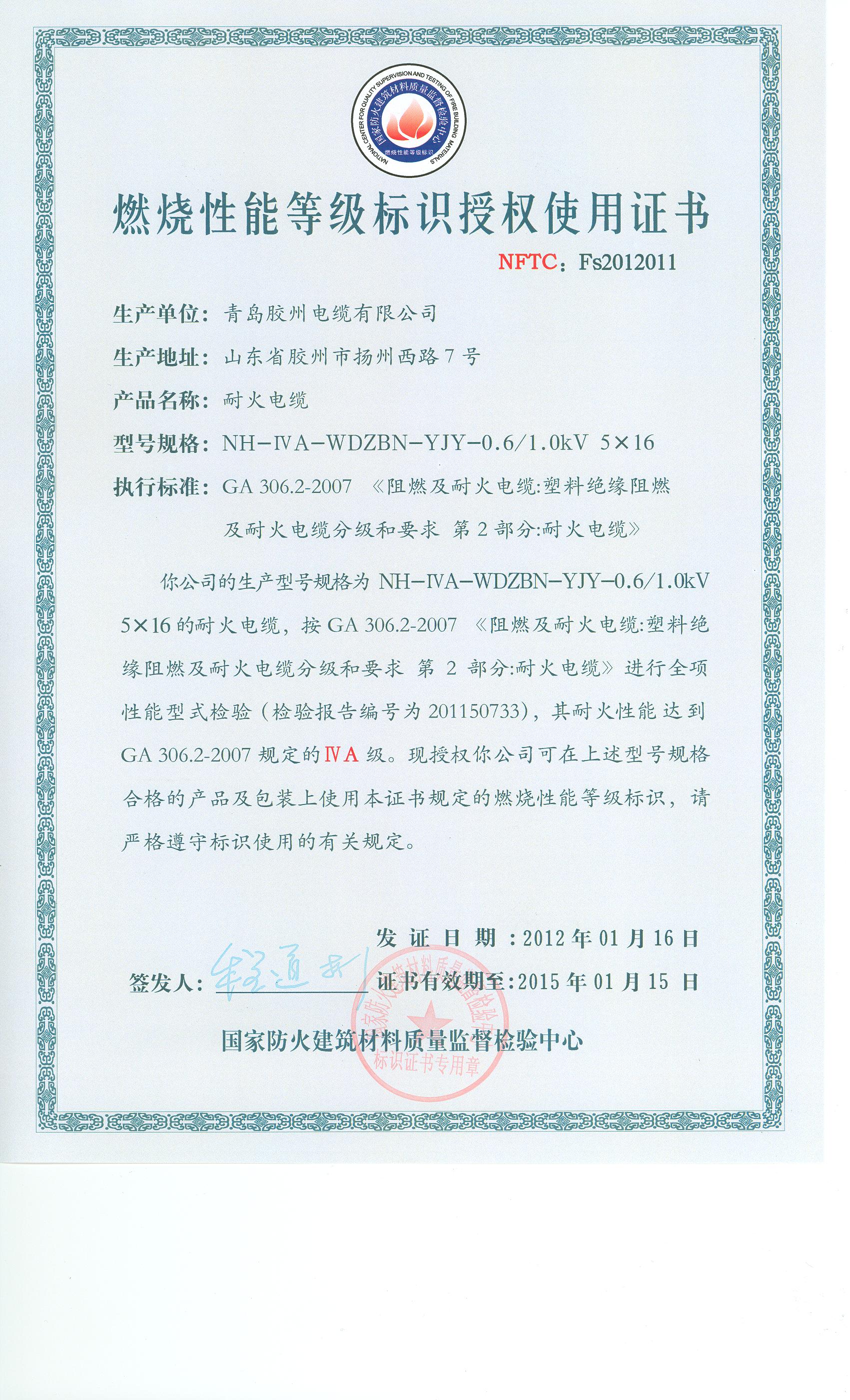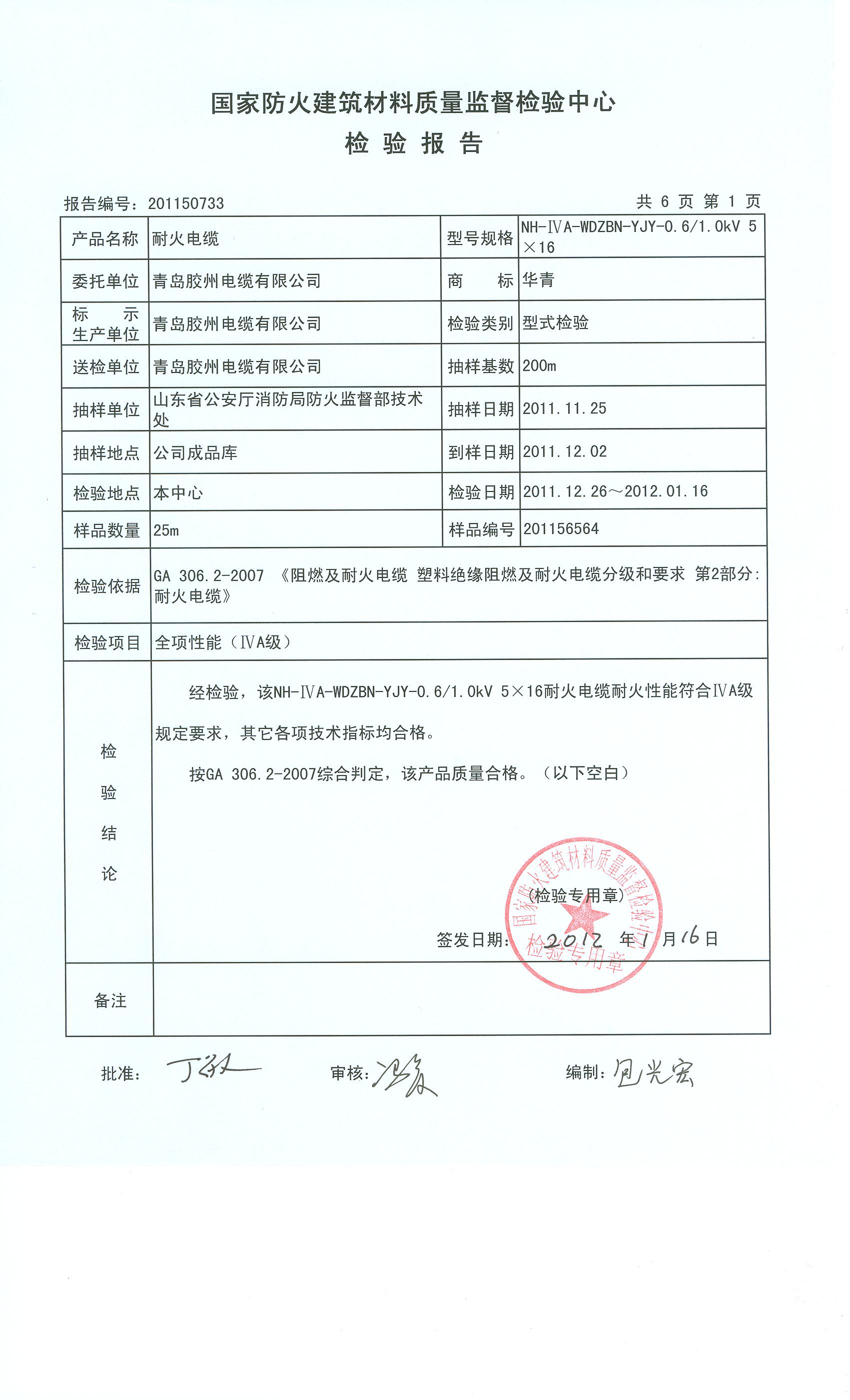 经检验,该NH-ⅣA-WDZBN-YJY-0.6/1.0kV 5×16耐火电缆耐火性能符合ⅣA级规定要求,其它各项技术指标均合格。 按GA 306.2-2007综合判定,该产品质量合格。(以下空白)