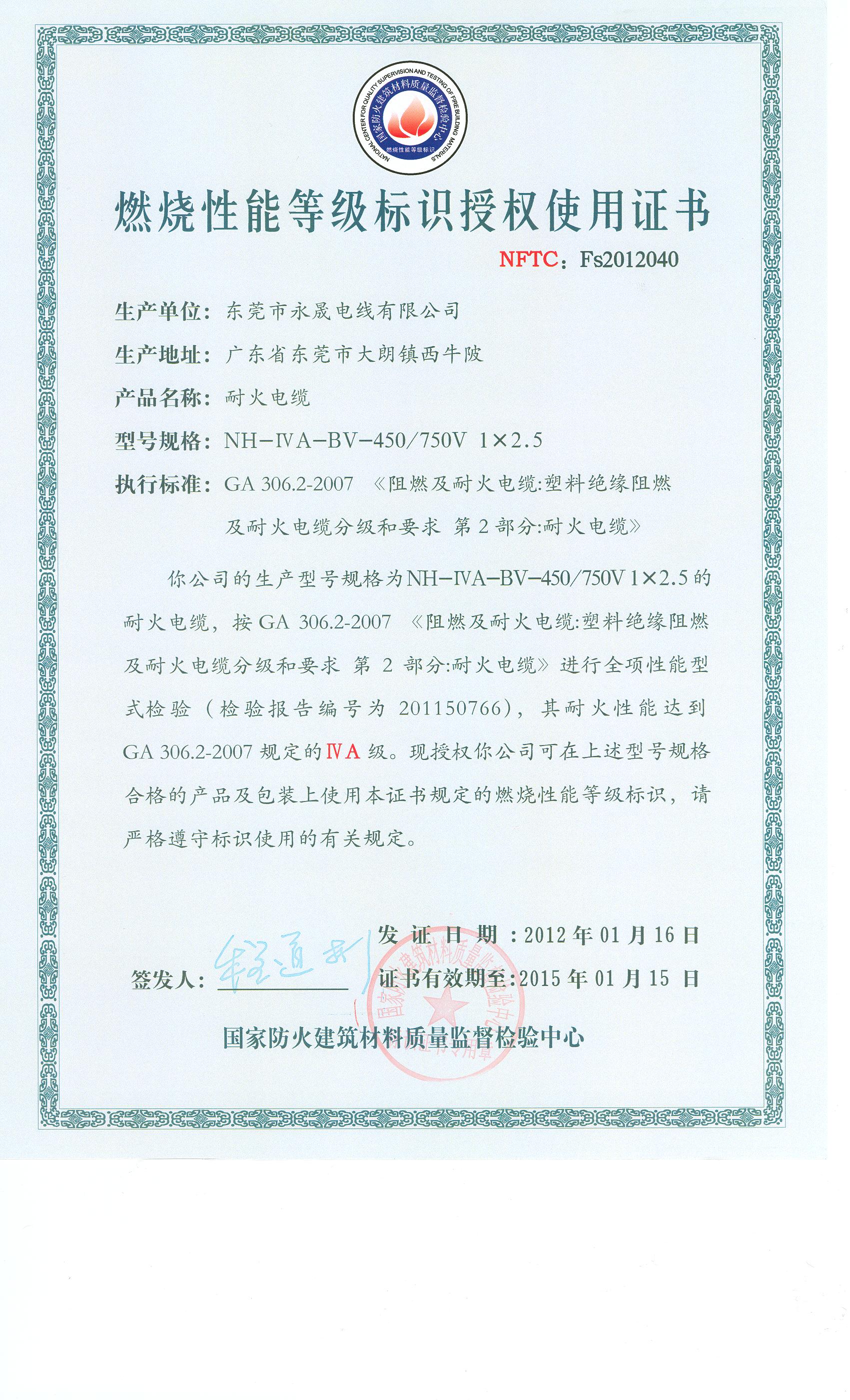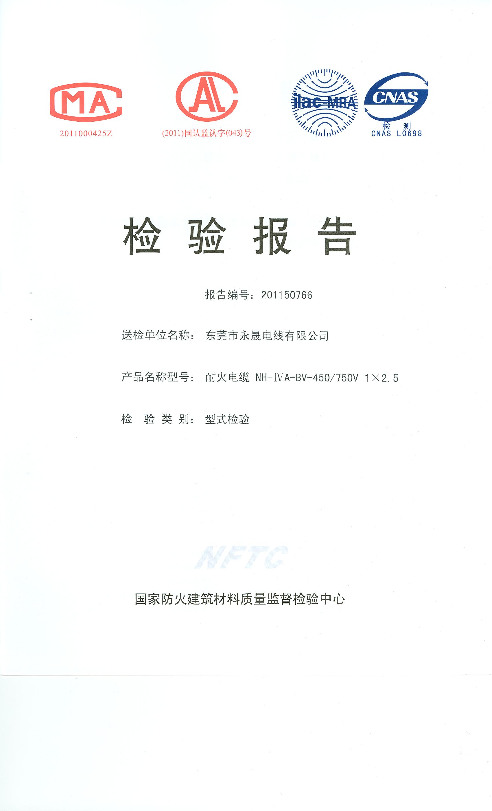 经检验,该NH-ⅣA-BV-450/750V 1×2.5耐火电缆耐火性能符合ⅣA级规定要求,其它各项技术指标均合格。 按GA 306.2-2007综合判定,该产品质量合格。(以下空白)