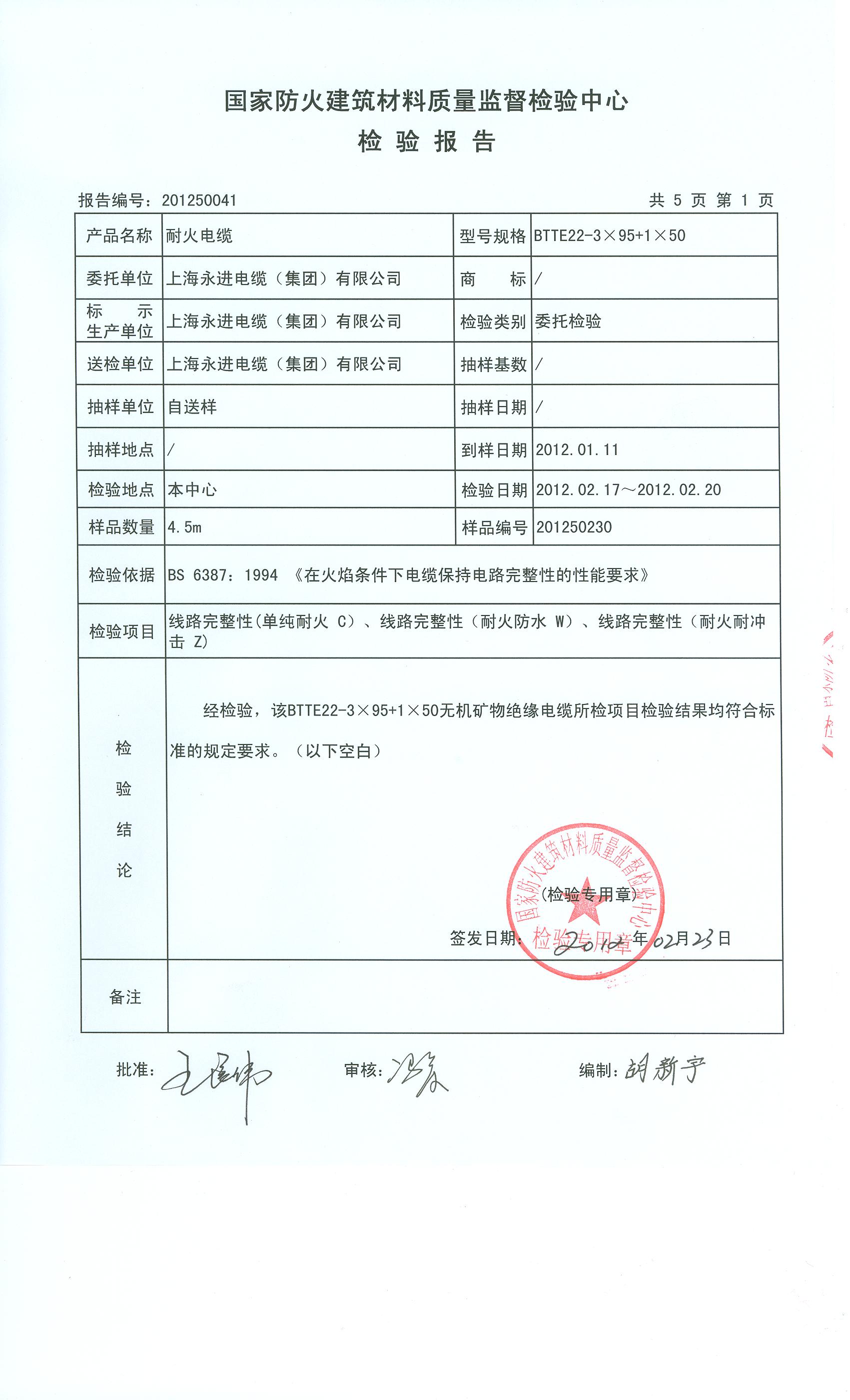 经检验,该BTTE22-3×95+1×50无机矿物绝缘电缆所检项目检验结果均符合标准的规定要求。(以下空白)