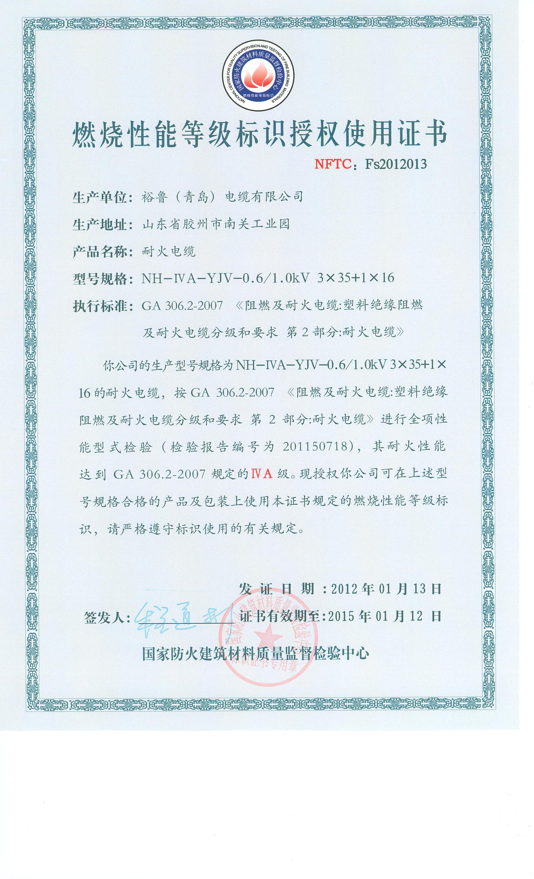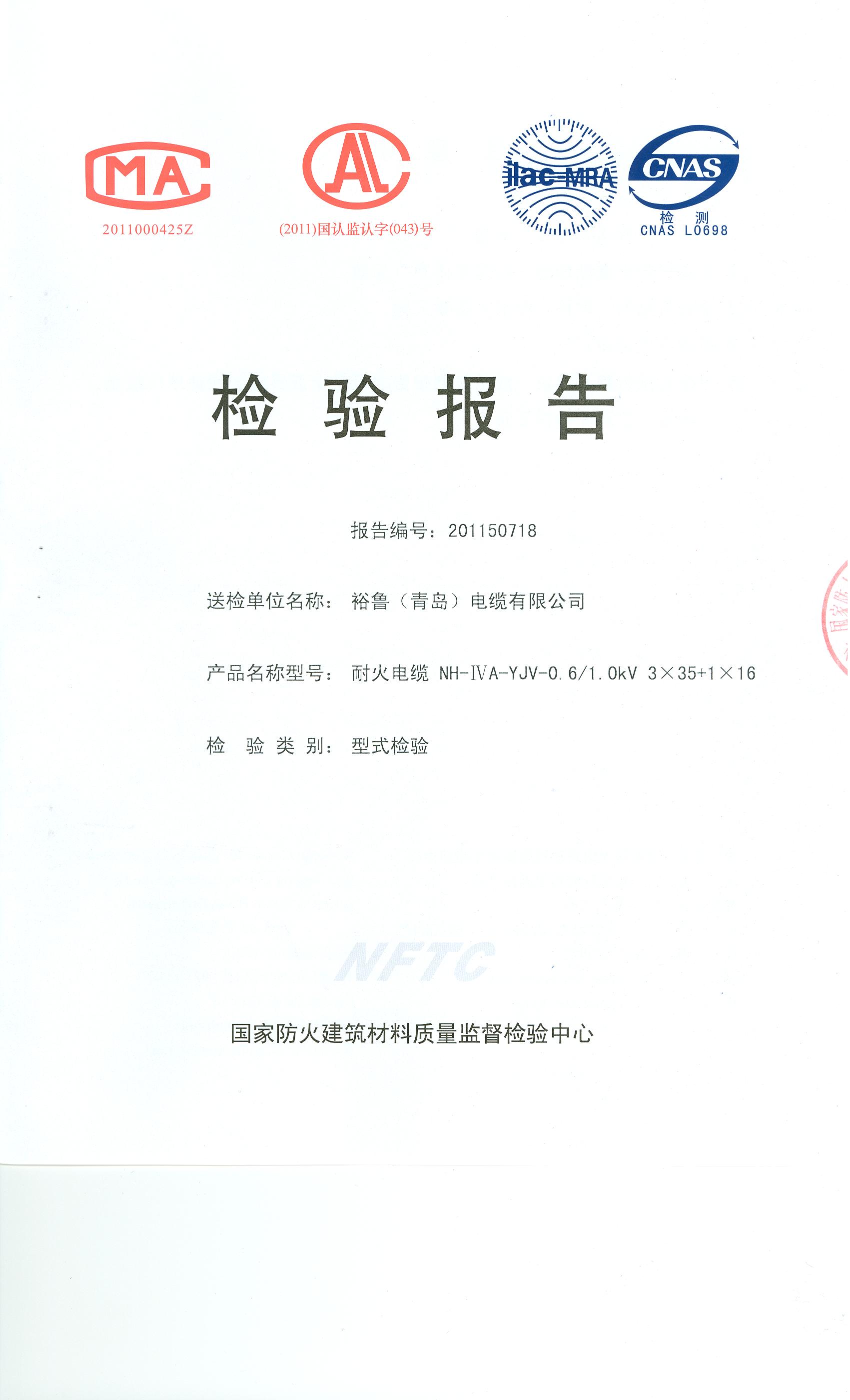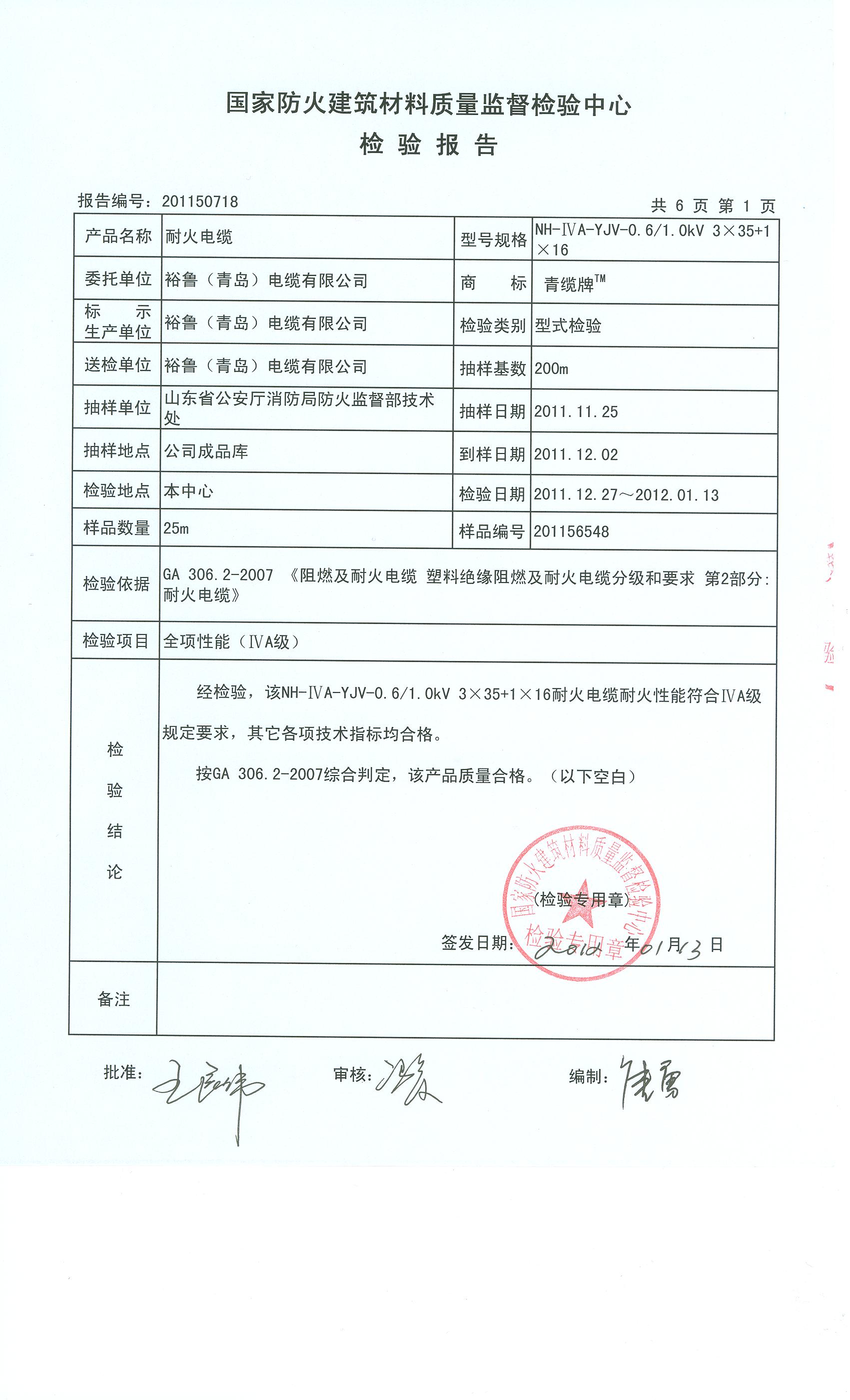 经检验,该NH-ⅣA-YJV-0.6/1.0kV 3×35+1×16耐火电缆耐火性能符合ⅣA级规定要求,其它各项技术指标均合格。 按GA 306.2-2007综合判定,该产品质量合格。(以下空白)
