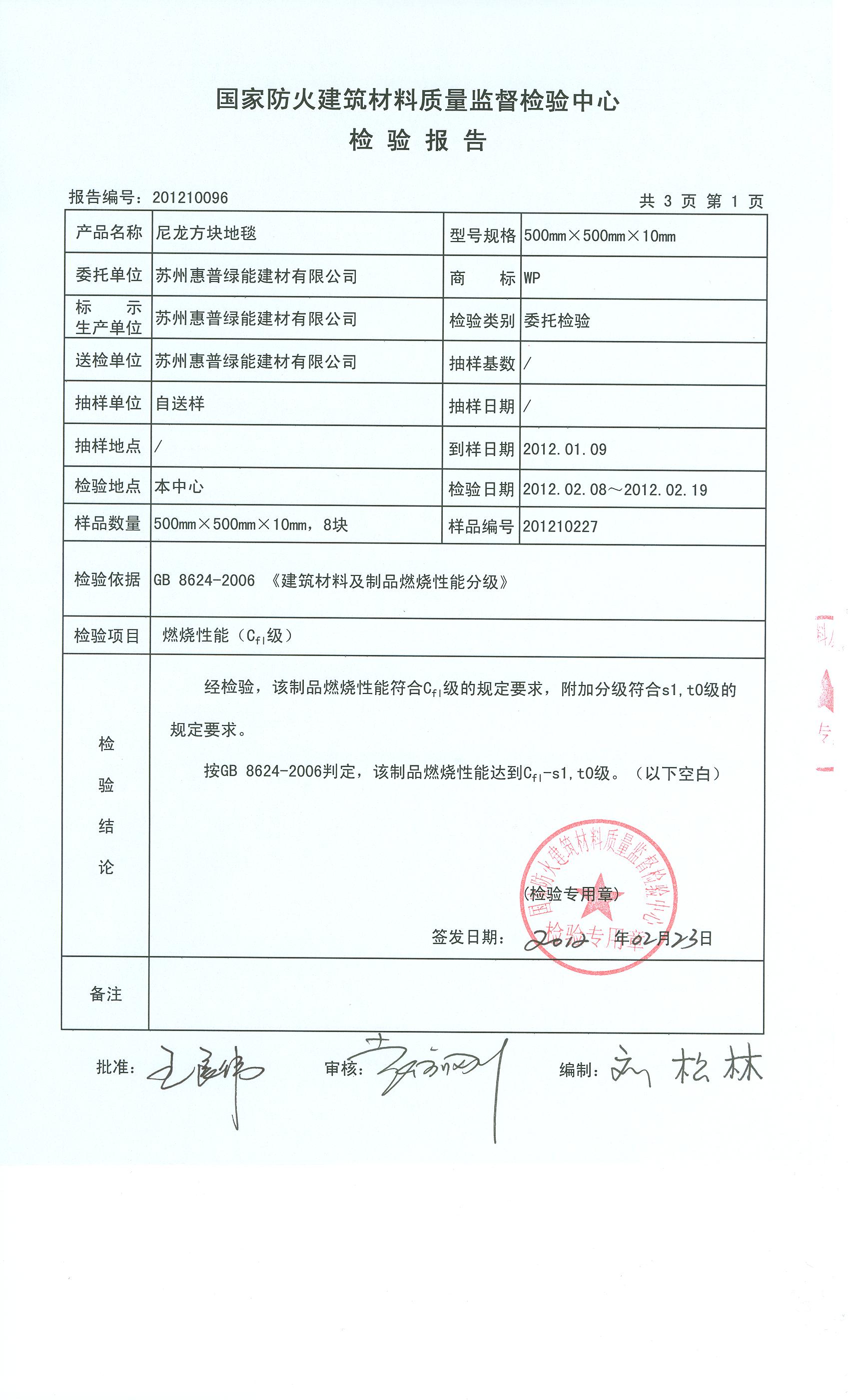 经检验,该制品燃烧性能符合C_(fl)级的规定要求,附加分级符合s1,t0级的 规定要求。 按GB 8624-2006判定,该制品燃烧性能达到C_(fl)-s1,t0级。(以下空白)