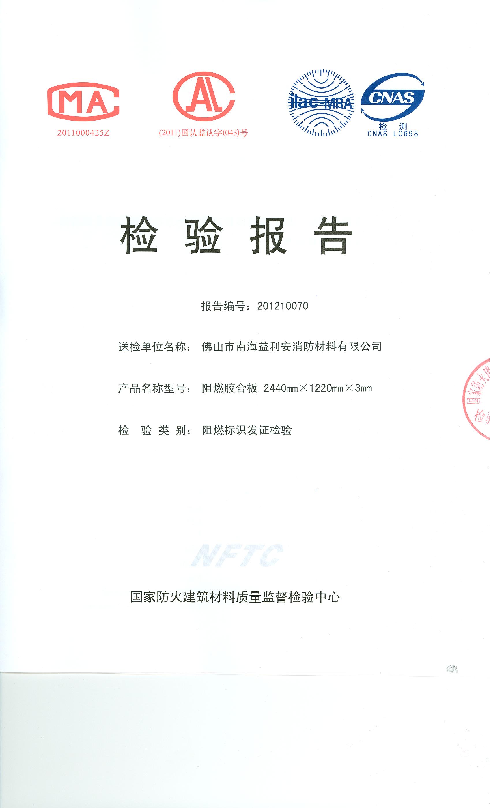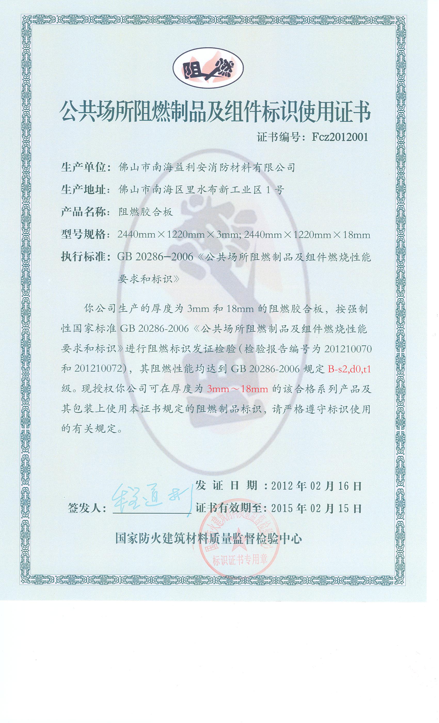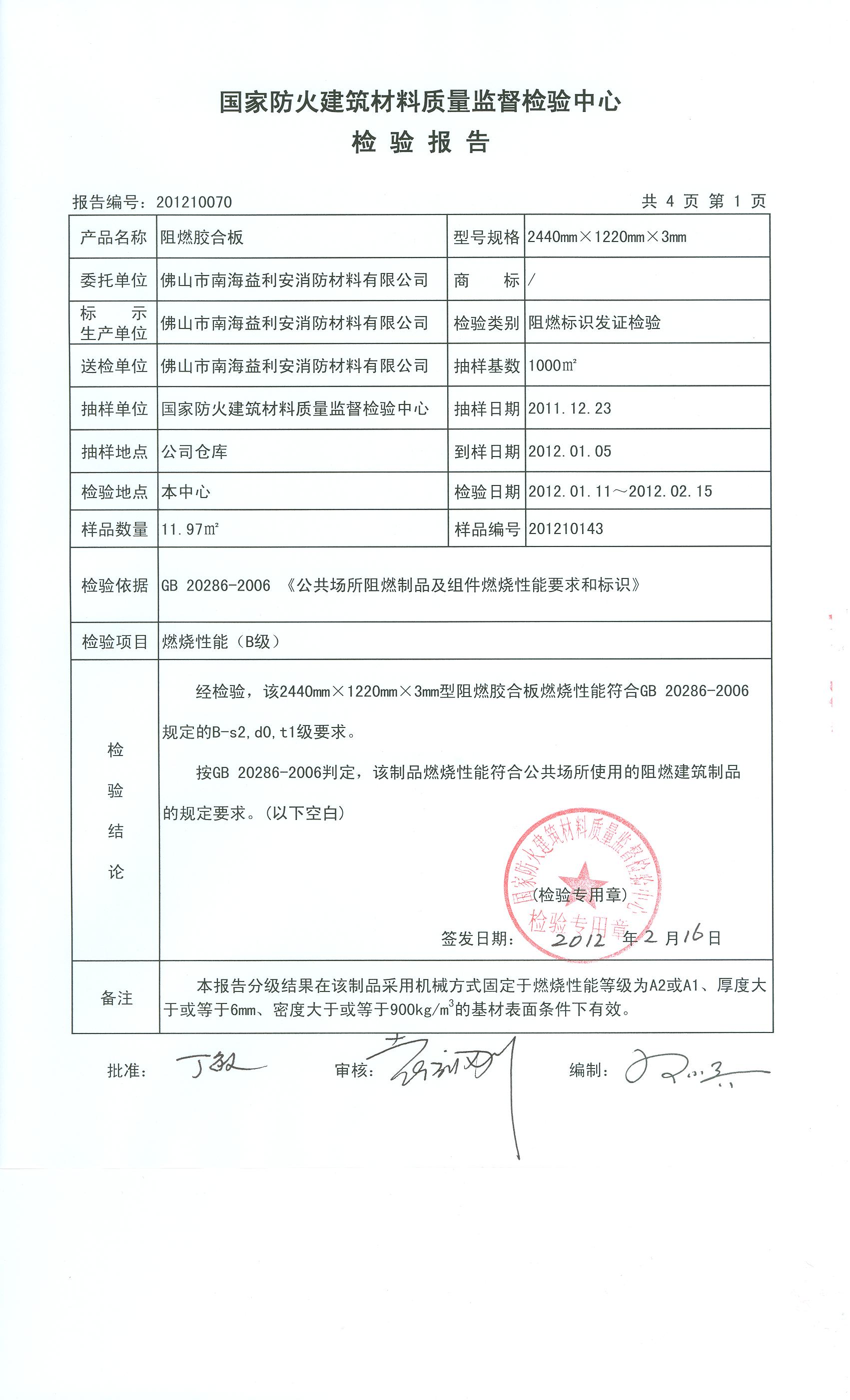 经检验,该2440mm×1220mm×3mm型阻燃胶合板燃烧性能符合GB 20286-2006规定的B-s2,d0,t1级要求。 按GB 20286-2006判定,该制品燃烧性能符合公共场所使用的阻燃建筑制品的规定要求。(以下空白)
