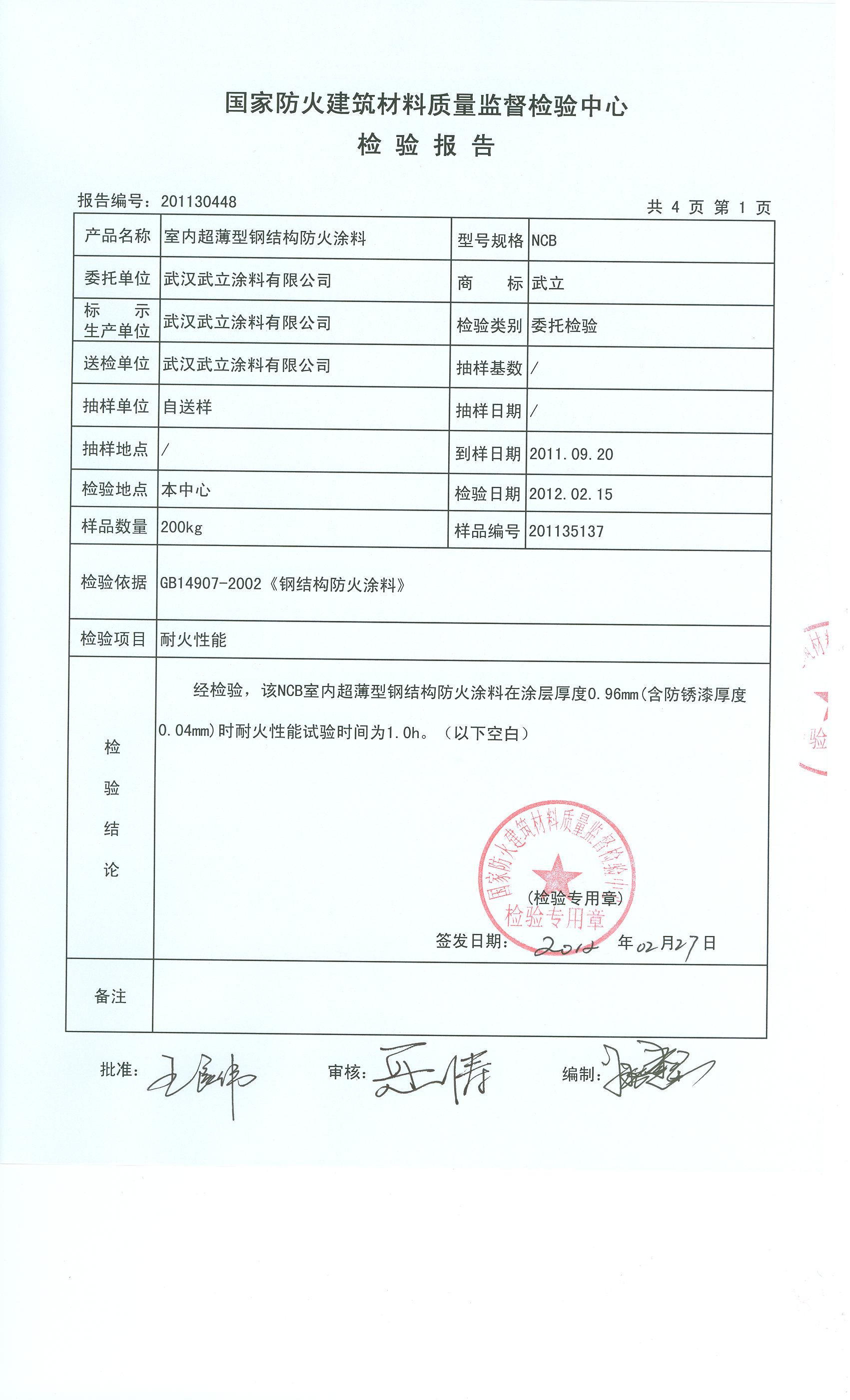 经检验,该NCB室内超薄型钢结构防火涂料在涂层厚度0.96mm(含防锈漆厚度0.04mm)时耐火性能试验时间为1.0h。(以下空白)