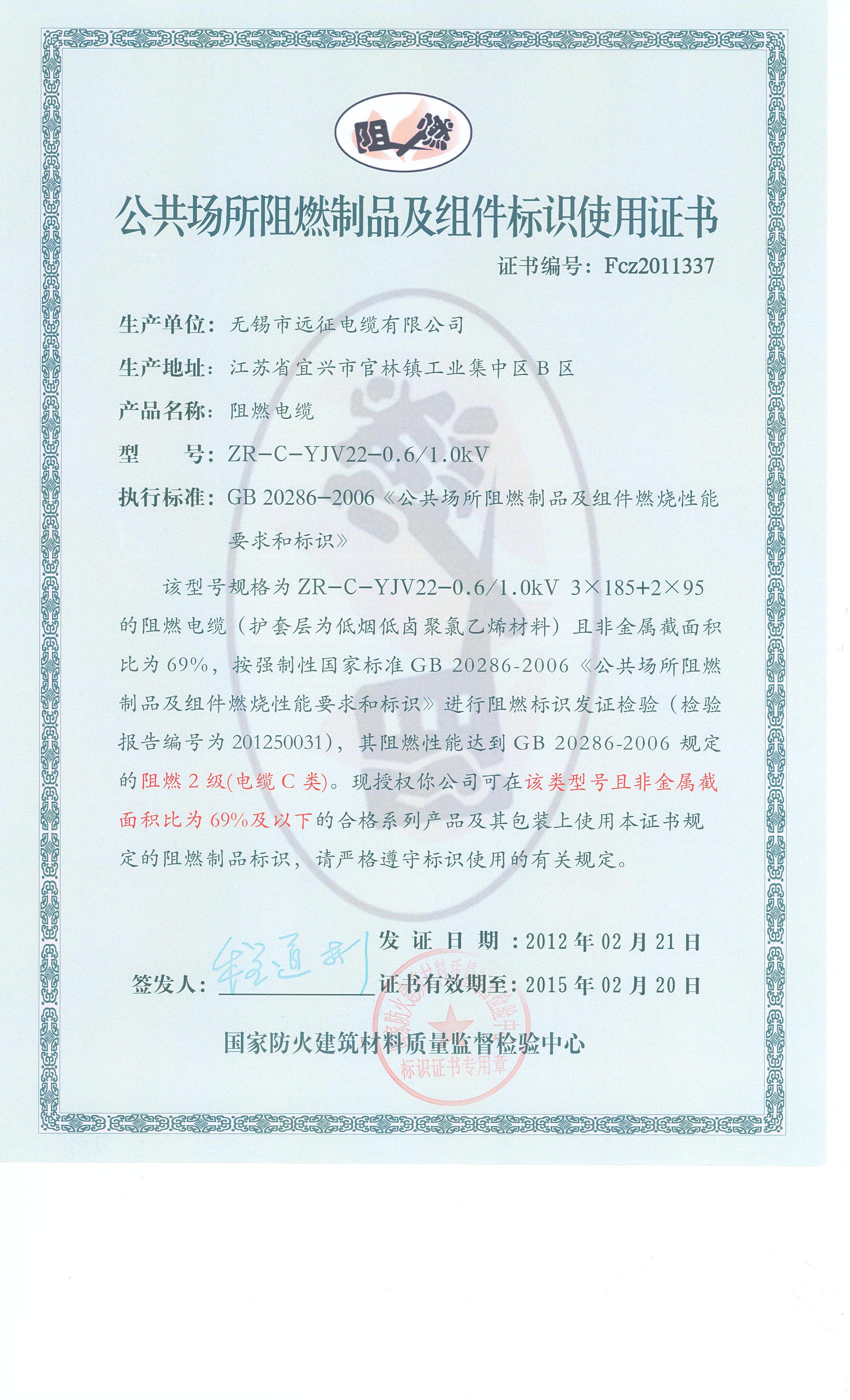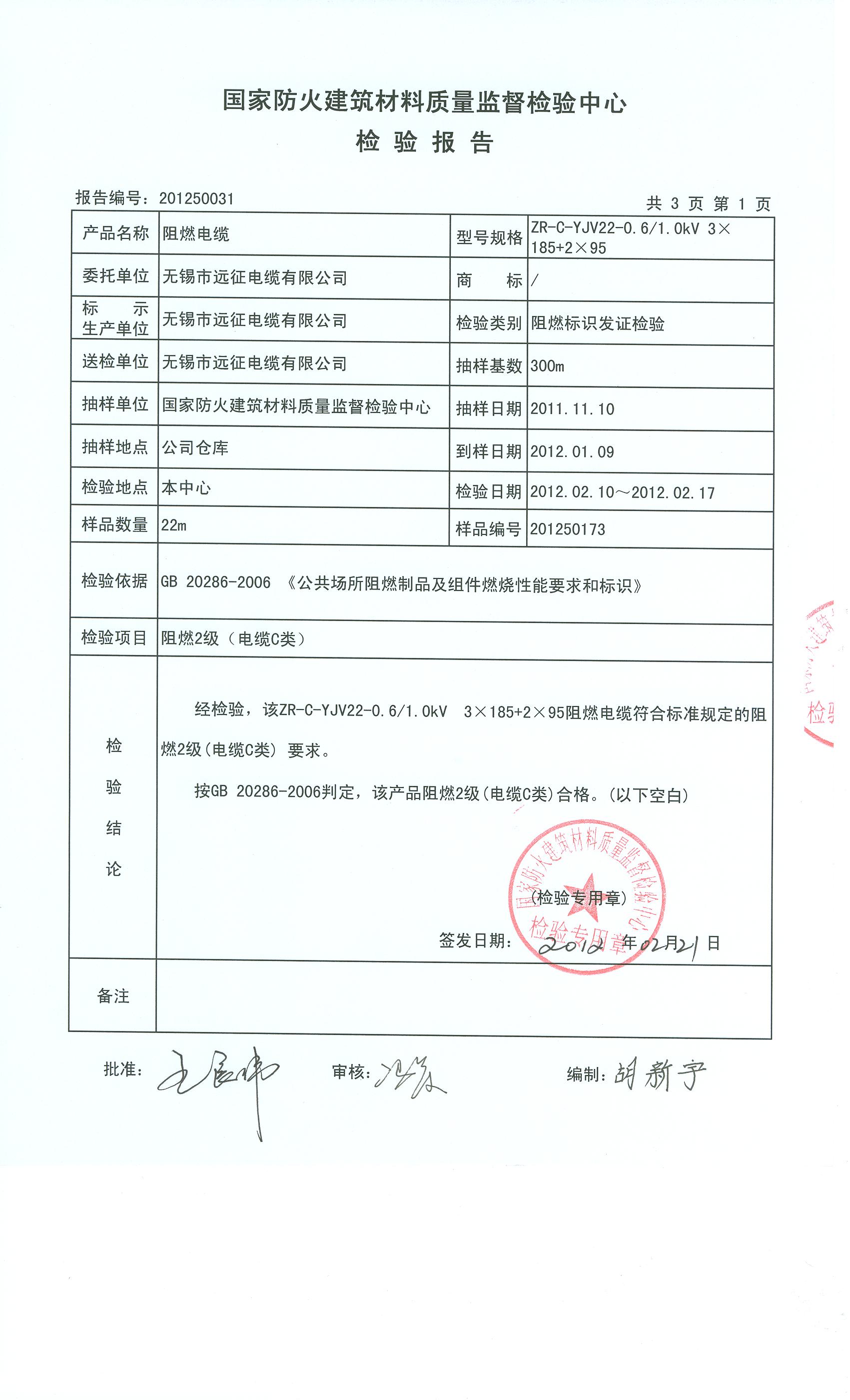 经检验,该ZR-C-YJV22-0.6/1.0kV 3×185+2×95阻燃电缆符合标准规定的阻燃2级(电缆C类) 要求。 按GB 20286-2006判定,该产品阻燃2级(电缆C类)合格。(以下空白)