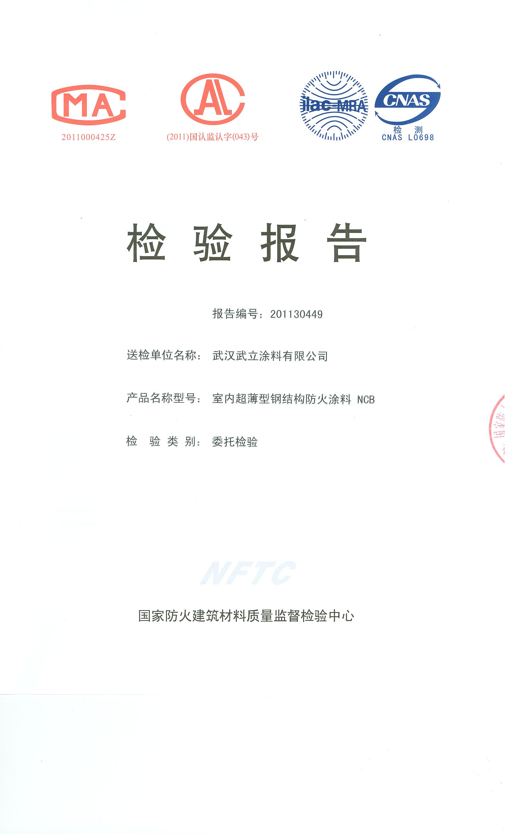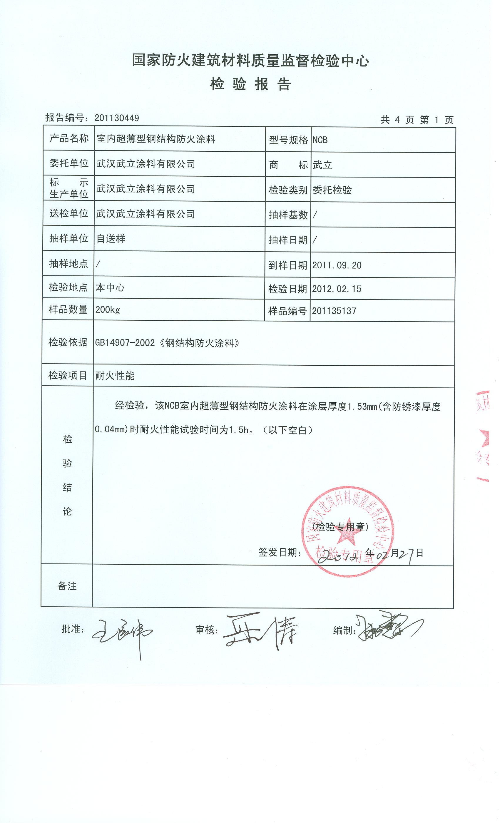 经检验,该NCB室内超薄型钢结构防火涂料在涂层厚度1.53mm(含防锈漆厚度0.04mm)时耐火性能试验时间为1.5h。(以下空白)