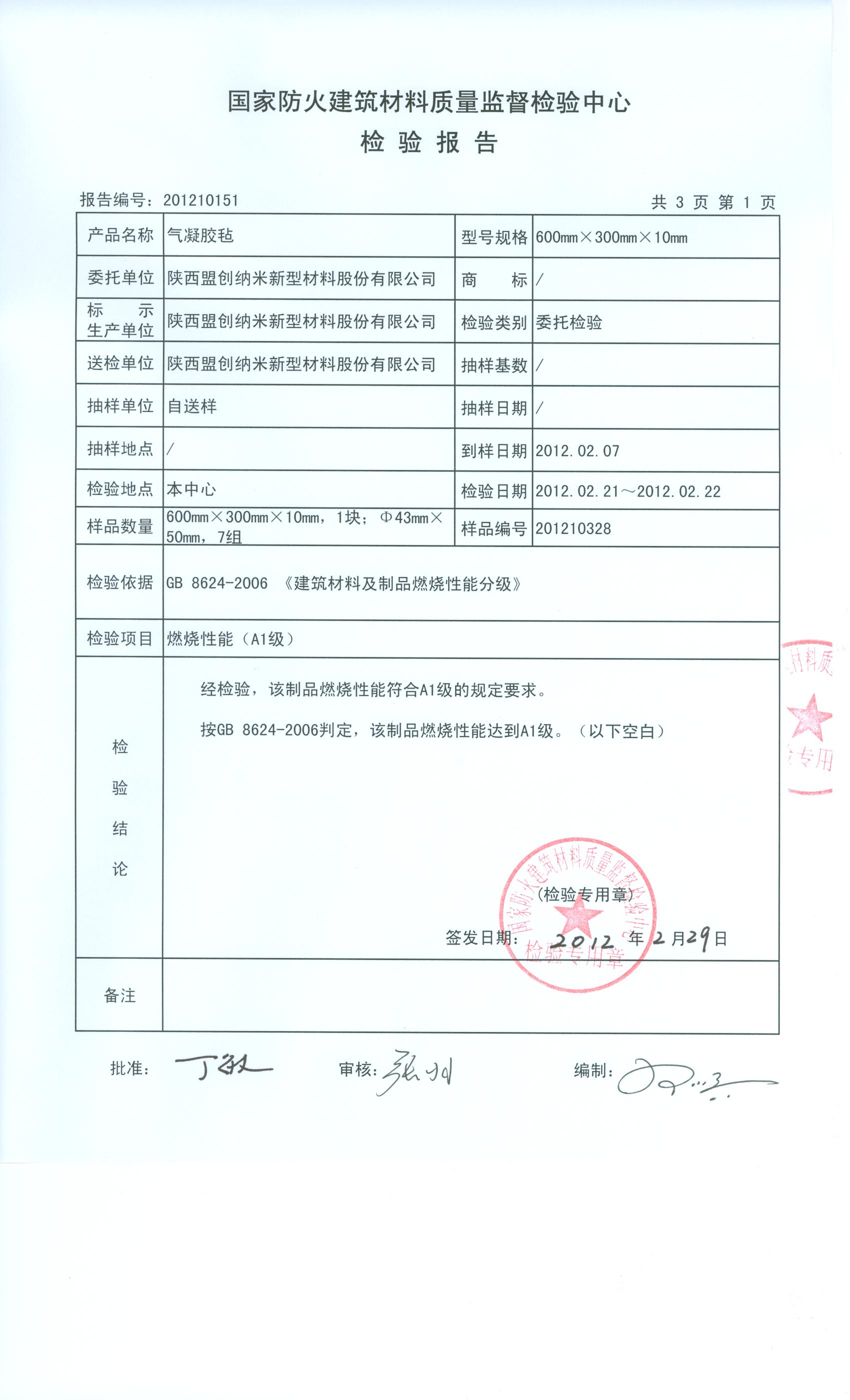 经检验,该制品燃烧性能符合A1级的规定要求。 按GB 8624-2006判定,该制品燃烧性能达到A1级。(以下空白)