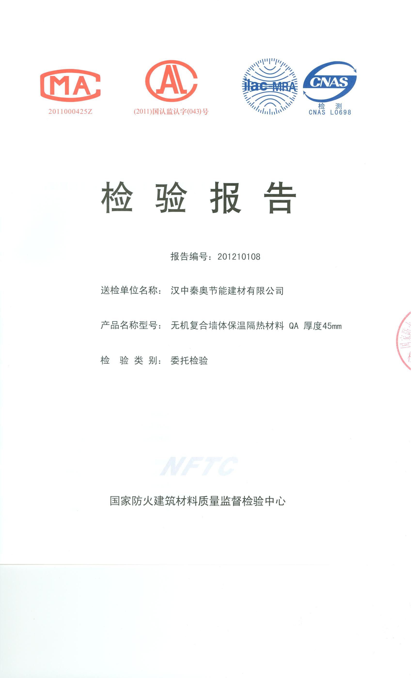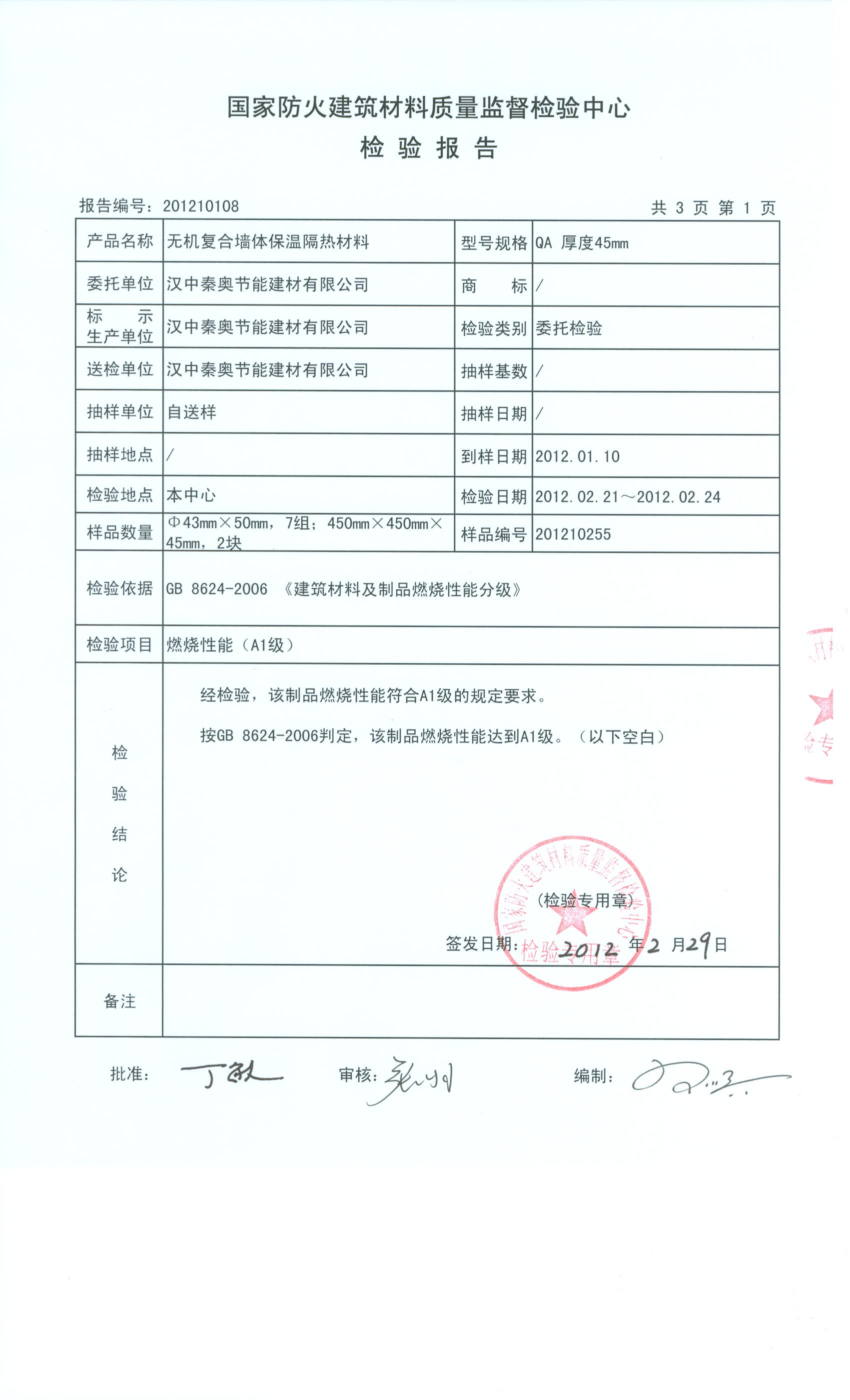 经检验,该制品燃烧性能符合A1级的规定要求。 按GB 8624-2006判定,该制品燃烧性能达到A1级。(以下空白)