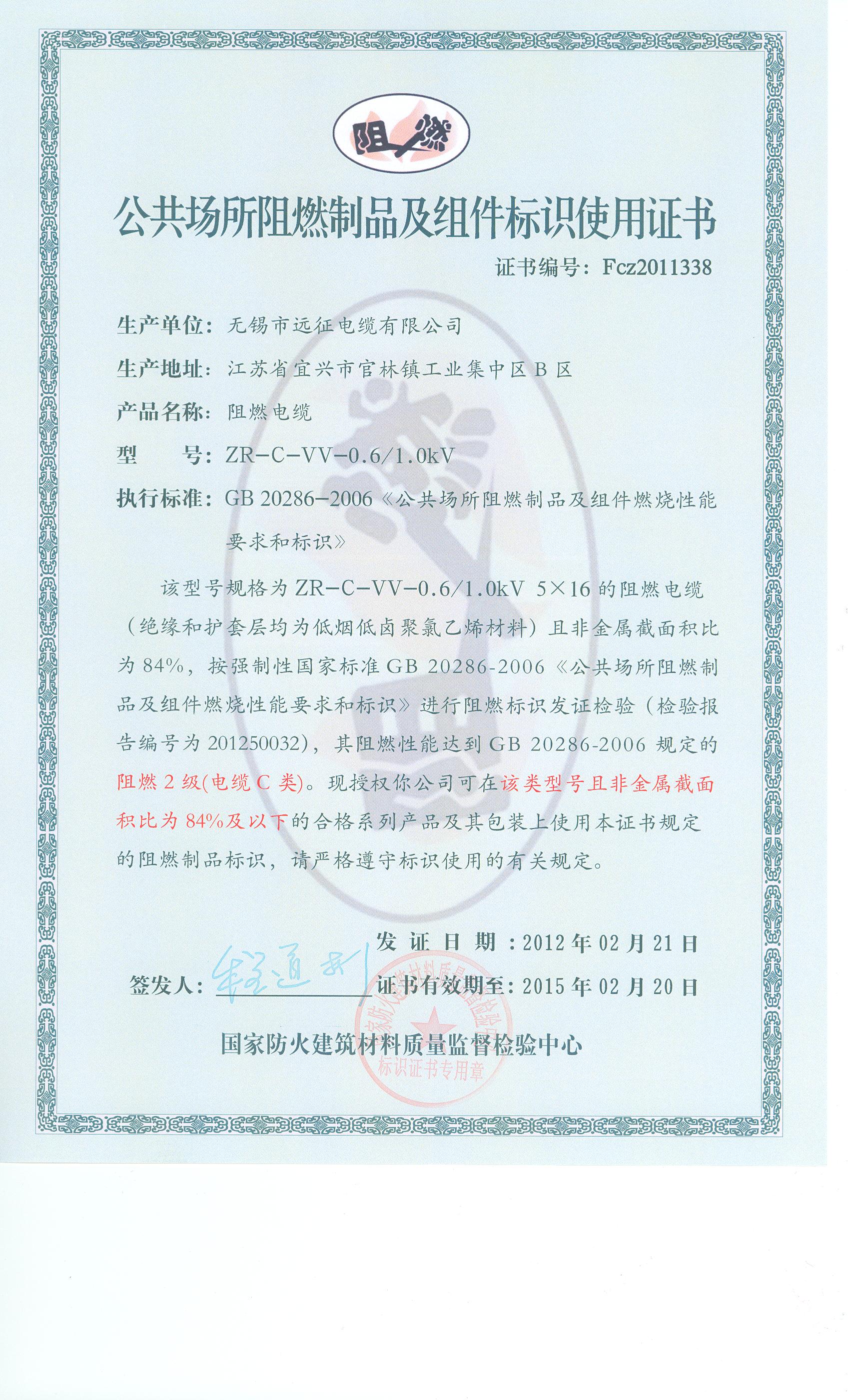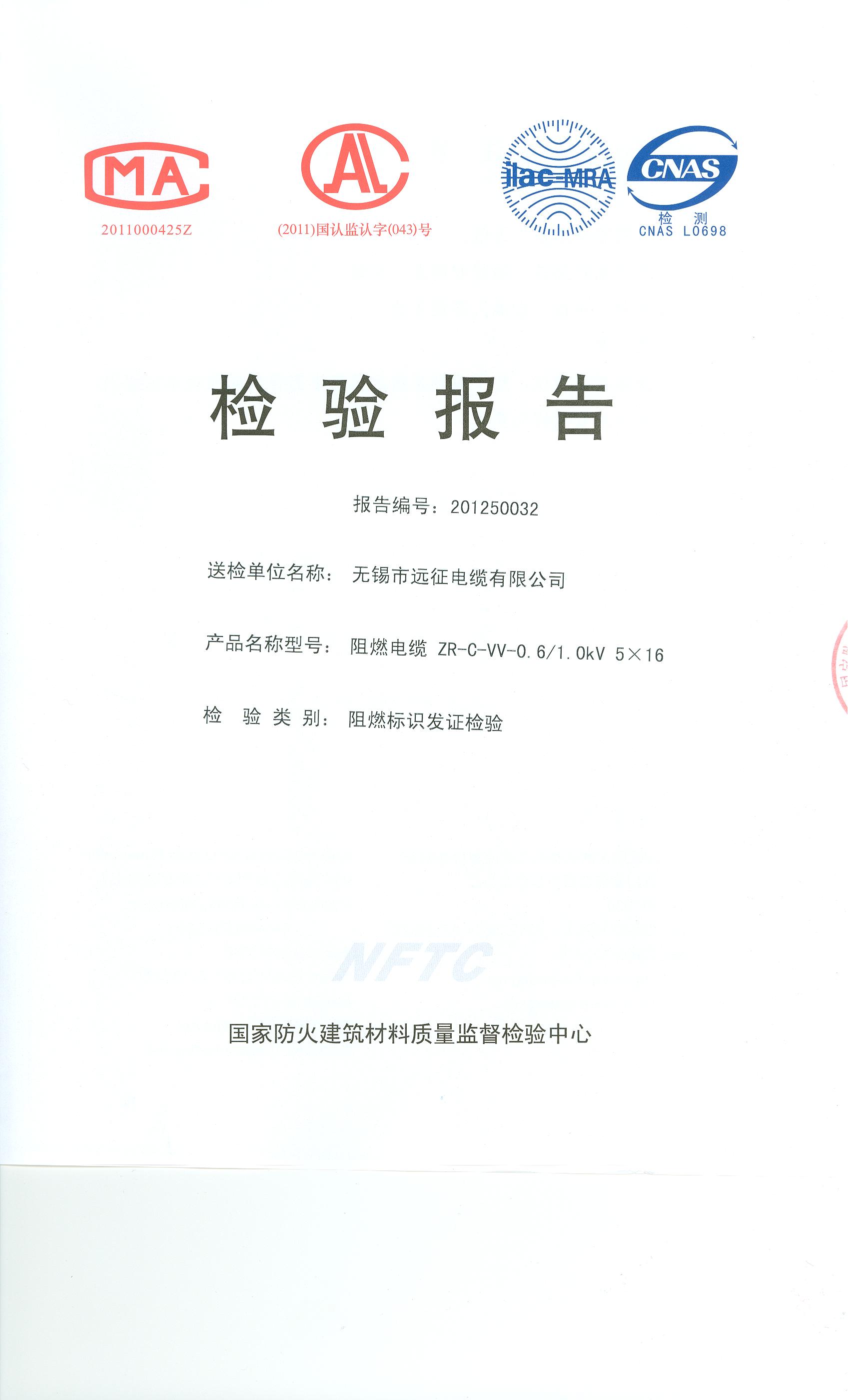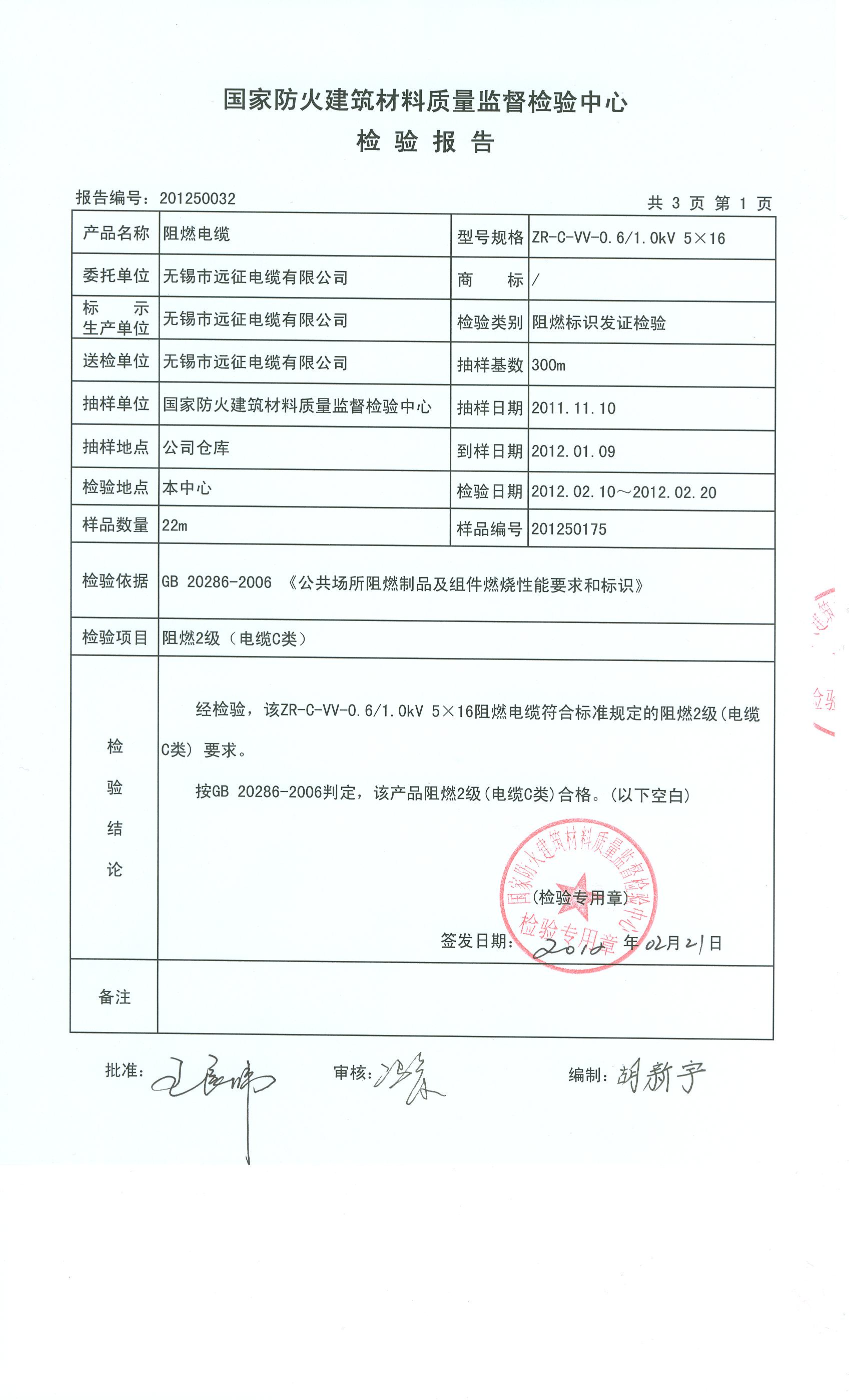 经检验,该ZR-C-VV-0.6/1.0kV 5×16阻燃电缆符合标准规定的阻燃2级(电缆C类) 要求。 按GB 20286-2006判定,该产品阻燃2级(电缆C类)合格。(以下空白)