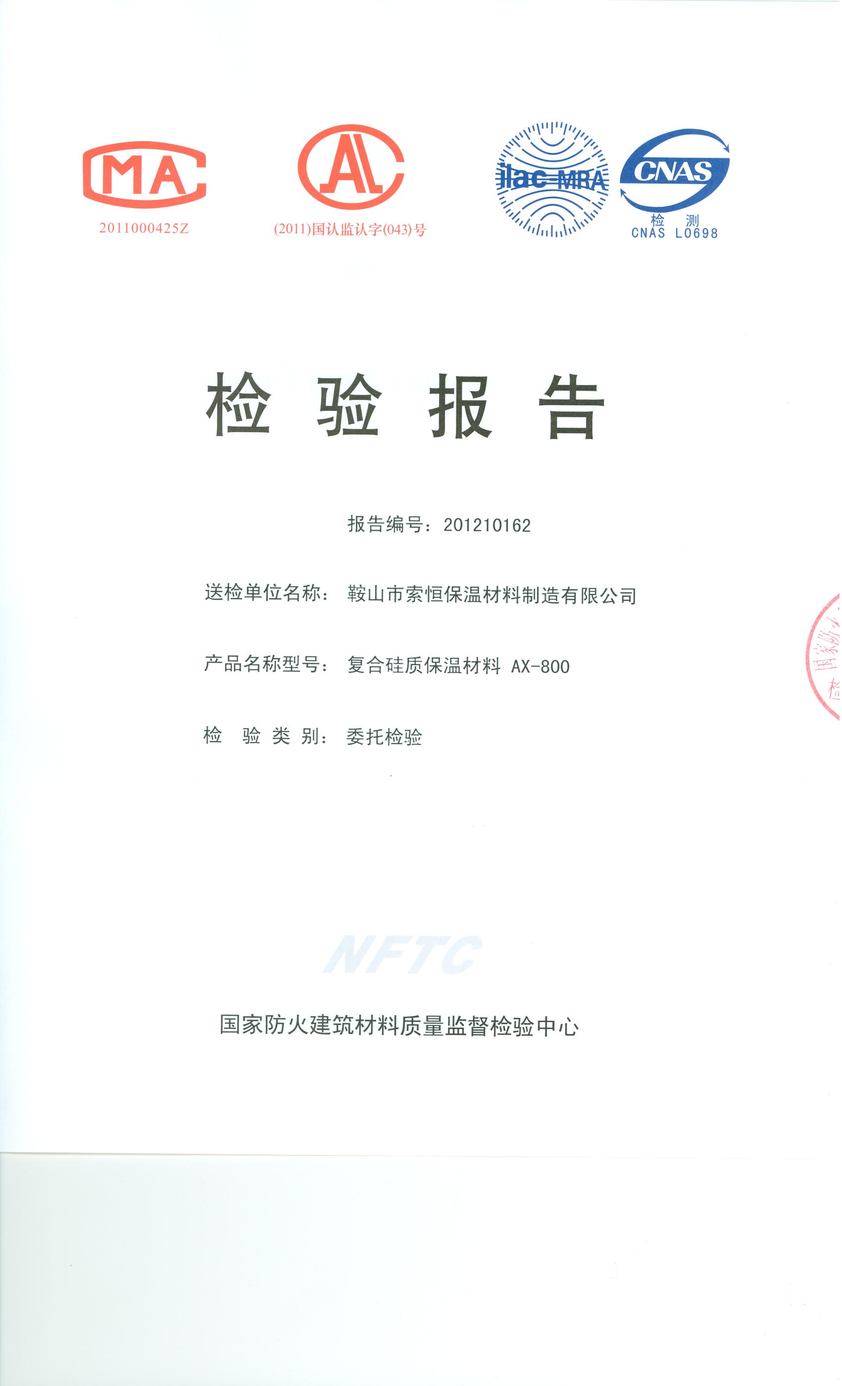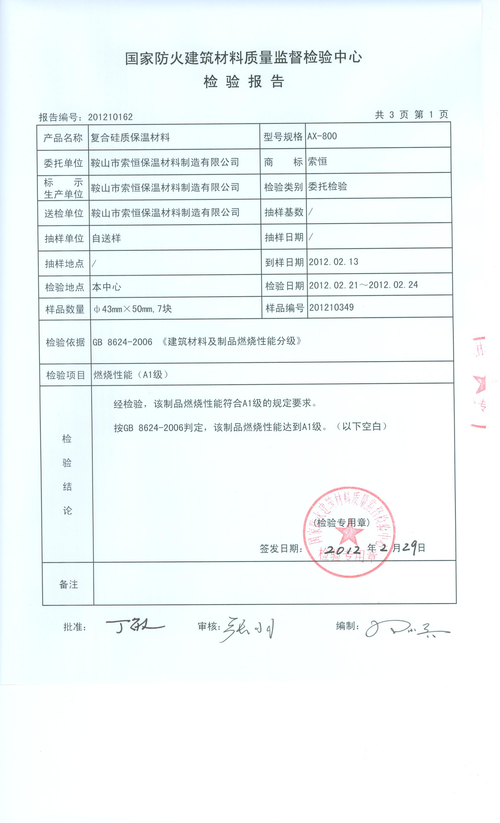 经检验,该制品燃烧性能符合A1级的规定要求。 按GB 8624-2006判定,该制品燃烧性能达到A1级。(以下空白)