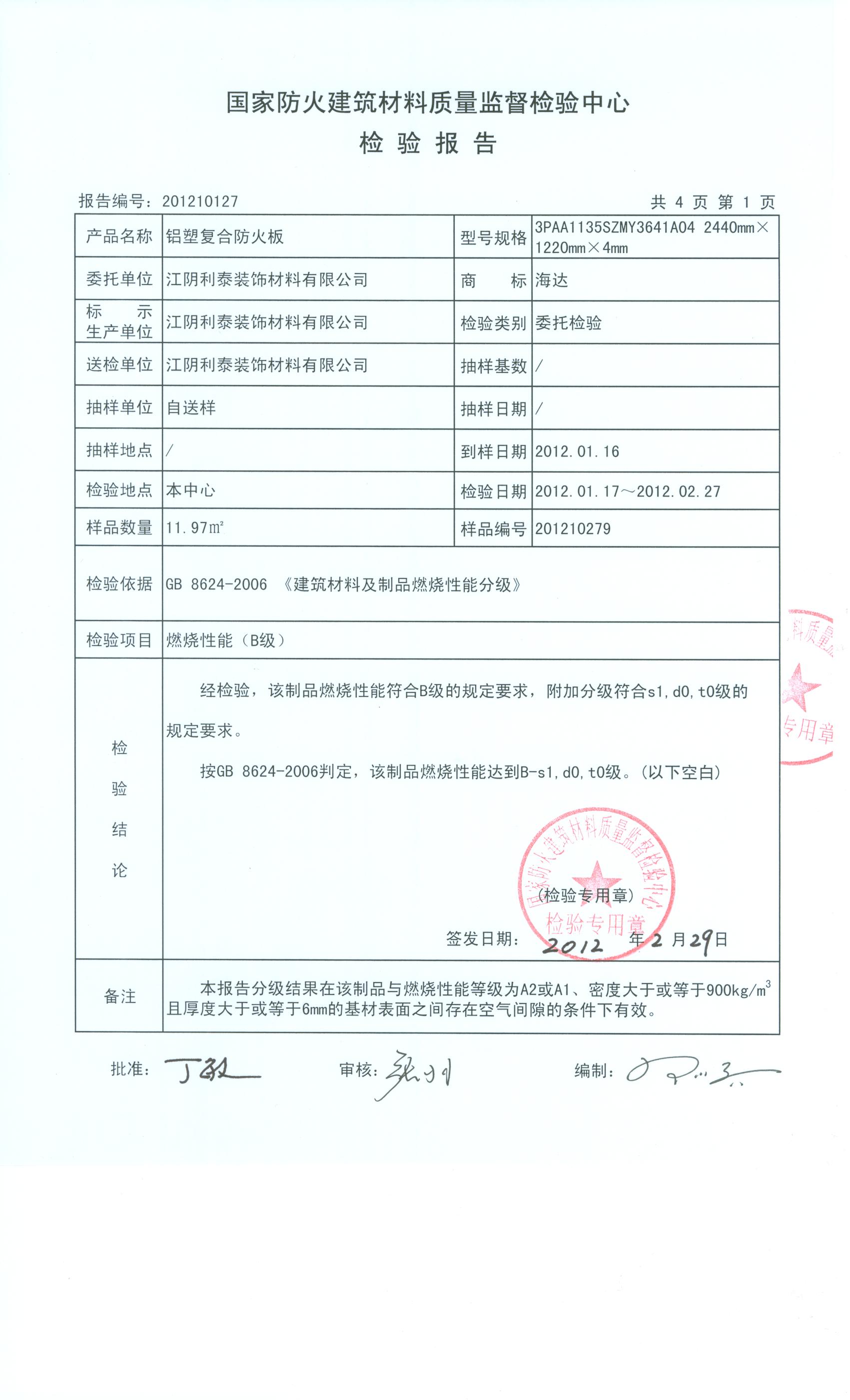 经检验,该制品燃烧性能符合B级的规定要求,附加分级符合s1,d0,t0级的 规定要求。 按GB 8624-2006判定,该制品燃烧性能达到B-s1,d0,t0级。(以下空白)