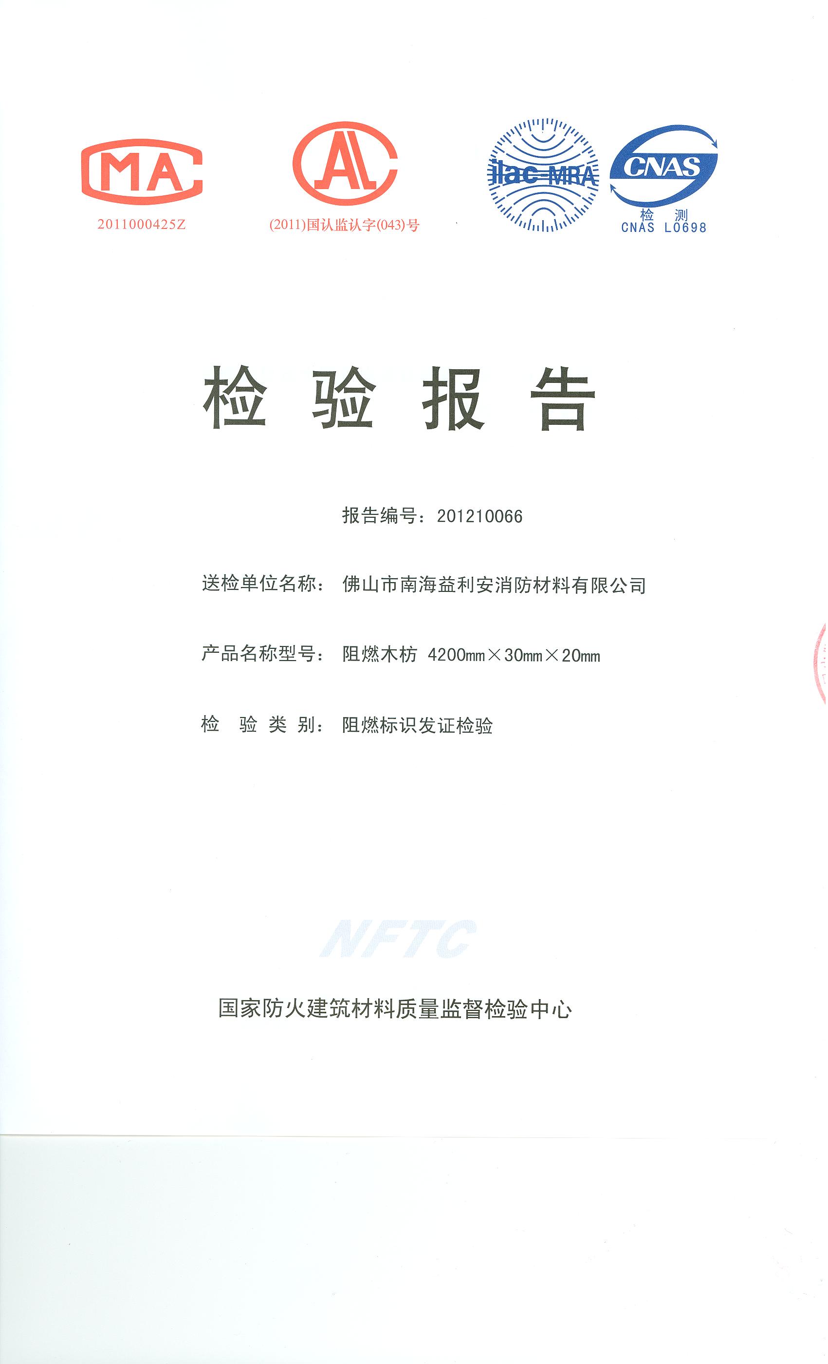 经检验,该4200mm×30mm×20mm型阻燃木枋燃烧性能符合GB 20286-2006规定的B-s1,d0,t1级要求。 按GB 20286-2006判定,该制品燃烧性能符合公共场所使用的阻燃建筑制品的规定要求。(以下空白)