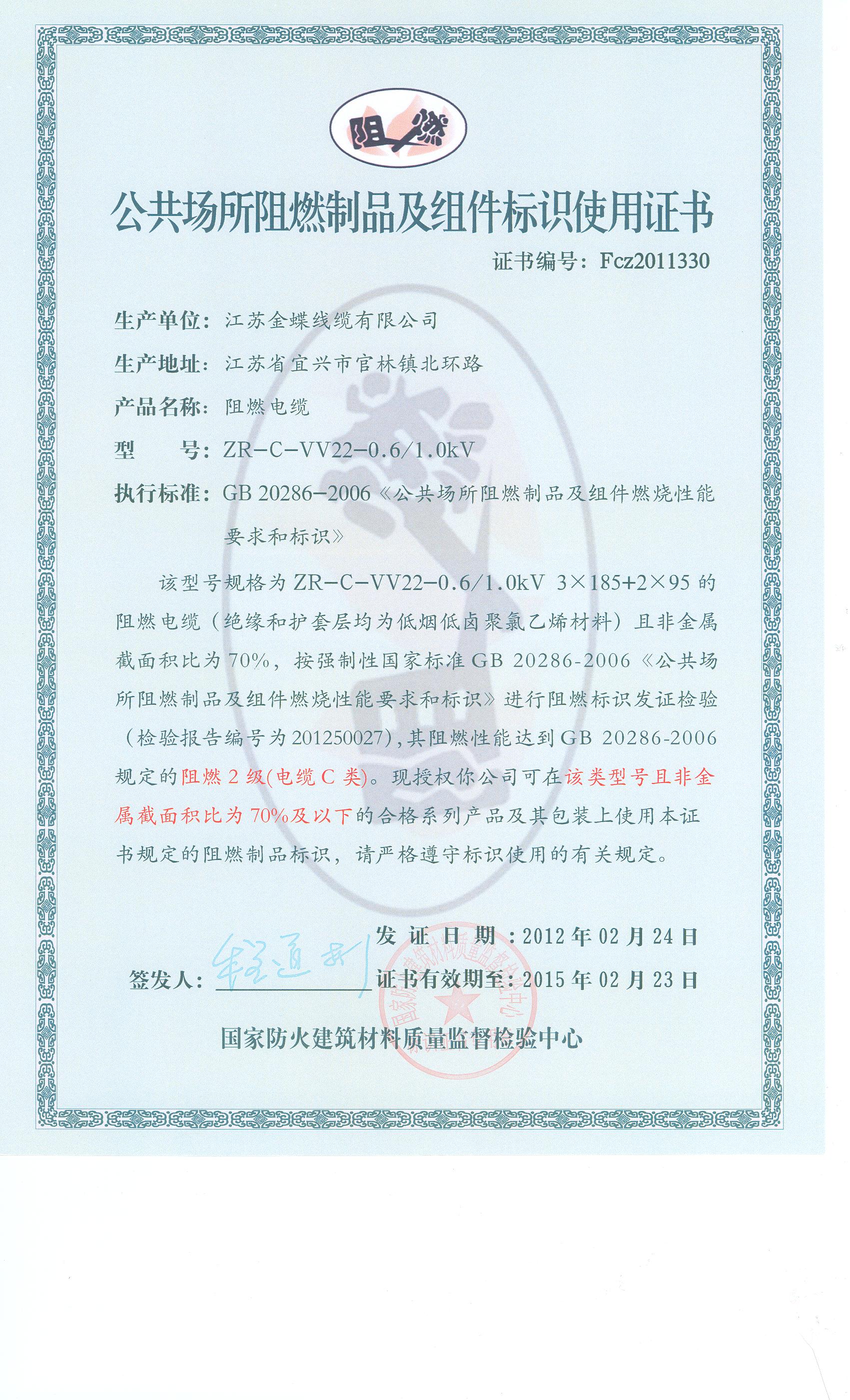 经检验,该ZR-C-VV22-0.6/1.0kV 3×185+2×95阻燃电缆符合标准规定的阻燃2级(电缆C类) 要求。 按GB 20286-2006判定,该产品阻燃2级(电缆C类)合格。(以下空白)