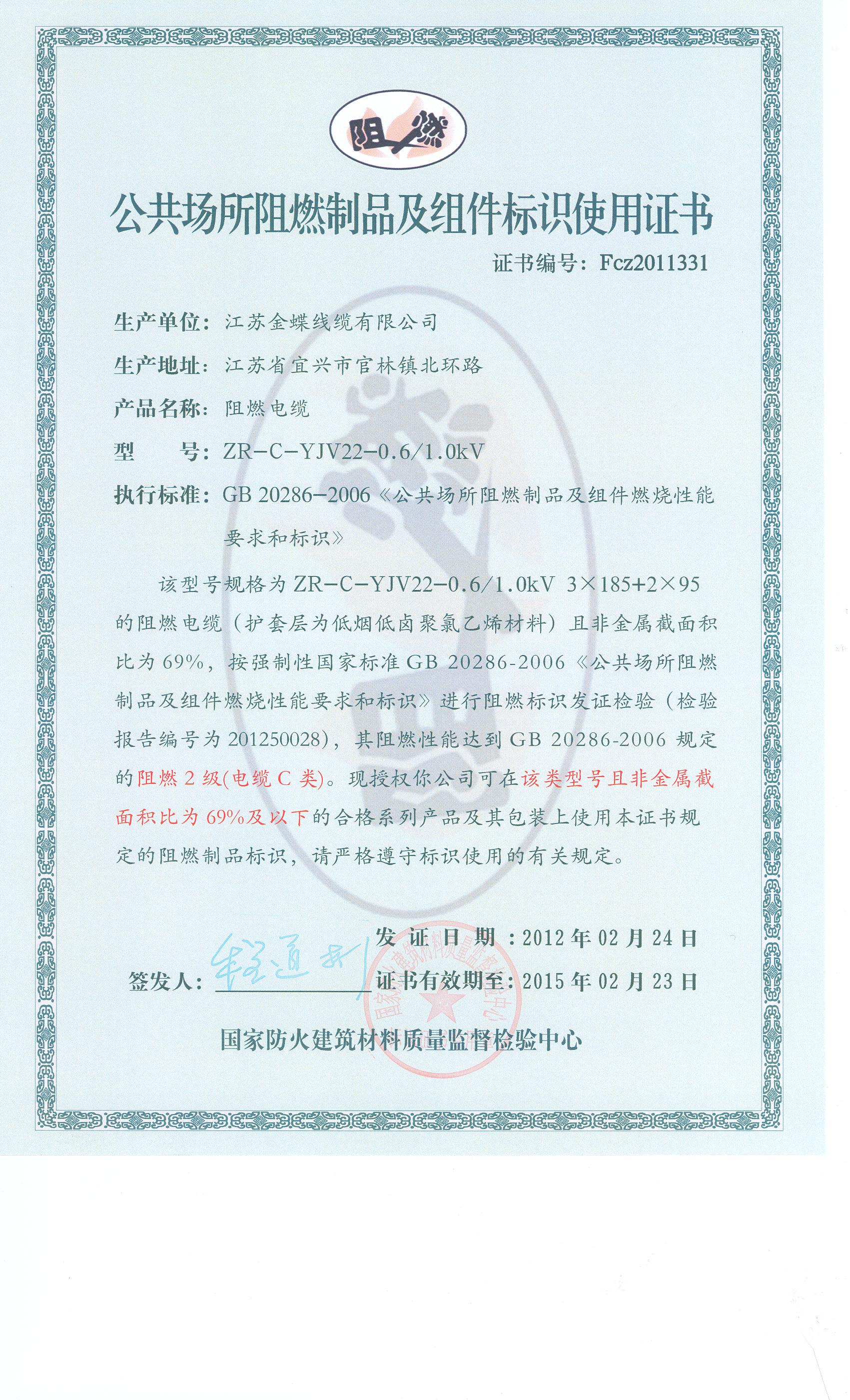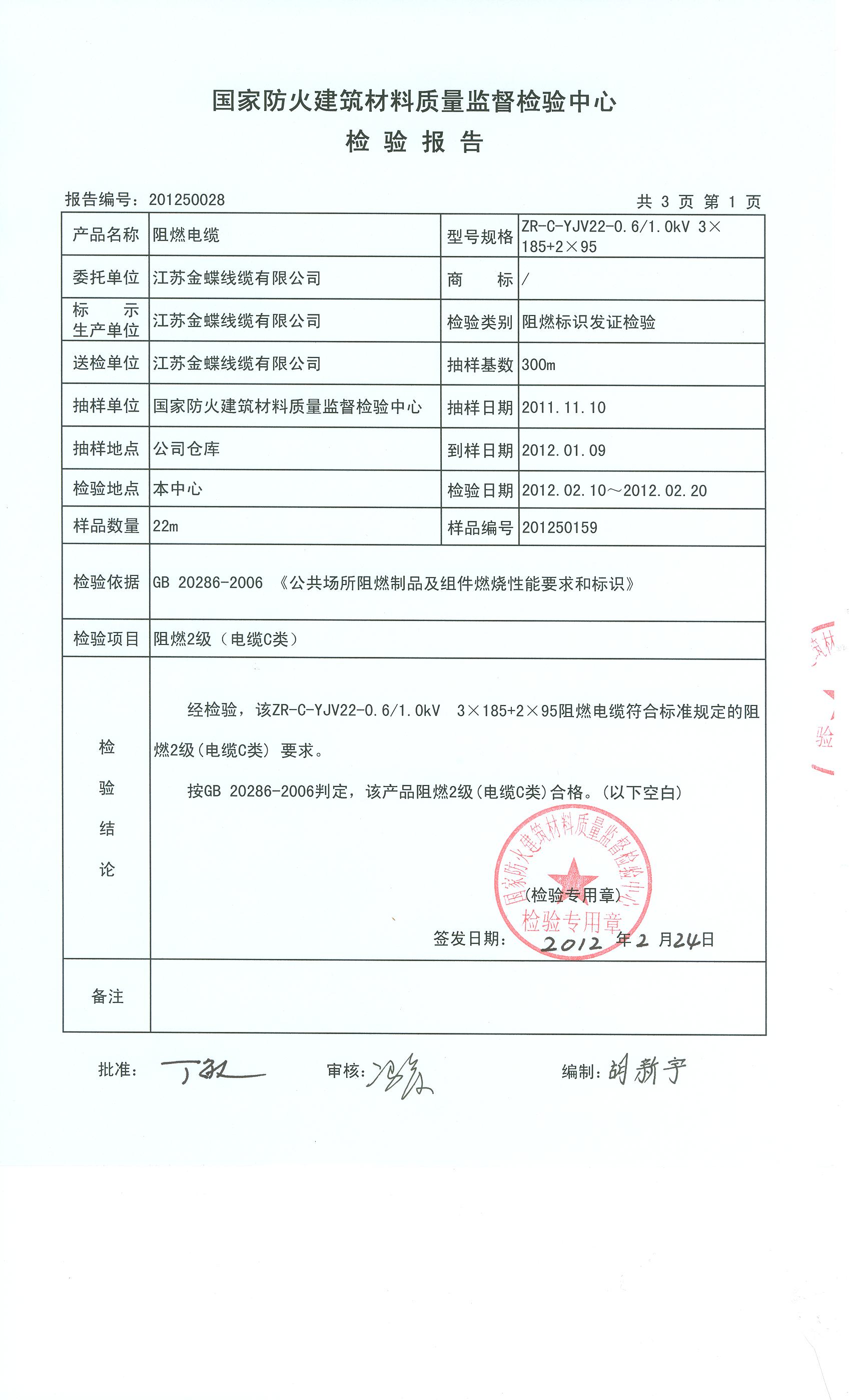 经检验,该ZR-C-YJV22-0.6/1.0kV 3×185+2×95阻燃电缆符合标准规定的阻燃2级(电缆C类) 要求。 按GB 20286-2006判定,该产品阻燃2级(电缆C类)合格。(以下空白)