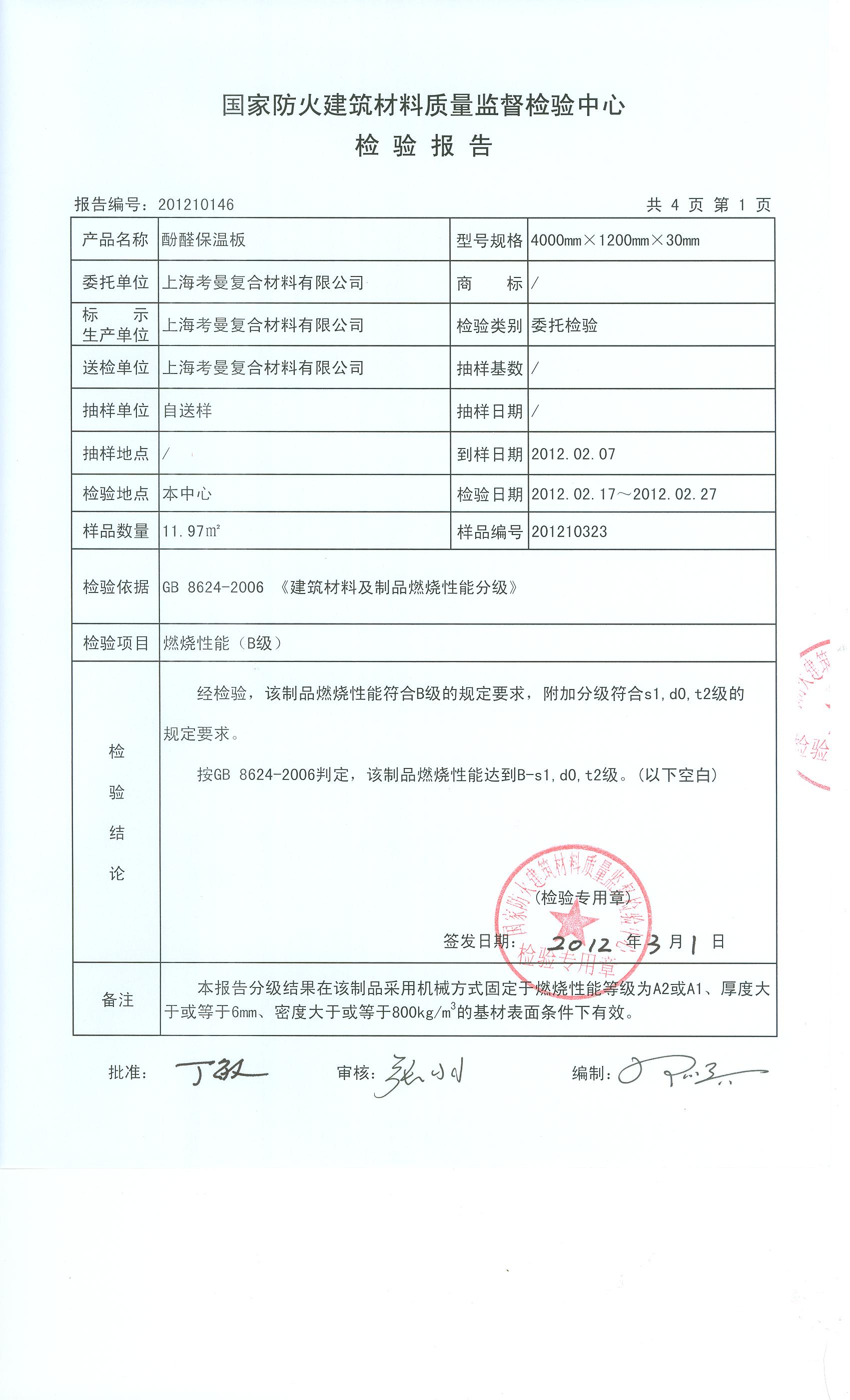 经检验,该制品燃烧性能符合B级的规定要求,附加分级符合s1,d0,t2级的 规定要求。 按GB 8624-2006判定,该制品燃烧性能达到B-s1,d0,t2级。(以下空白)