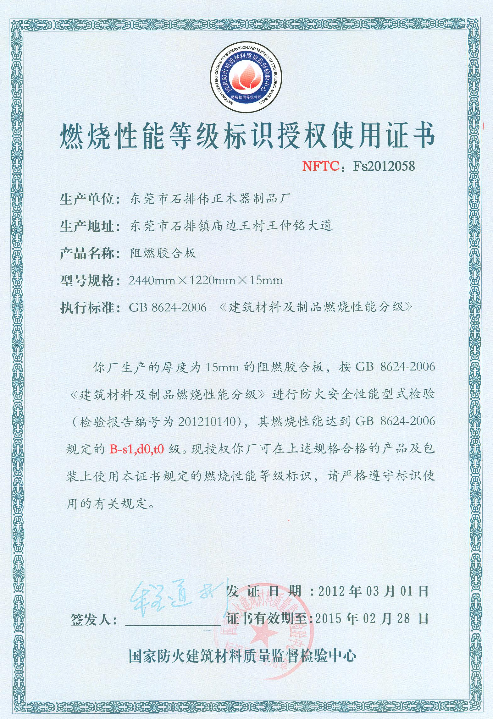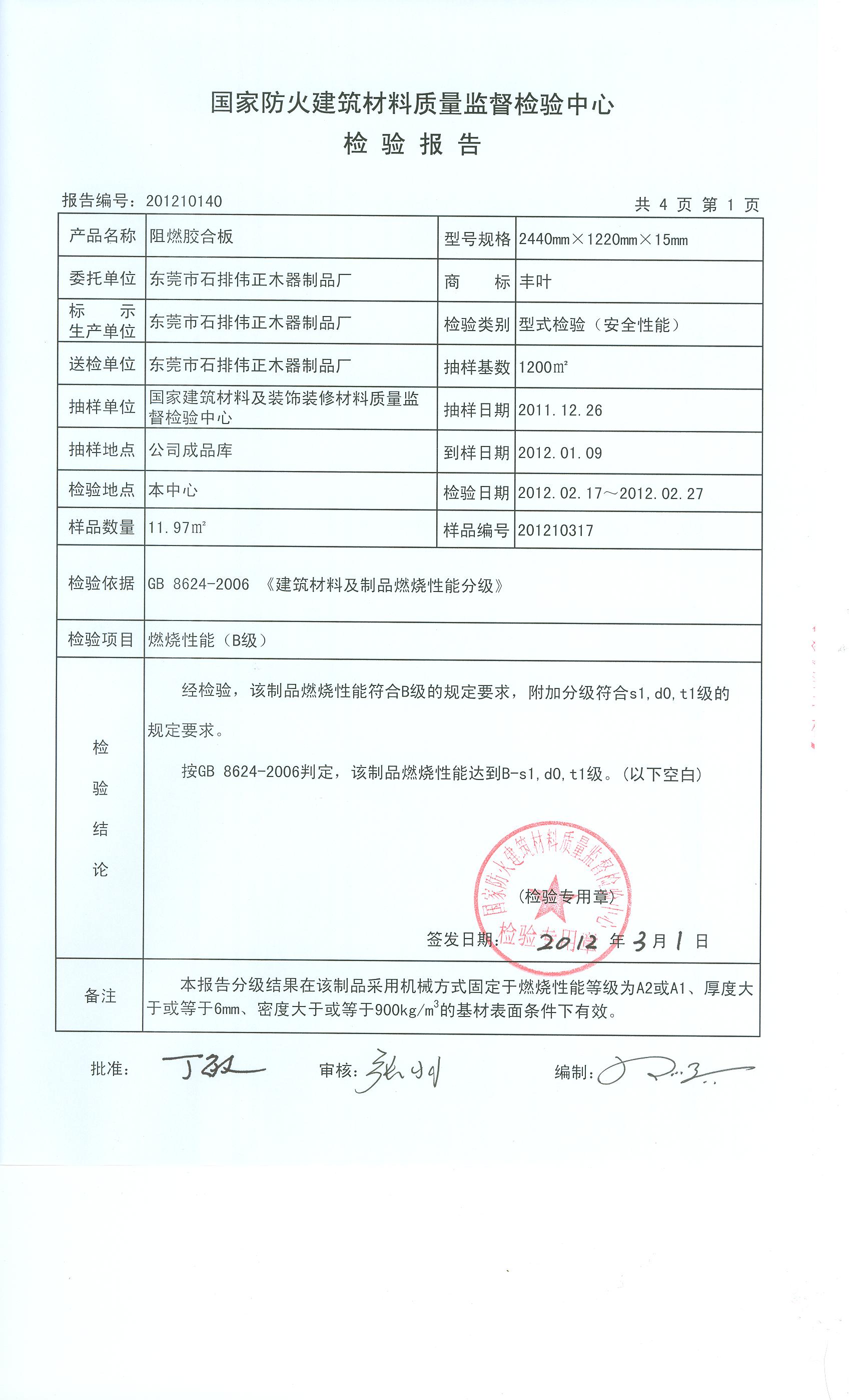 经检验,该制品燃烧性能符合B级的规定要求,附加分级符合s1,d0,t1级的 规定要求。 按GB 8624-2006判定,该制品燃烧性能达到B-s1,d0,t1级。(以下空白)