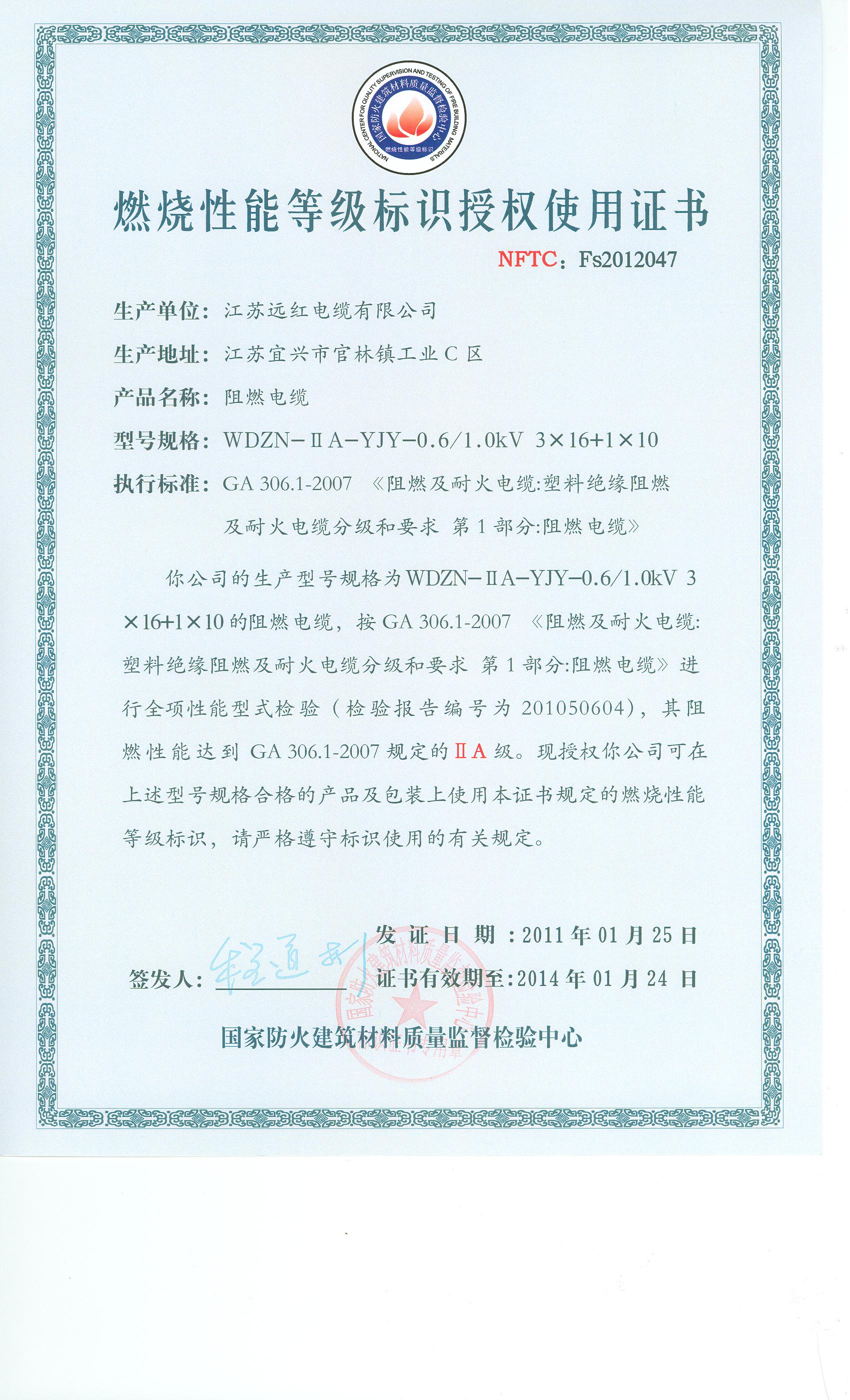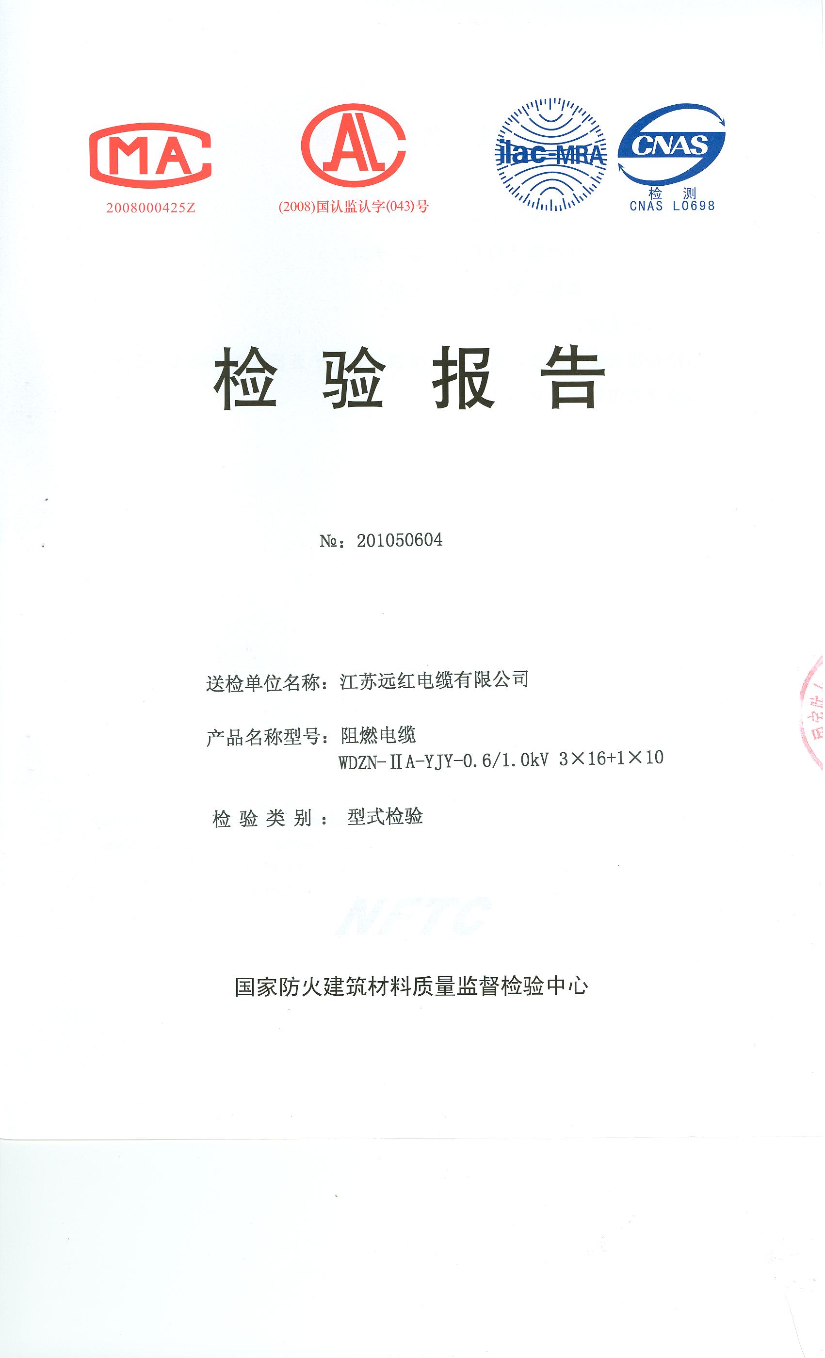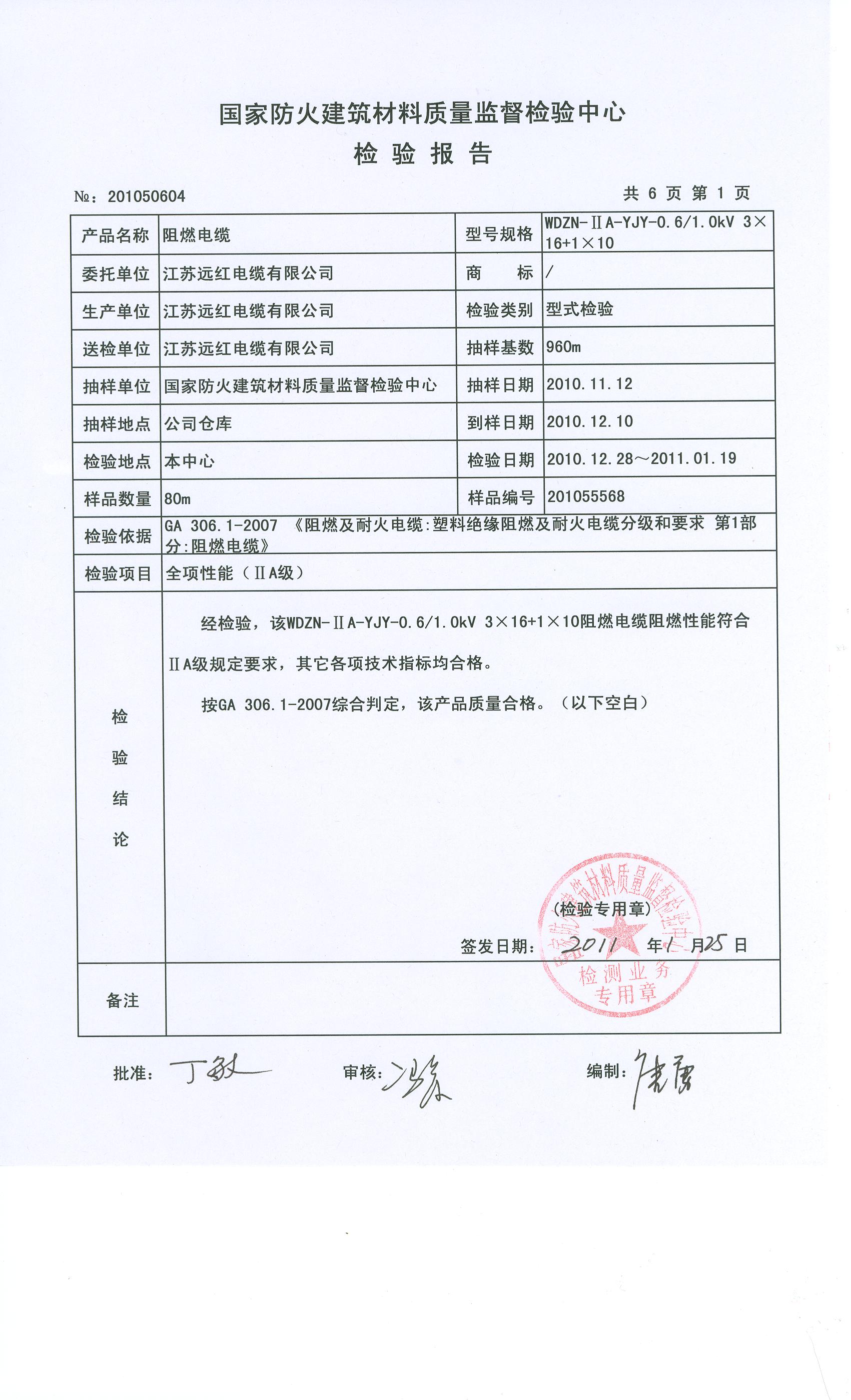 经检验,该WDZN-ⅡA-YJY-0.6/1.0kV 3×16+1×10阻燃电缆耐火性能符合ⅡA级规定要求,其它各项技术指标均合格。 按GA 306.1-2007综合判定,该产品质量合格。(以下空白)