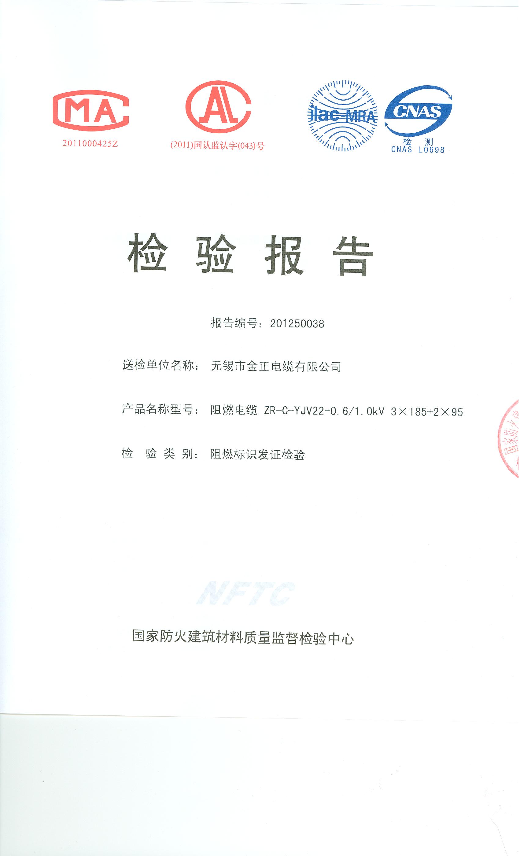 经检验,该ZR-C-YJV22-0.6/1.0kV 3×185+2×95阻燃电缆符合标准规定的阻燃2级(电缆C类) 要求。 按GB 20286-2006判定,该产品阻燃2级(电缆C类)合格。(以下空白)
