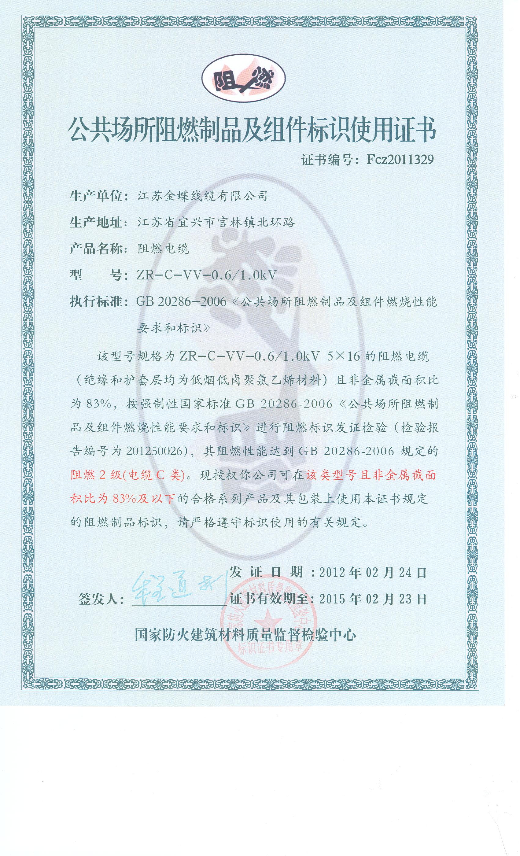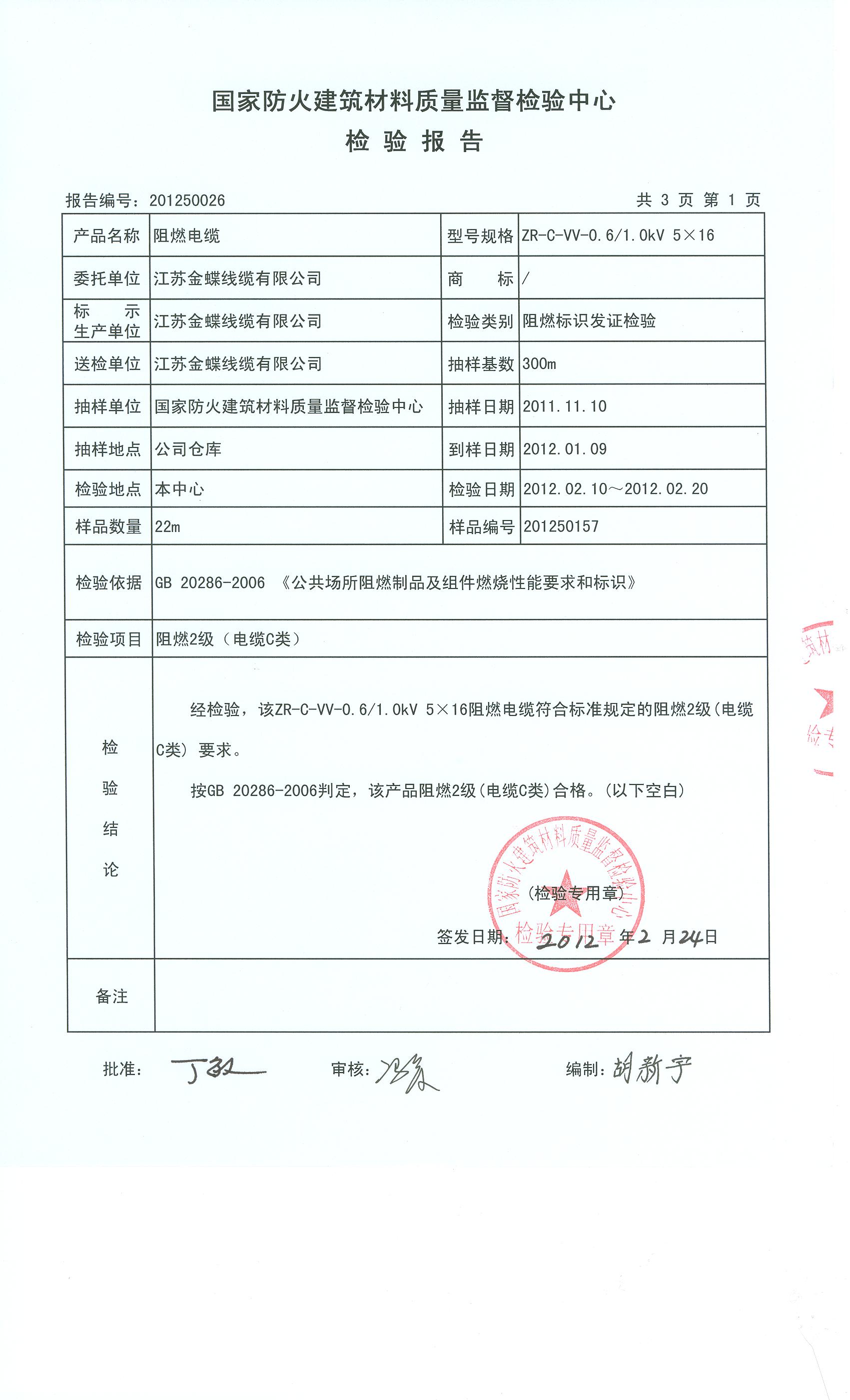 经检验,该ZR-C-VV-0.6/1.0kV 5×16阻燃电缆符合标准规定的阻燃2级(电缆C类) 要求。 按GB 20286-2006判定,该产品阻燃2级(电缆C类)合格。(以下空白)