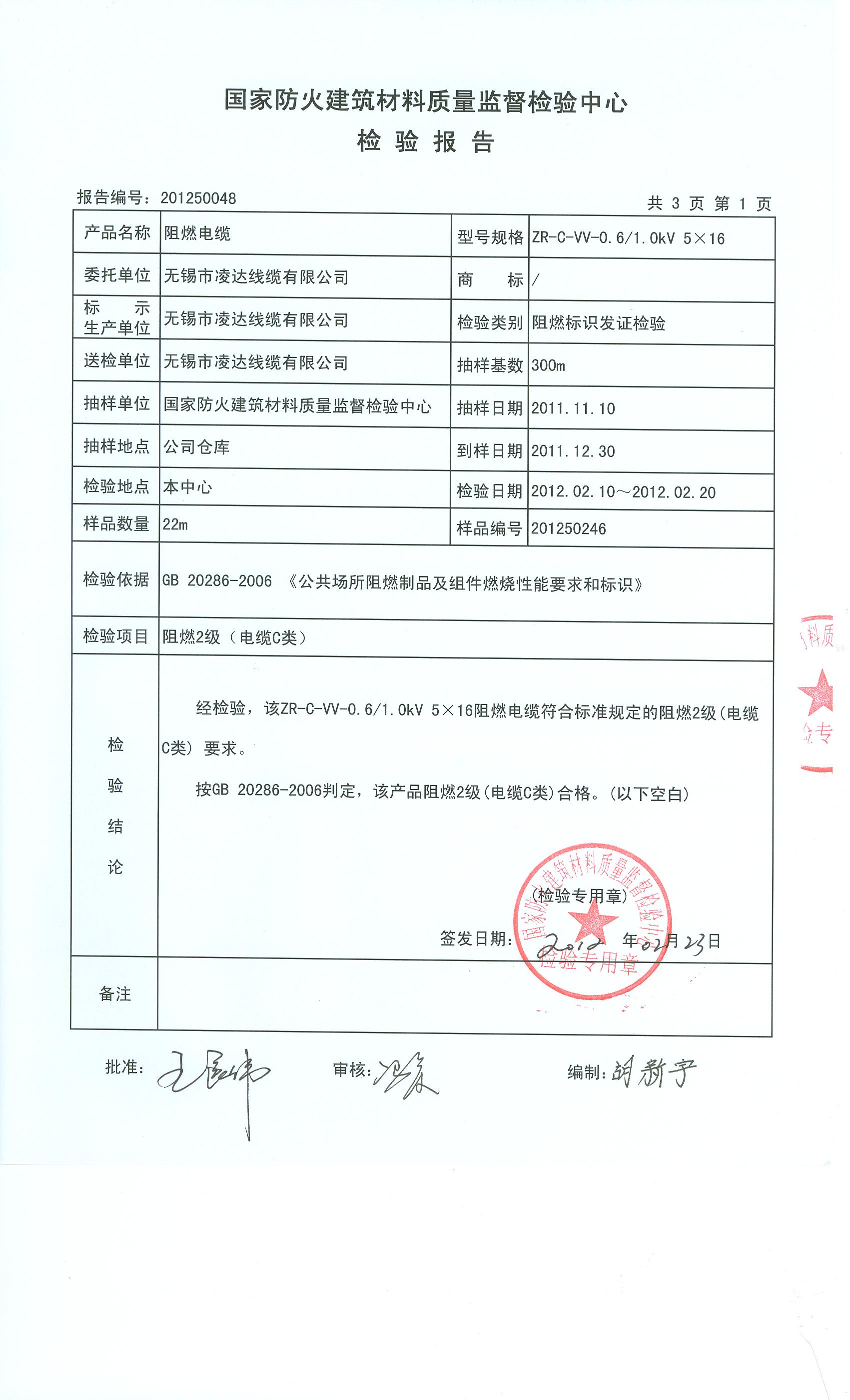 经检验,该ZR-C-VV-0.6/1.0kV 5×16阻燃电缆符合标准规定的阻燃2级(电缆C类) 要求。 按GB 20286-2006判定,该产品阻燃2级(电缆C类)合格。(以下空白)