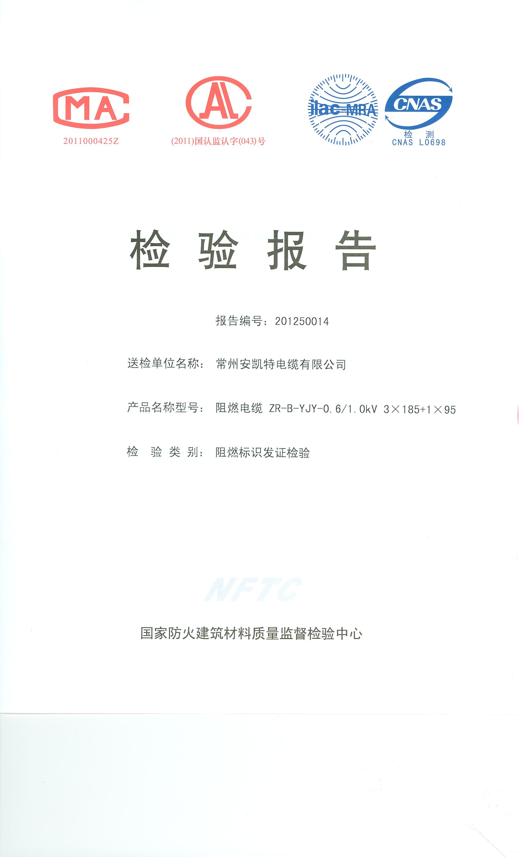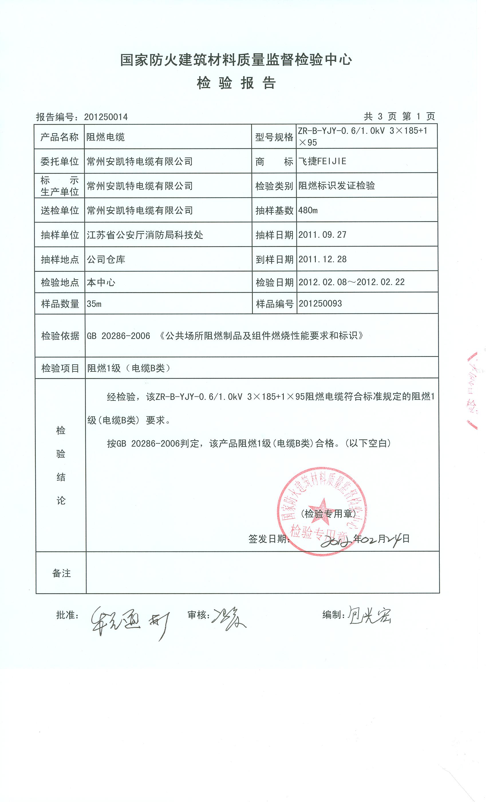 经检验,该ZR-B-YJY-0.6/1.0kV 3×185+1×95阻燃电缆符合标准规定的阻燃1级(电缆B类) 要求。 按GB 20286-2006判定,该产品阻燃1级(电缆B类)合格。(以下空白)
