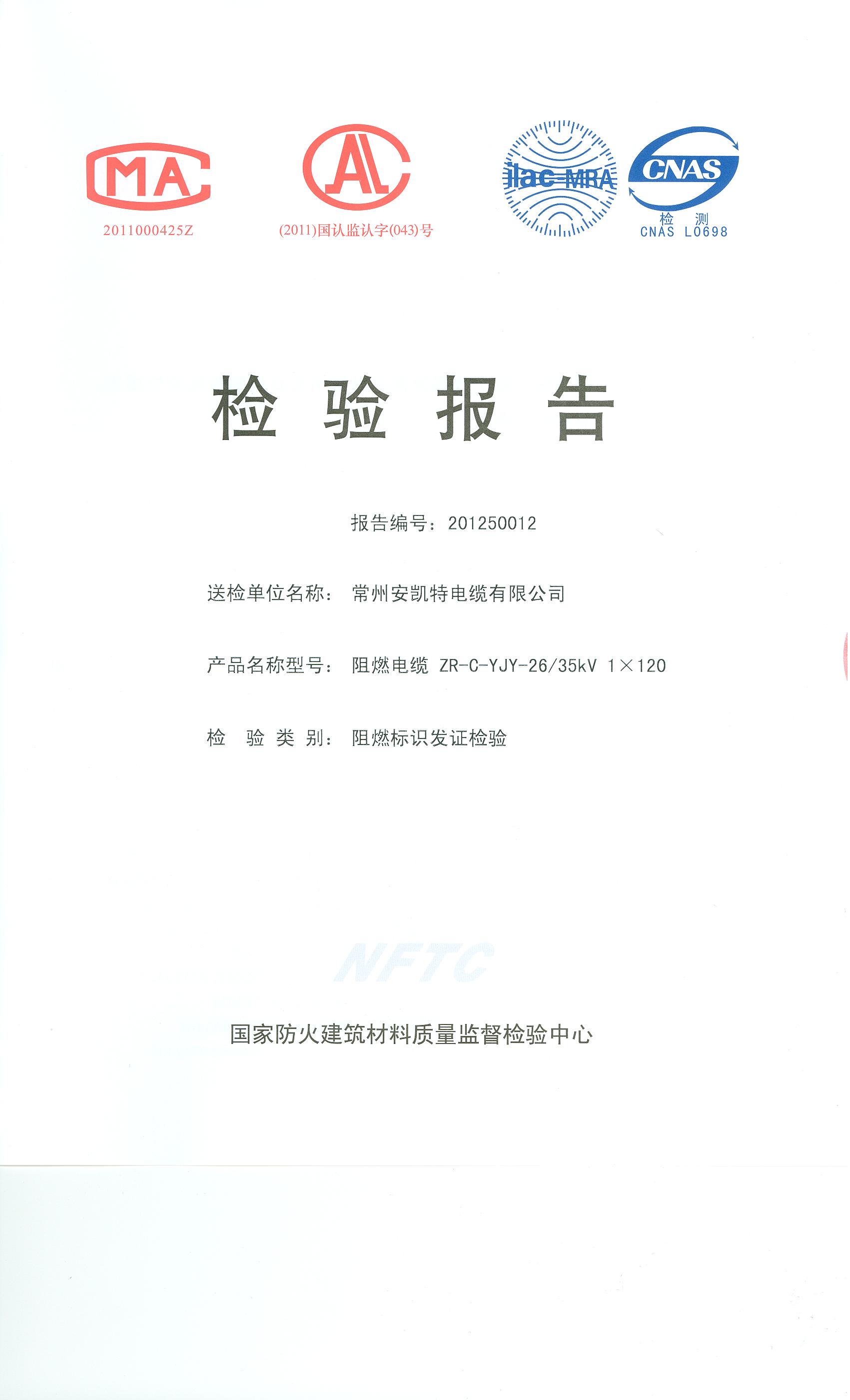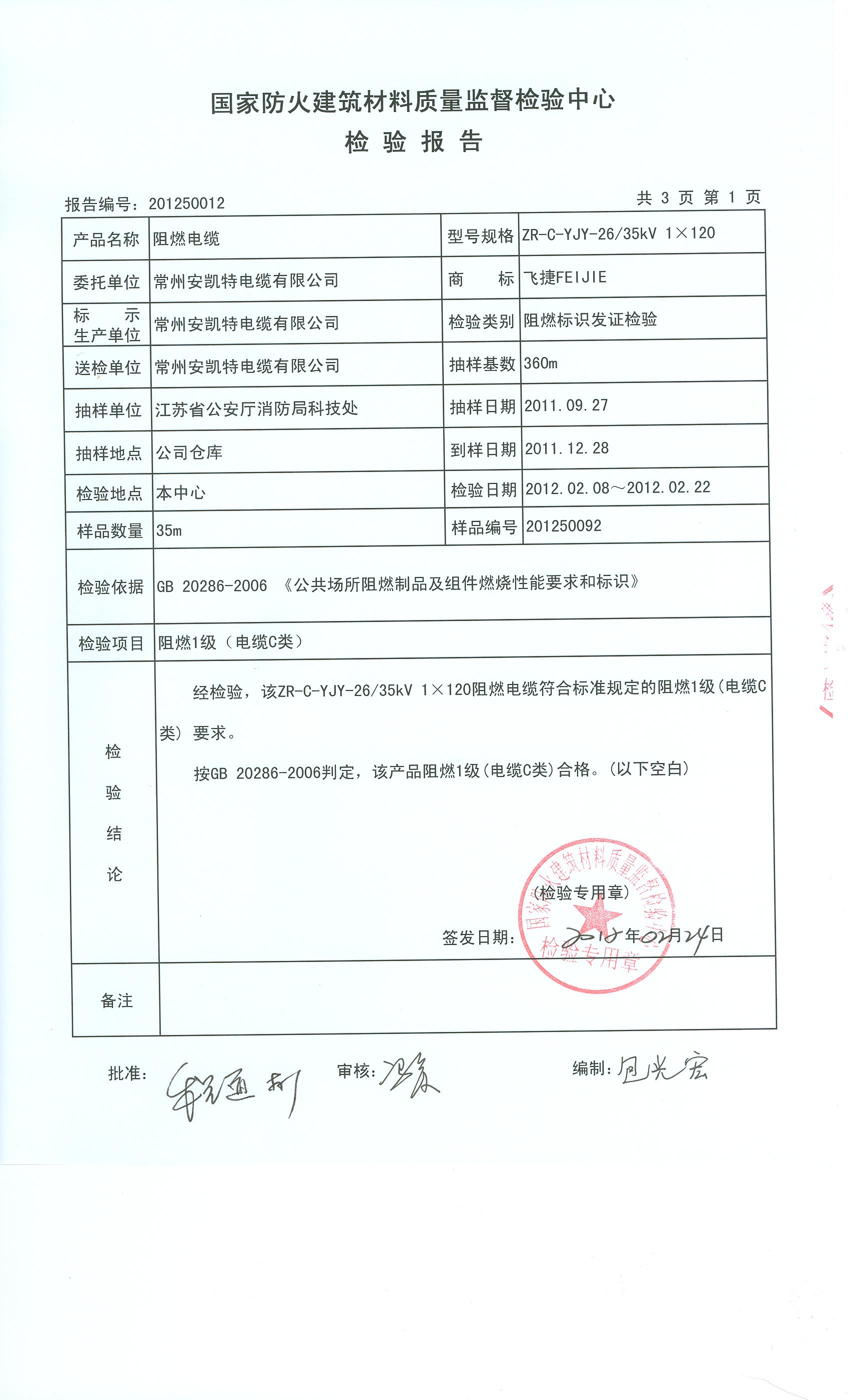 经检验,该ZR-C-YJY-26/35kV 1×120阻燃电缆符合标准规定的阻燃1级(电缆C类) 要求。 按GB 20286-2006判定,该产品阻燃1级(电缆C类)合格。(以下空白)