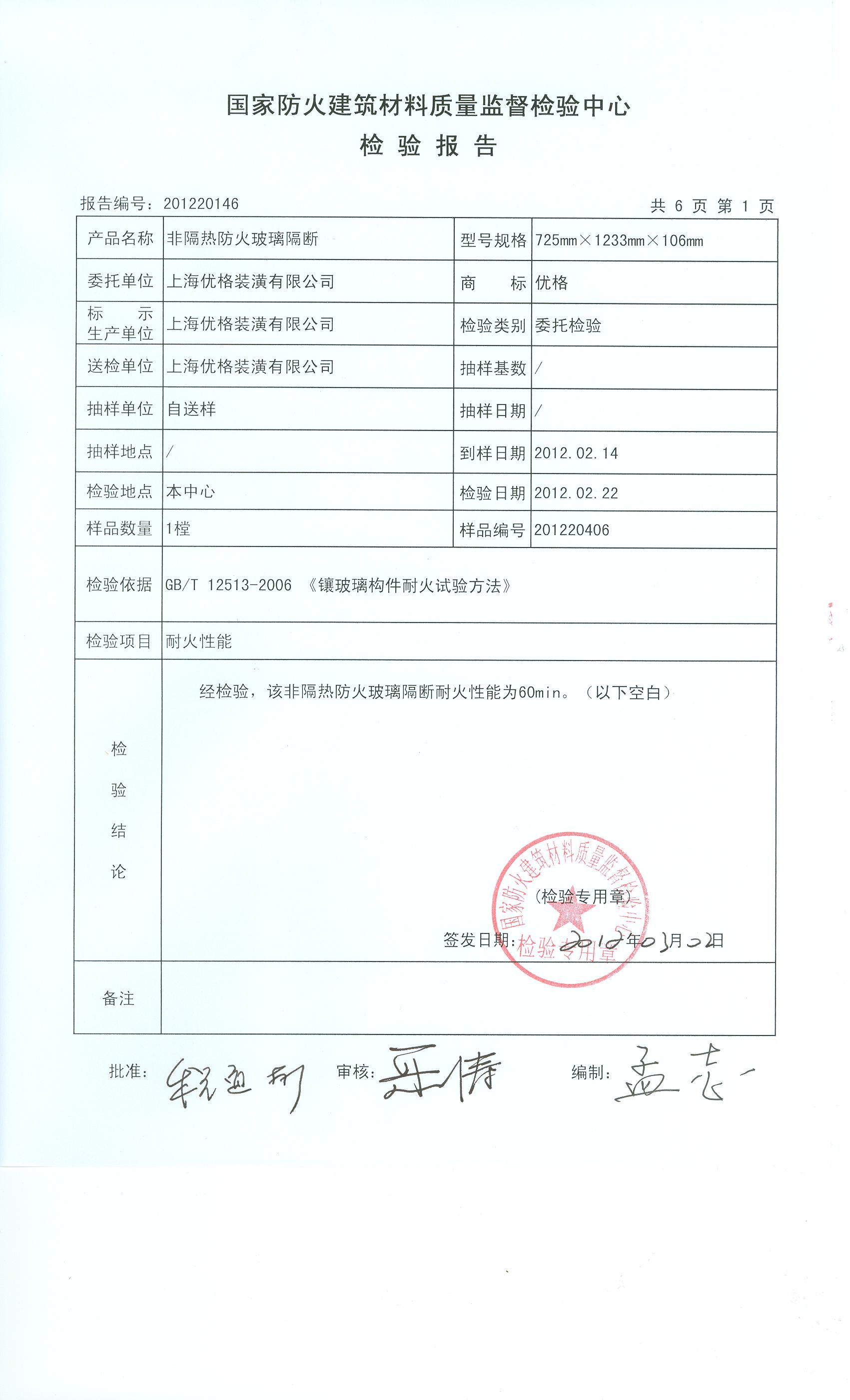经检验,该非隔热防火玻璃隔断耐火性能为60min。(以下空白)