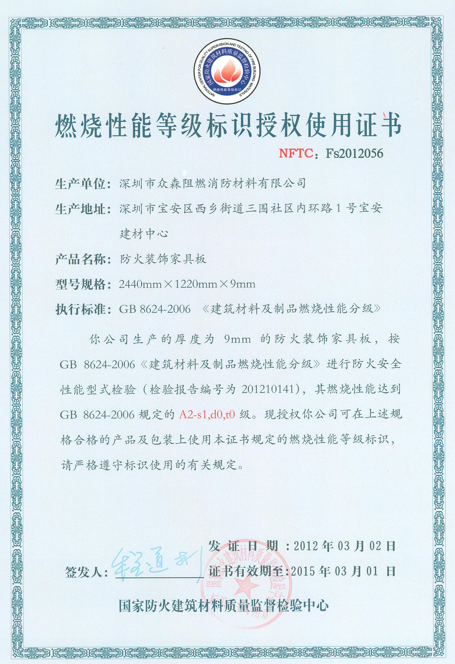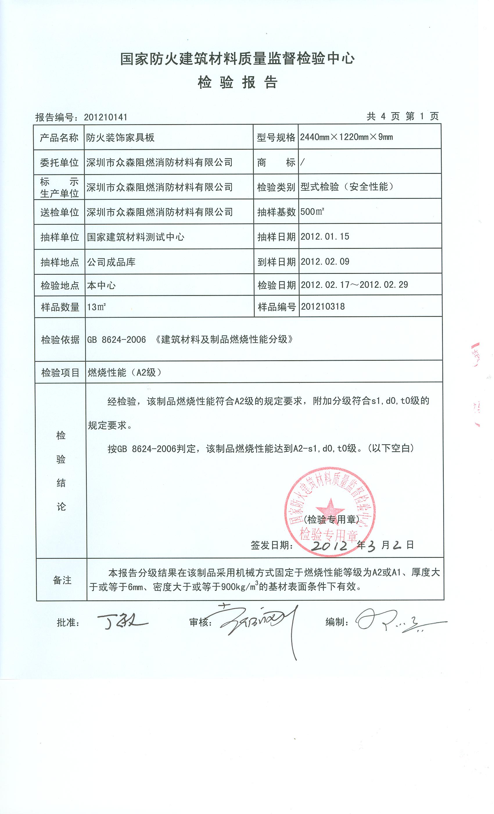 经检验,该制品燃烧性能符合A2级的规定要求,附加分级符合s1,d0,t0级的 规定要求。 按GB 8624-2006判定,该制品燃烧性能达到A2-s1,d0,t0级。(以下空白)