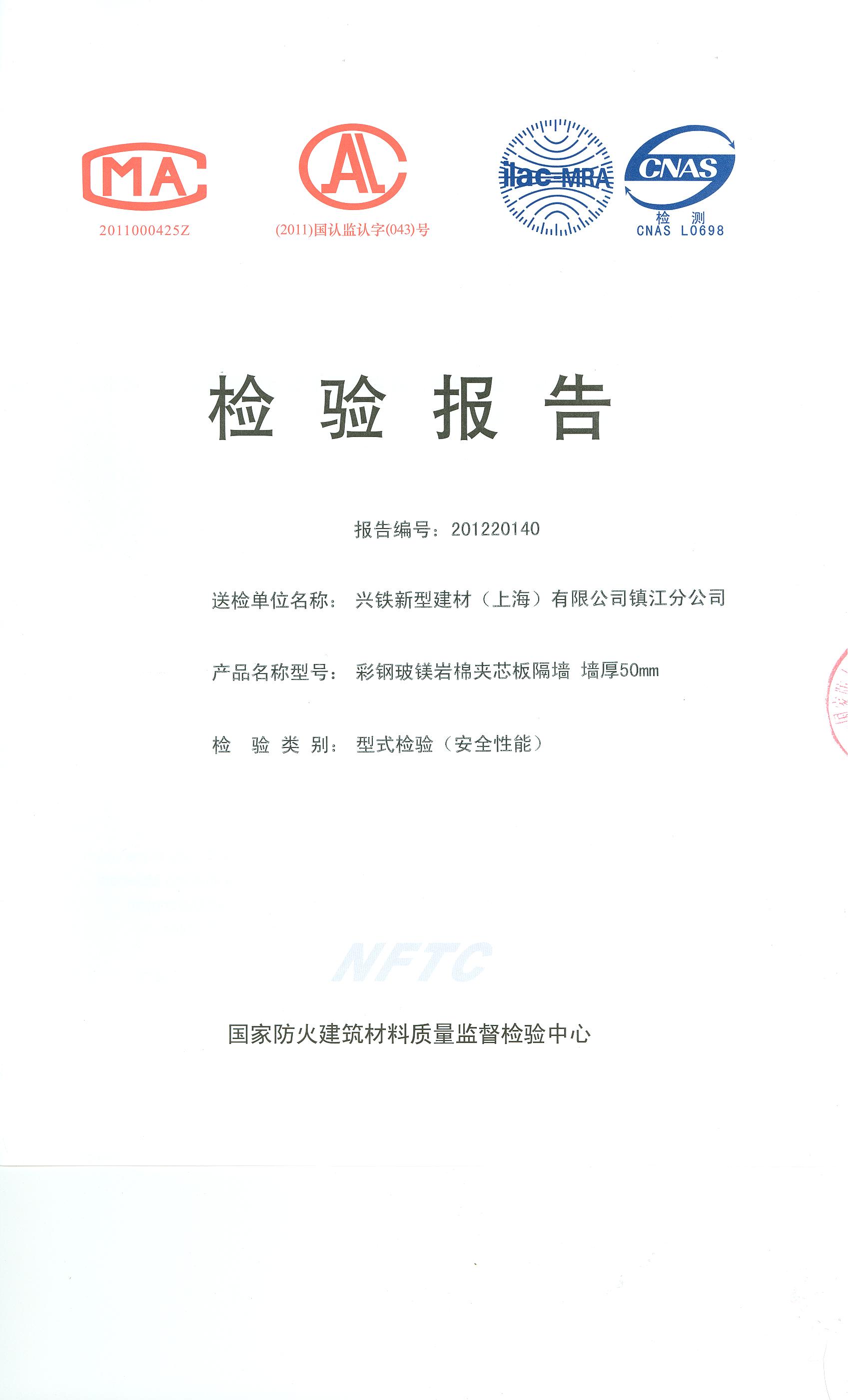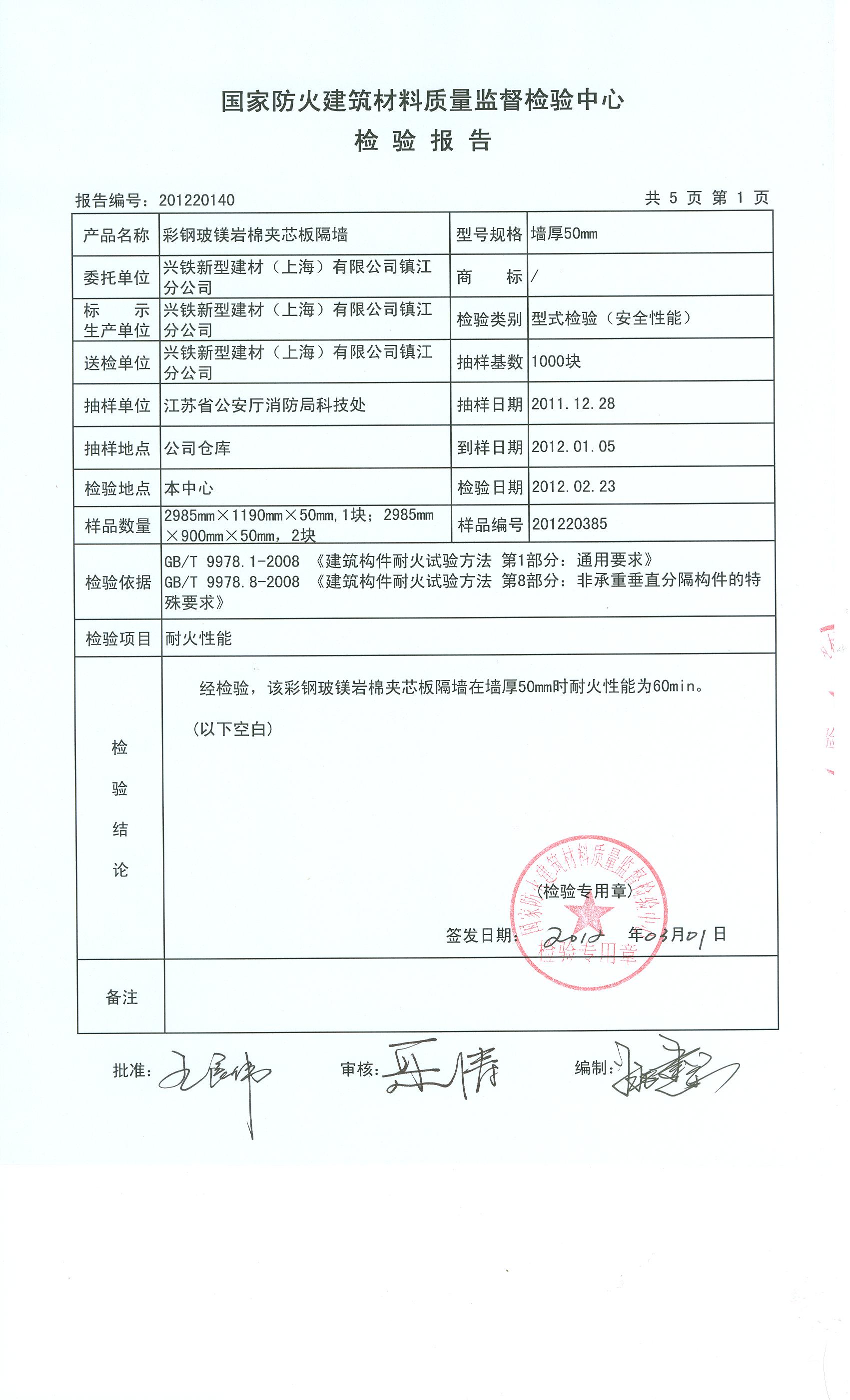 经检验,该彩钢玻镁岩棉夹芯板隔墙在墙厚50mm时耐火性能为60min。(以下空白)