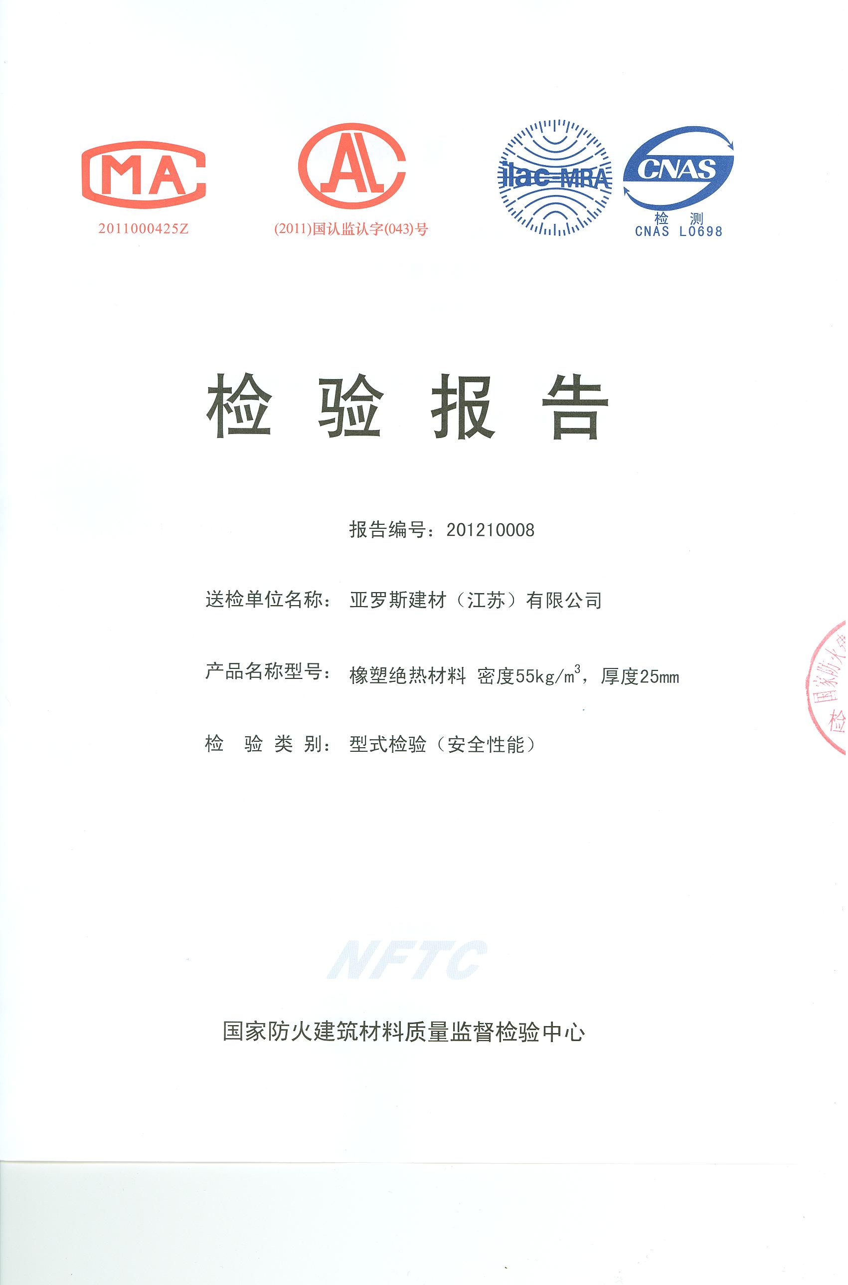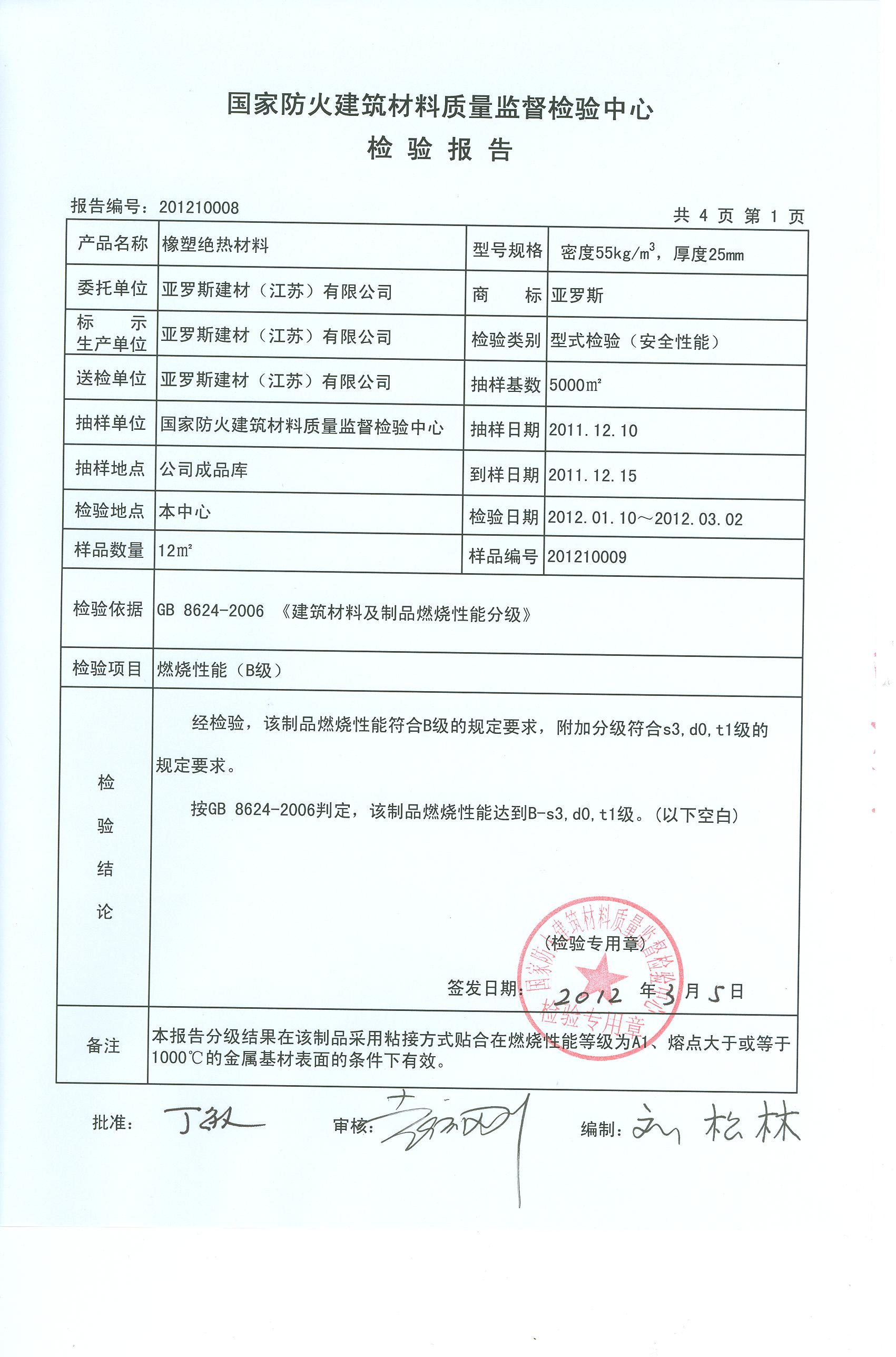 经检验,该制品燃烧性能符合B级的规定要求,附加分级符合s3,d0,t1级的 规定要求。 按GB 8624-2006判定,该制品燃烧性能达到B-s3,d0,t1级。(以下空白)