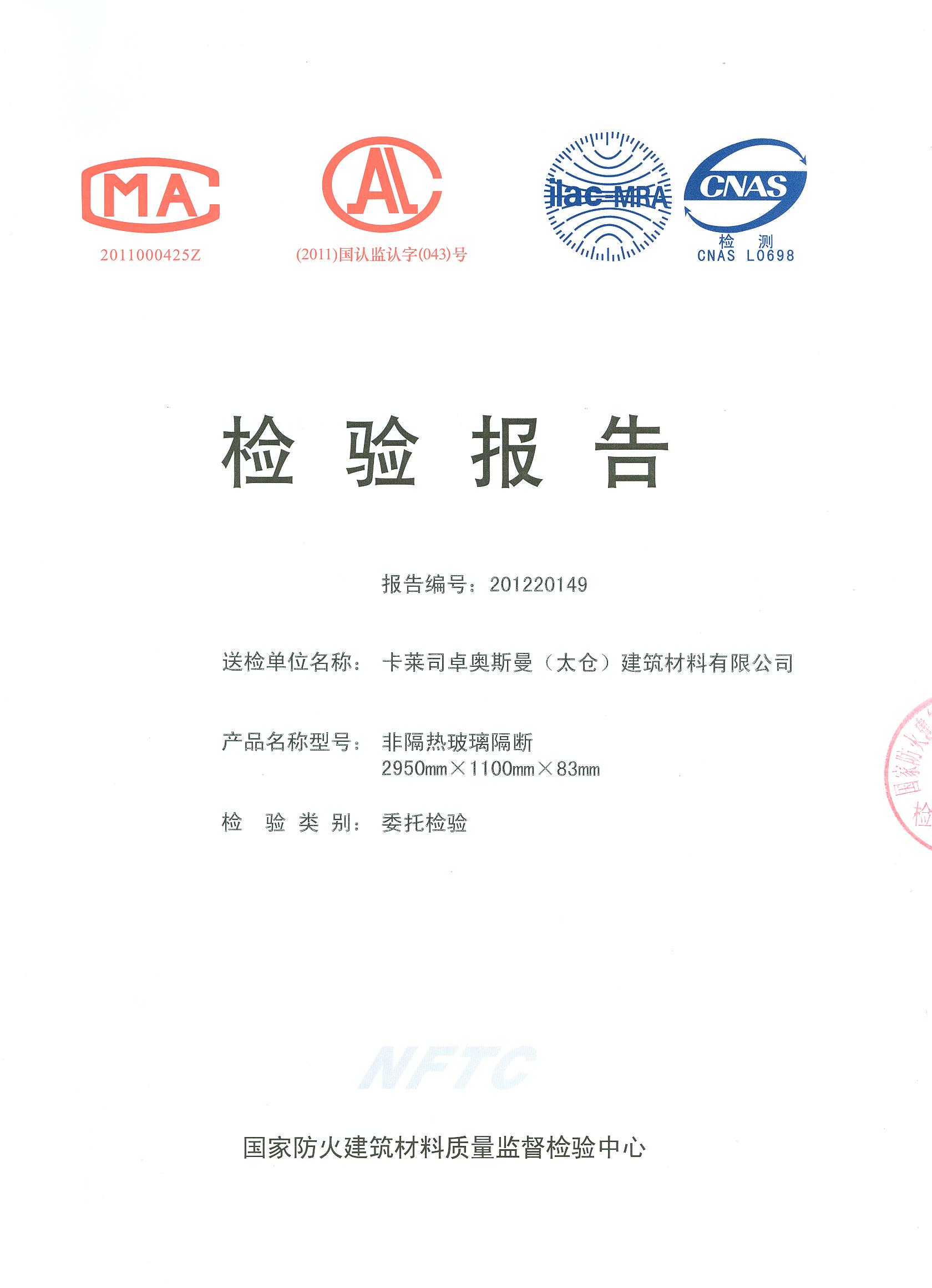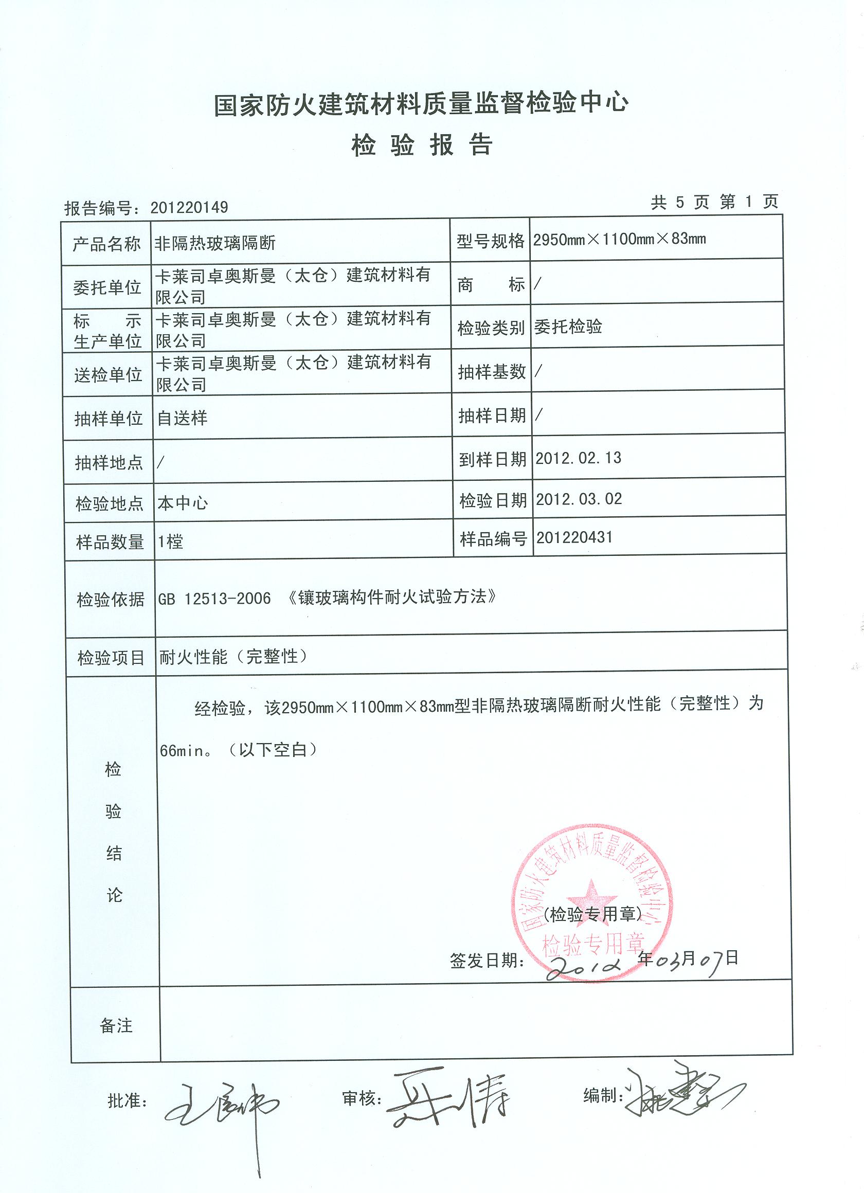 经检验,该2950mm×1100mm×83mm型非隔热玻璃隔断耐火性能(完整性)为66min。(以下空白)
