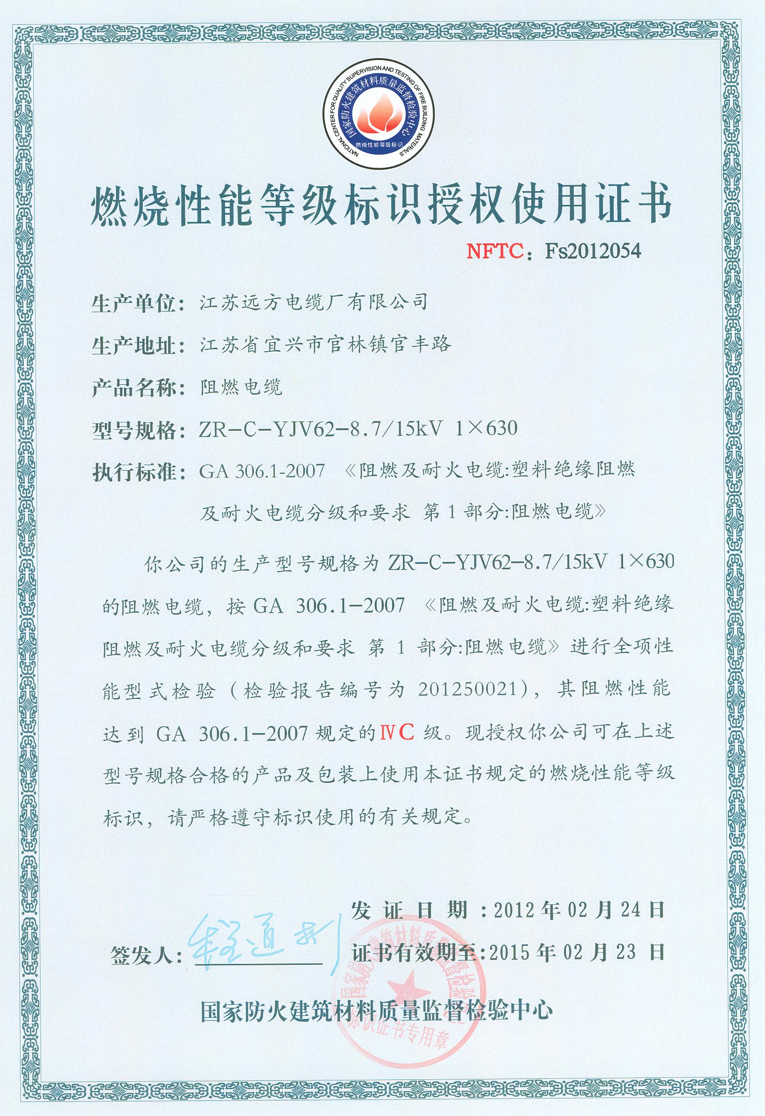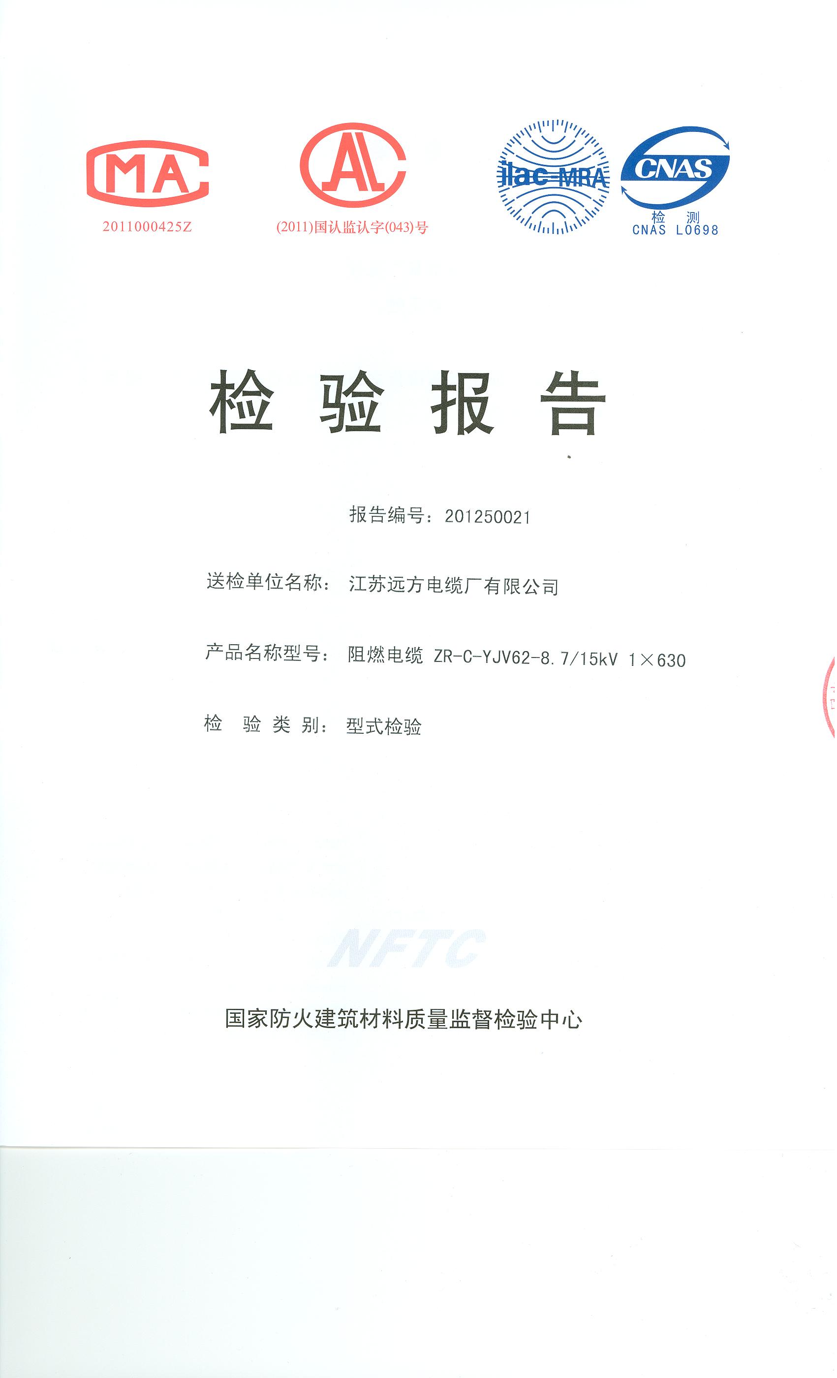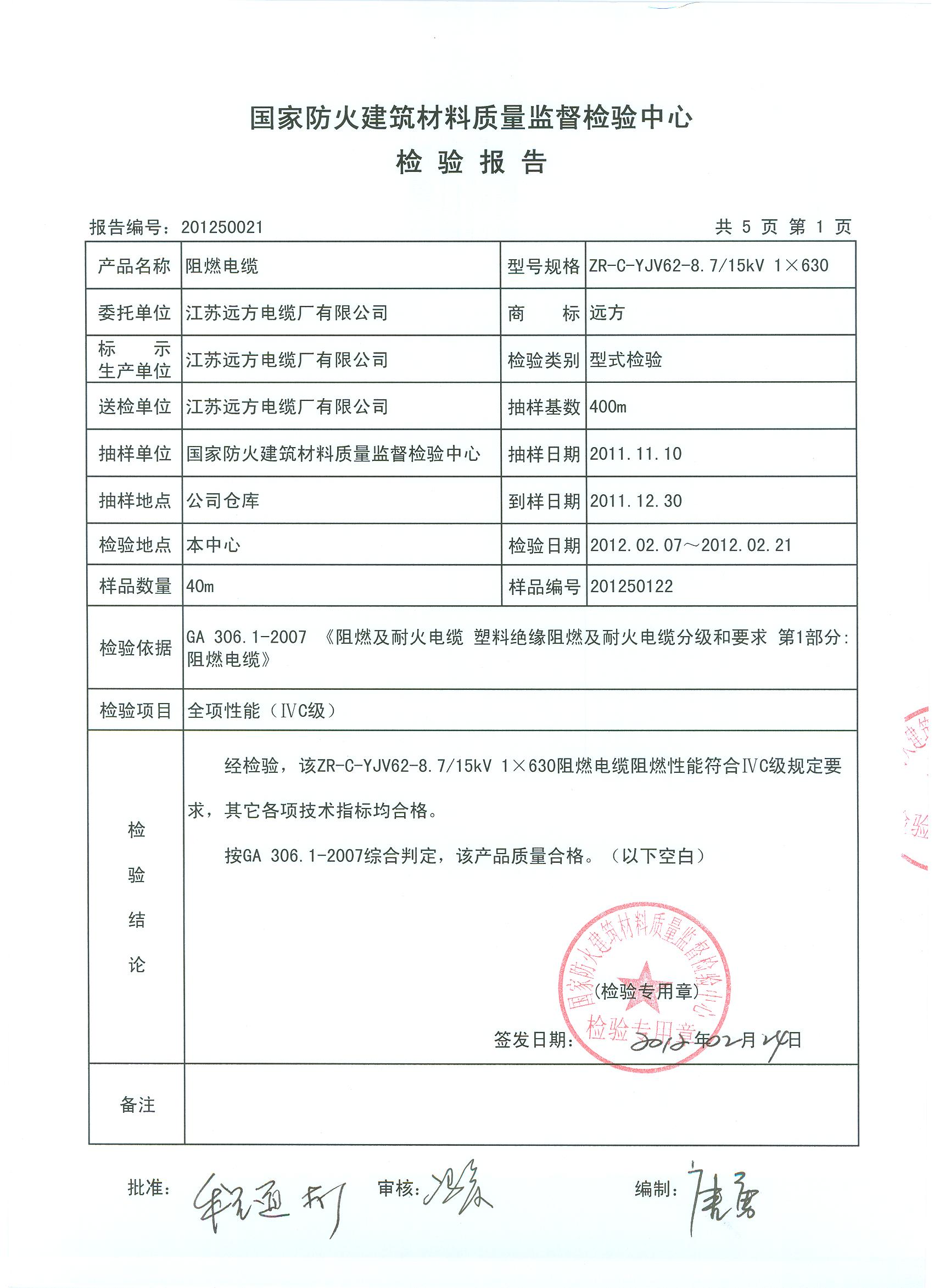 经检验,该ZR-C-YJV62-8.7/15kV 1×630阻燃电缆阻燃性能符合ⅣC级规定要求,其它各项技术指标均合格。 按GA 306.1-2007综合判定,该产品质量合格。(以下空白)