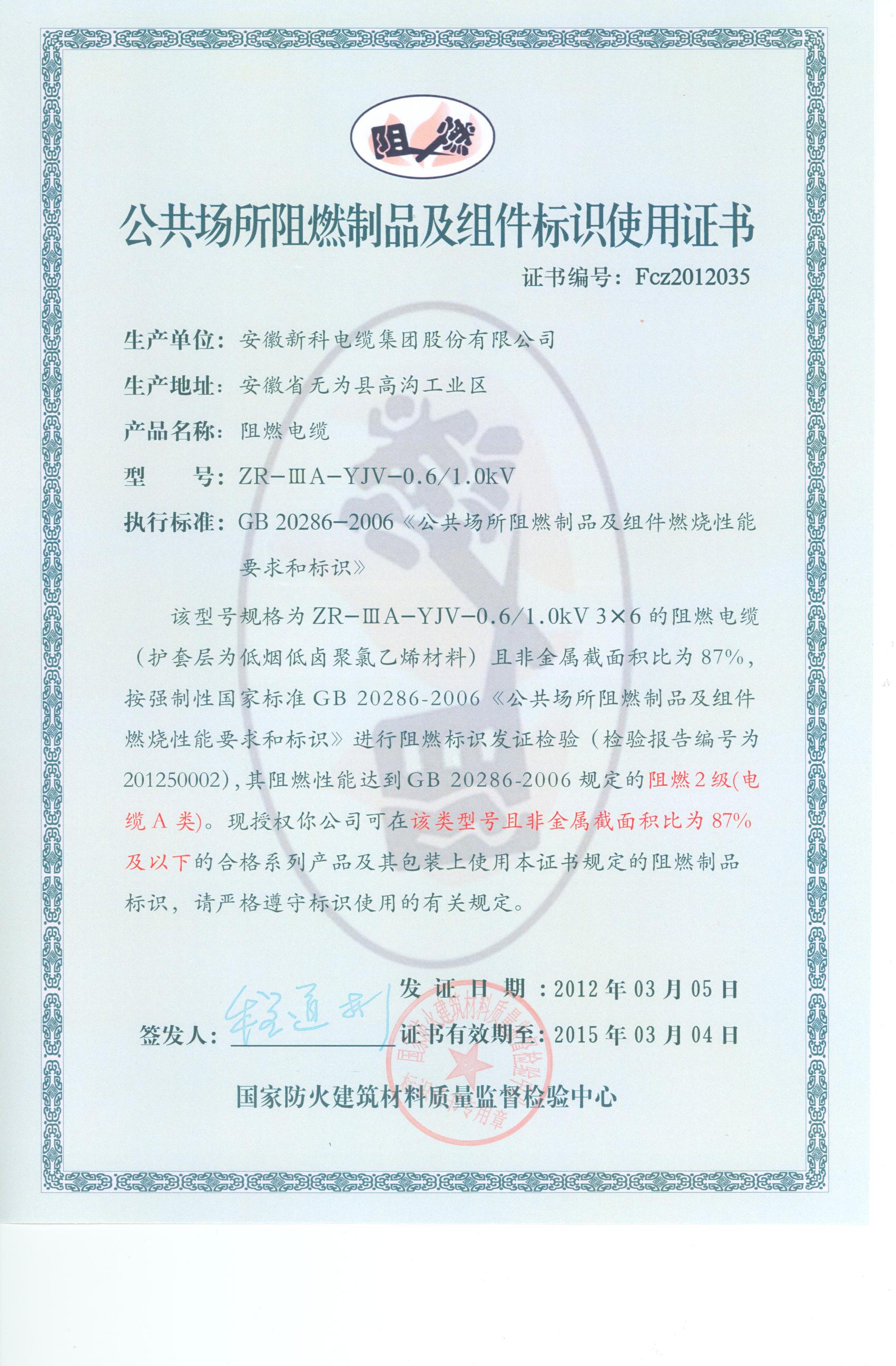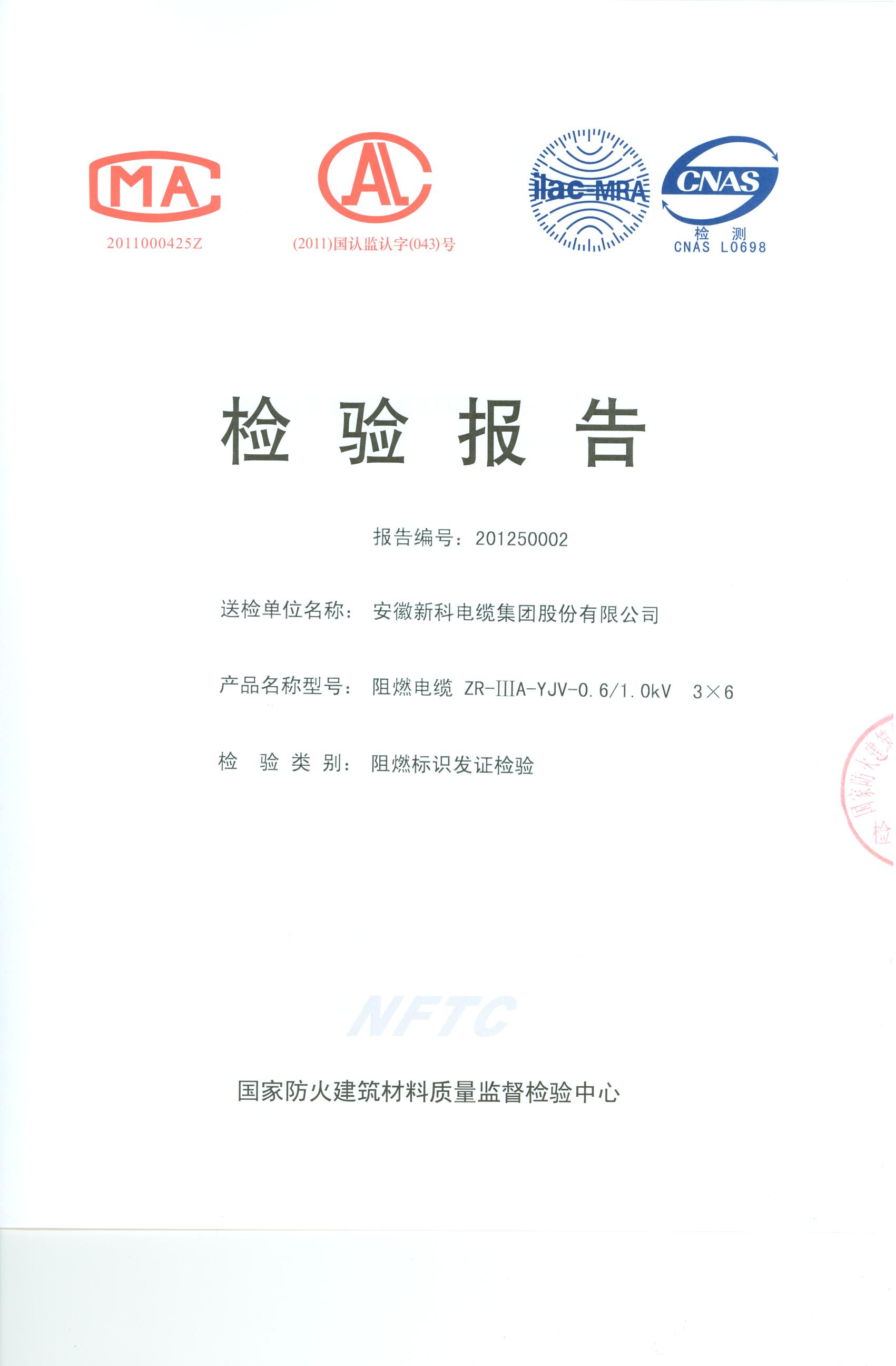 经检验,该ZR-ⅢA-YJV-0.6/1.0kV 3×6阻燃电缆符合标准规定的阻燃2级(电缆A类) 要求。 按GB 20286-2006判定,该产品阻燃2级(电缆A类)合格。(以下空白)