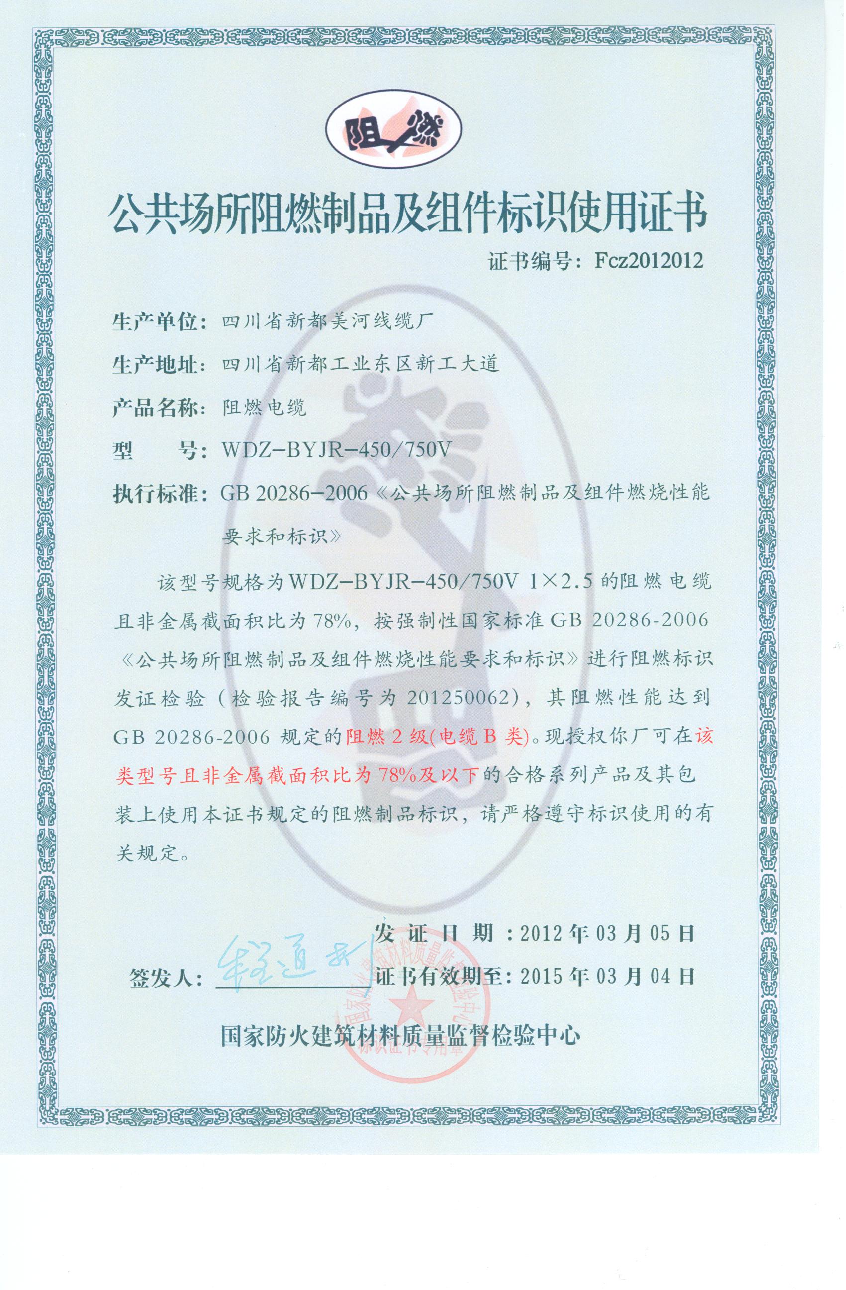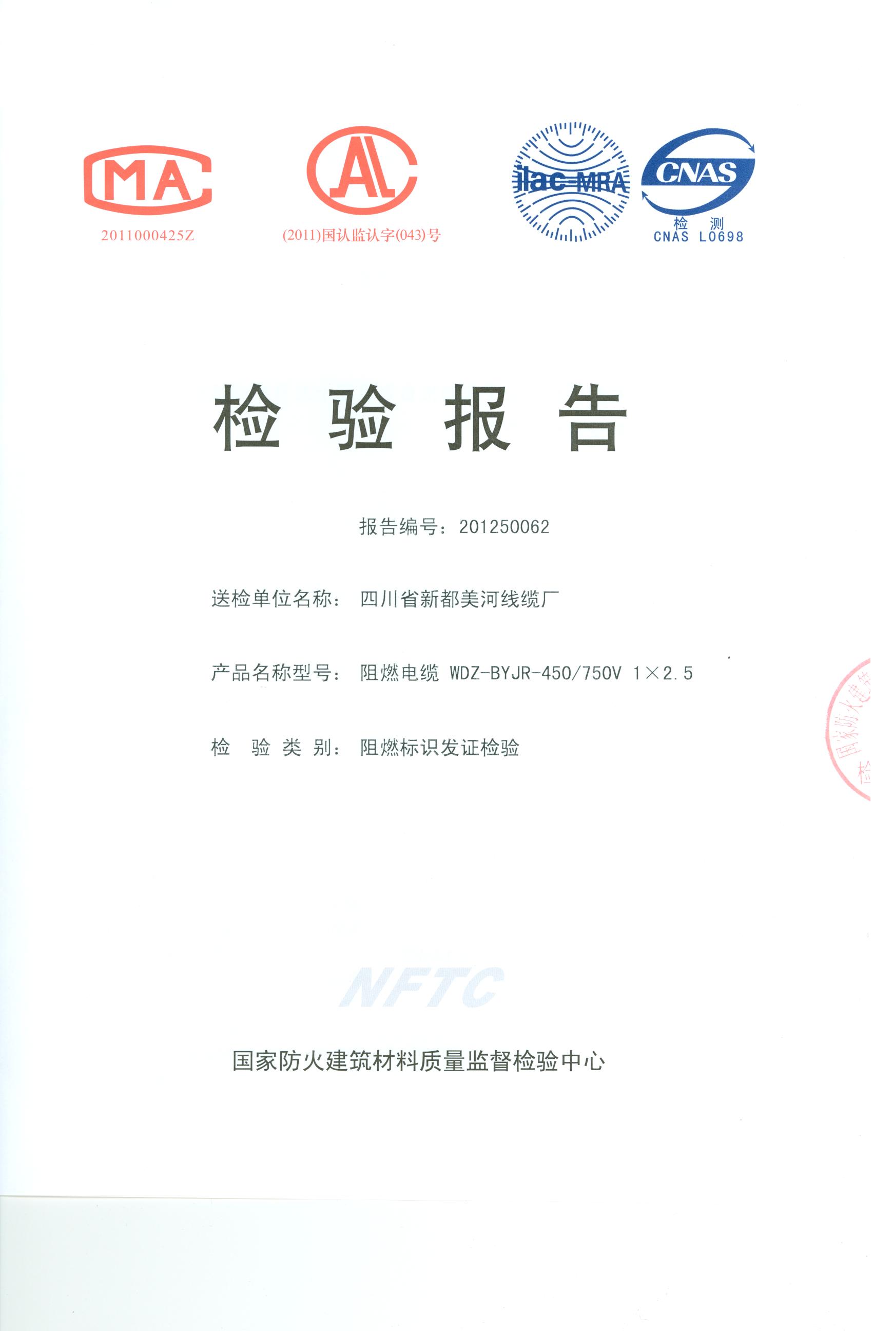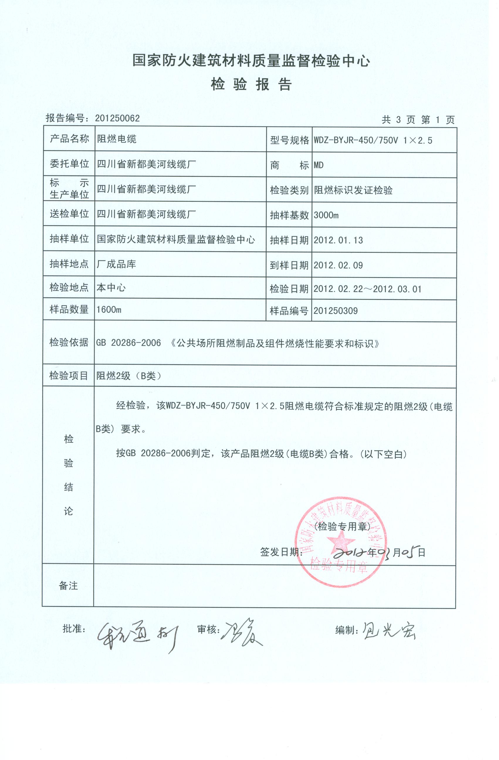 经检验,该WDZ-BYJR-450/750V 1×2.5阻燃电缆符合标准规定的阻燃2级(电缆B类) 要求。 按GB 20286-2006判定,该产品阻燃2级(电缆B类)合格。(以下空白)