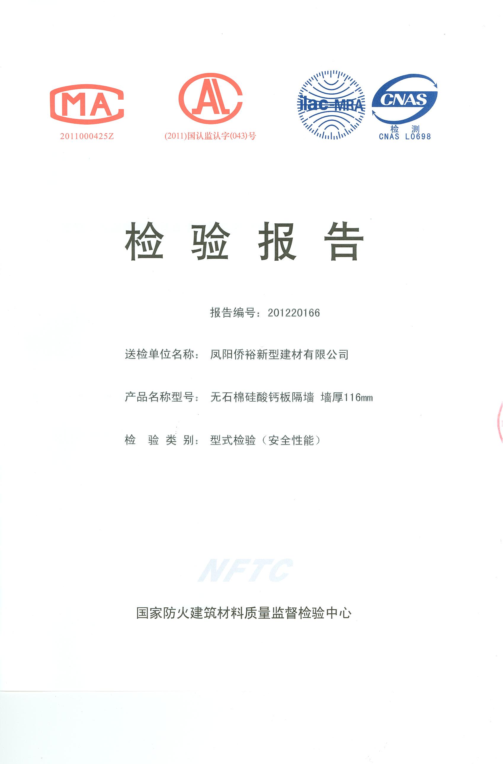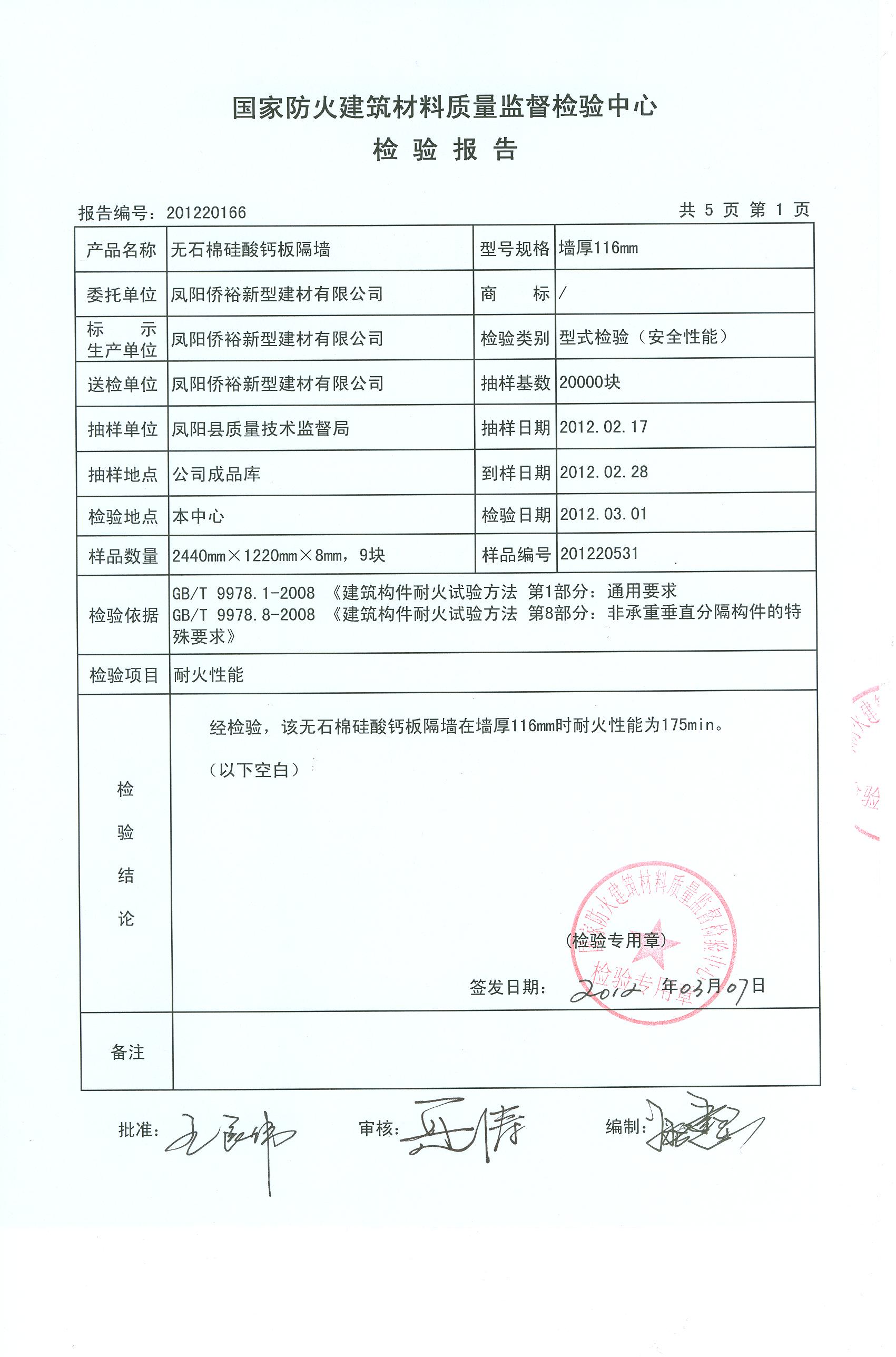经检验,该无石棉硅酸钙板隔墙在墙厚116mm时耐火性能为175min。(以下空白)