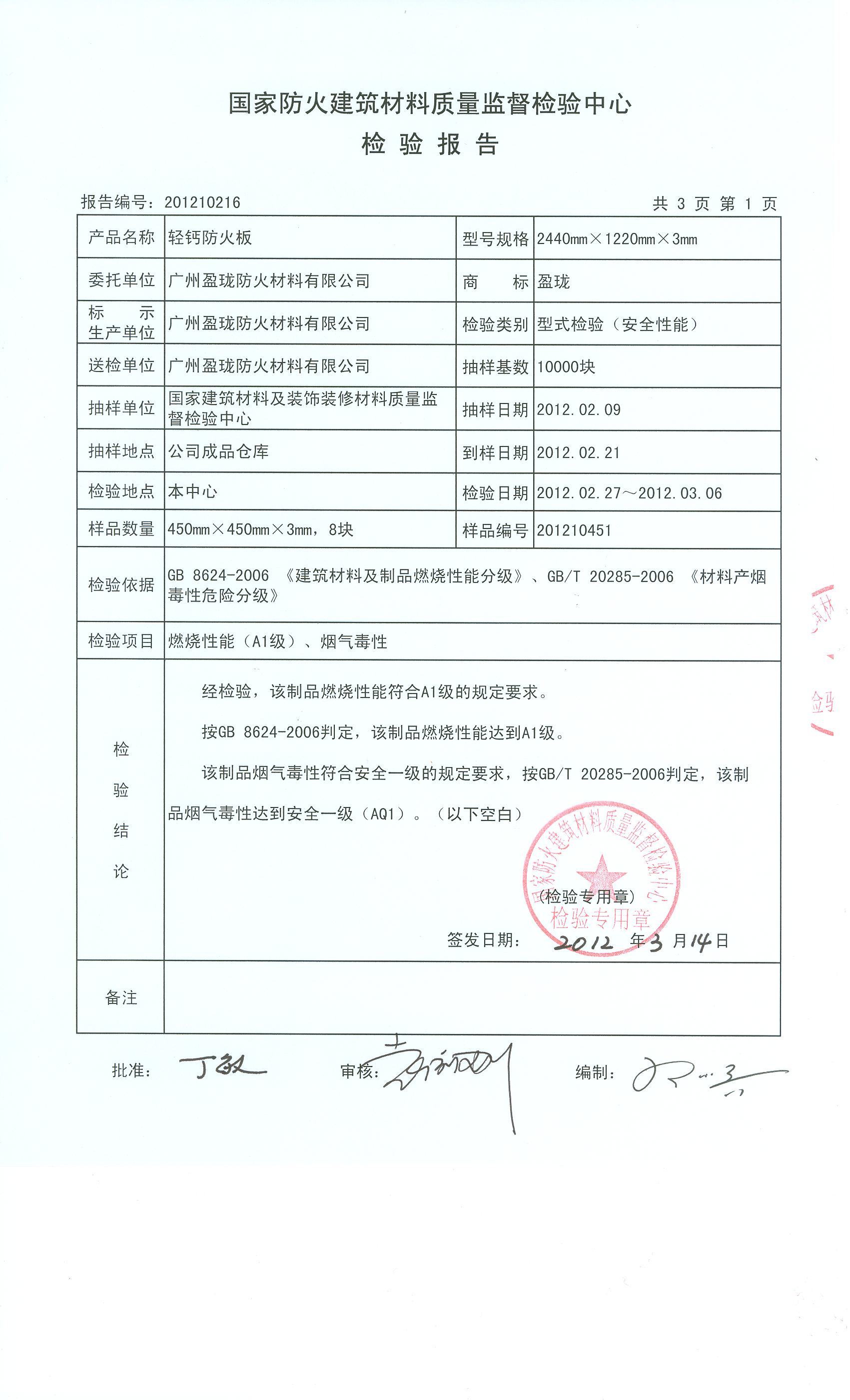 经检验,该制品燃烧性能符合A1级的规定要求。 按GB 8624-2006判定,该制品燃烧性能达到A1级。 该制品烟气毒性符合安全一级的规定要求,按GB/T 20285-2006判定,该制品烟气毒性达到安全一级(AQ1)。(以下空白)