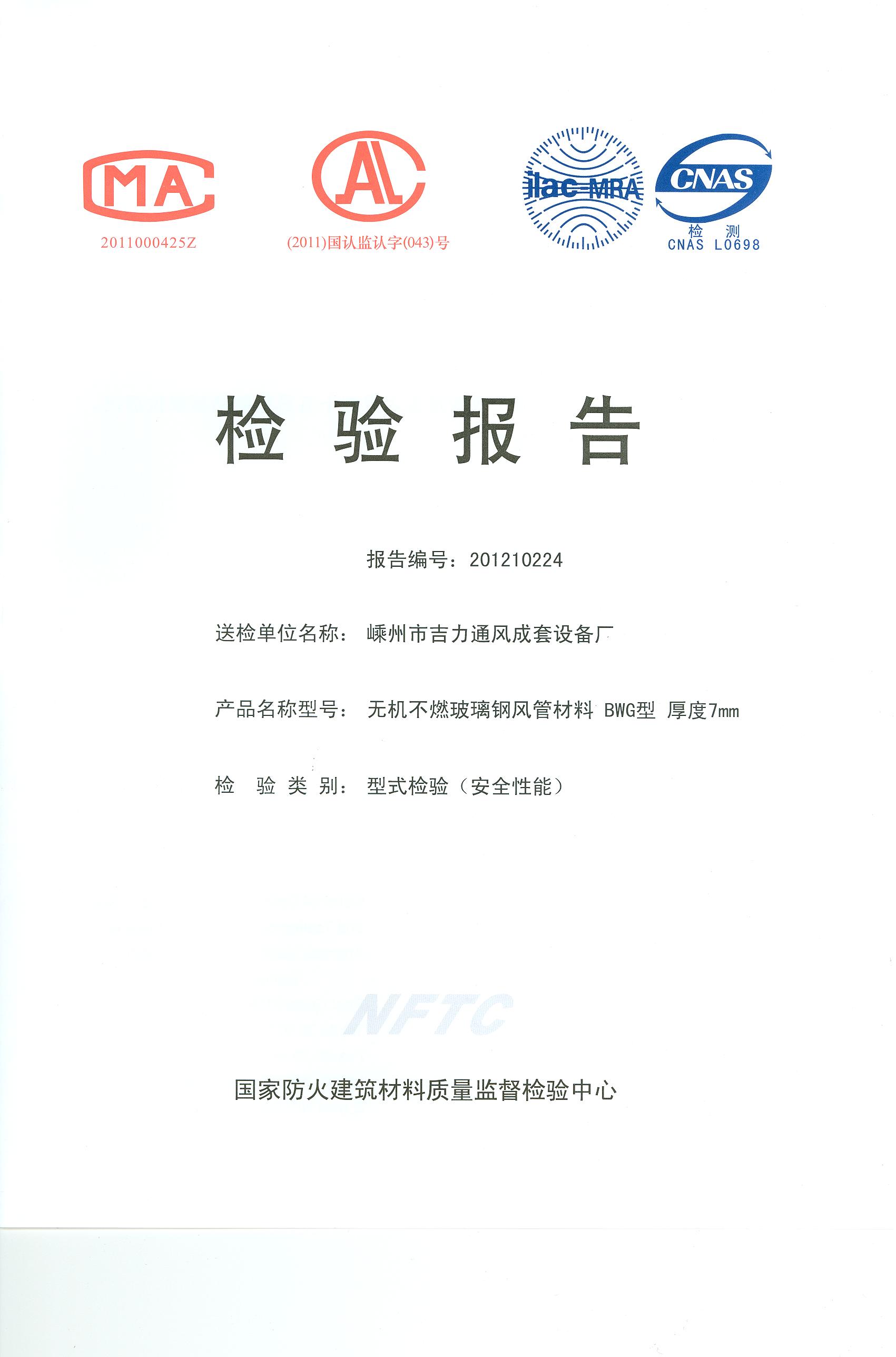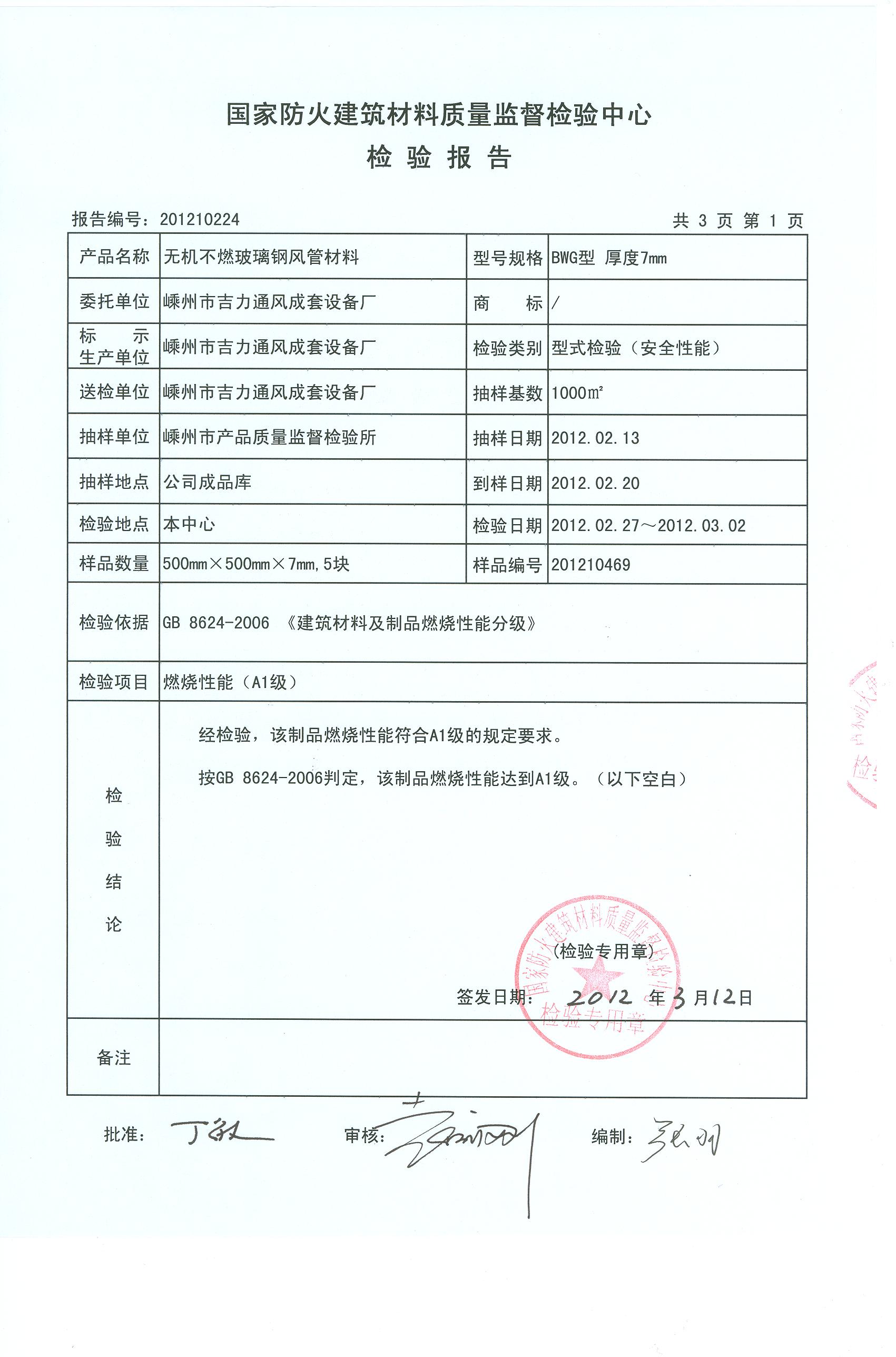经检验,该制品燃烧性能符合A1级的规定要求。 按GB 8624-2006判定,该制品燃烧性能达到A1级。(以下空白)