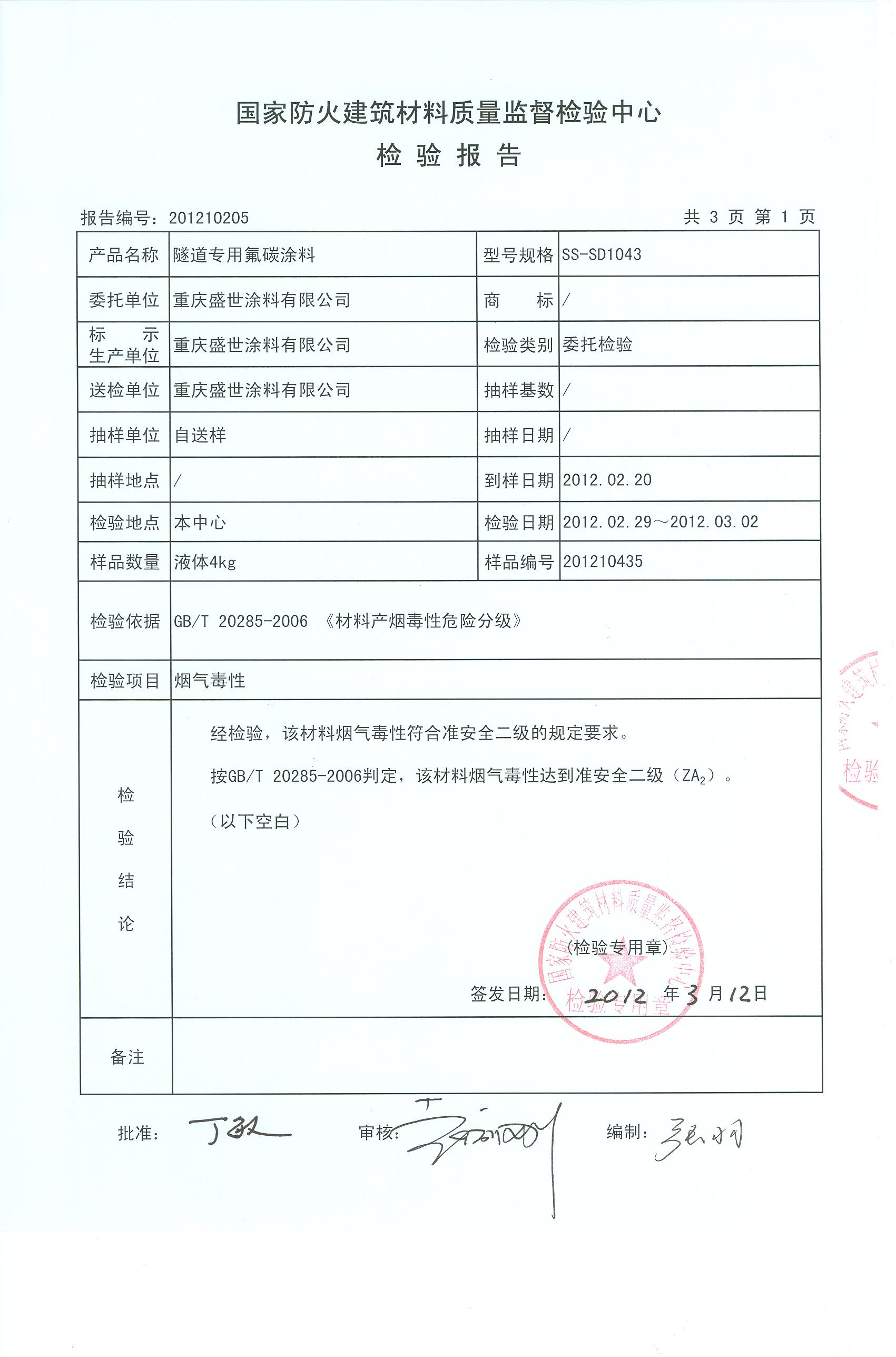 经检验,该材料烟气毒性符合准安全二级的规定要求。 按GB/T 20285-2006判定,该材料烟气毒性达到准安全二级(ZA2)。 (以下空白)