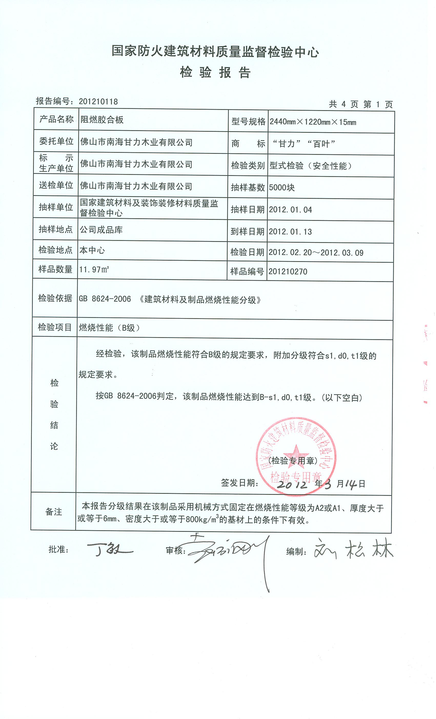 经检验,该制品燃烧性能符合B级的规定要求,附加分级符合s1,d0,t1级的 规定要求。 按GB 8624-2006判定,该制品燃烧性能达到B-s1,d0,t1级。(以下空白)