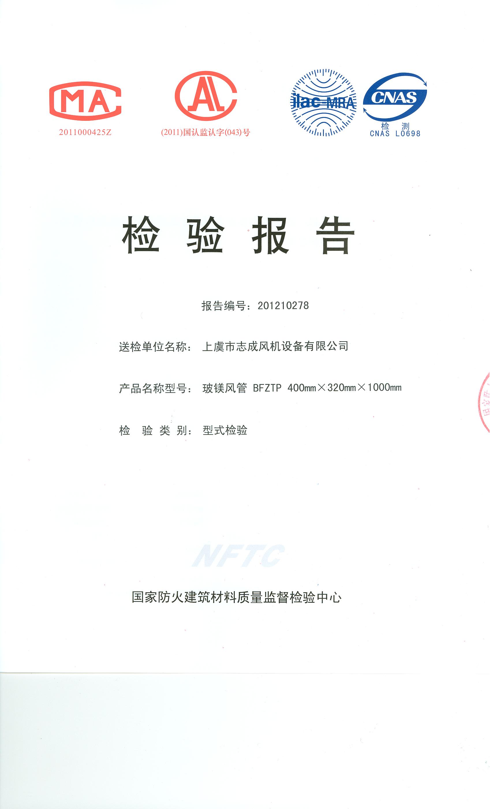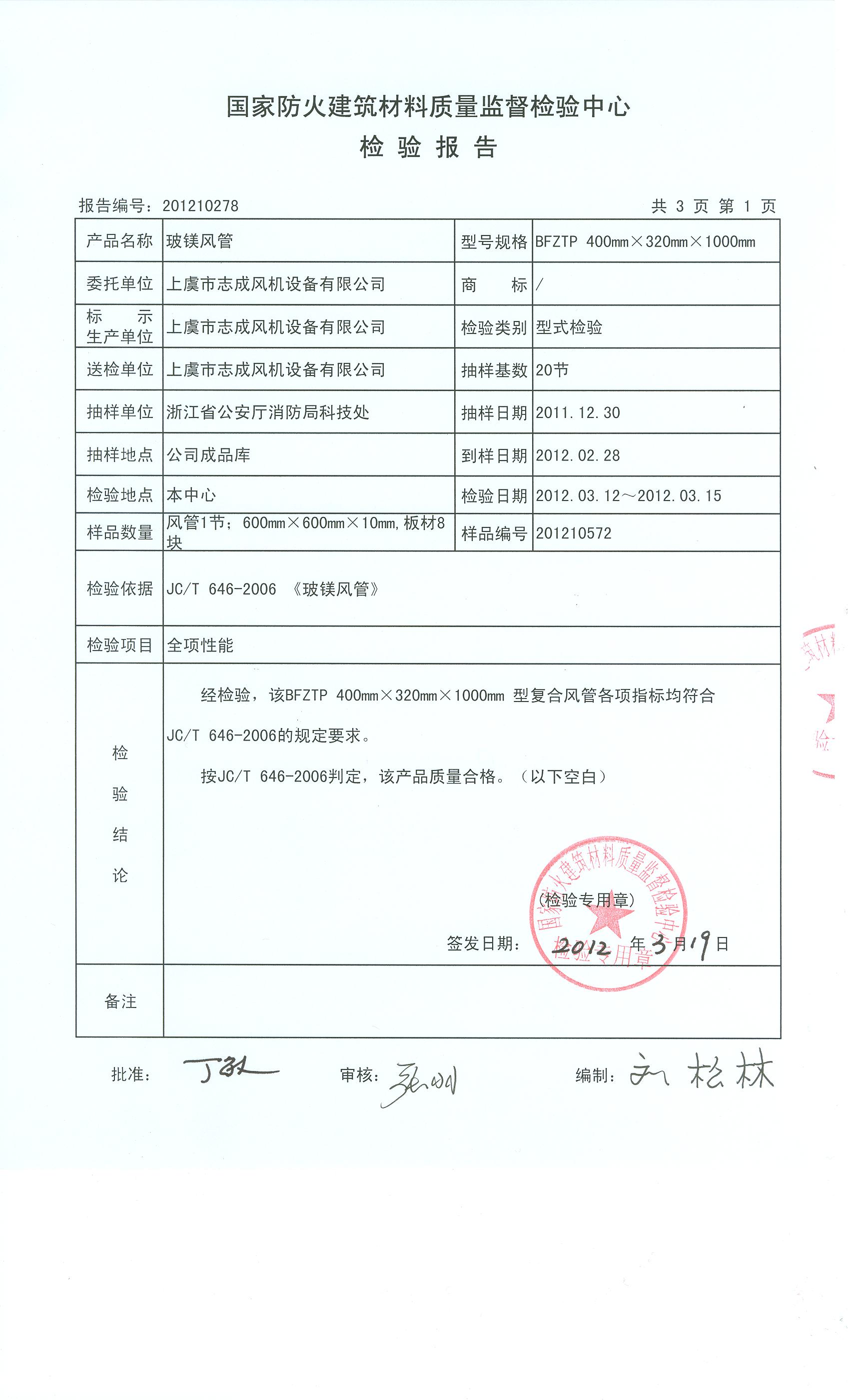 经检验,该BFZTP 400mm×320mm×1000mm 型复合风管各项指标均符合JC/T 646-2006的规定要求。 按JC/T 646-2006判定,该产品质量合格。(以下空白)