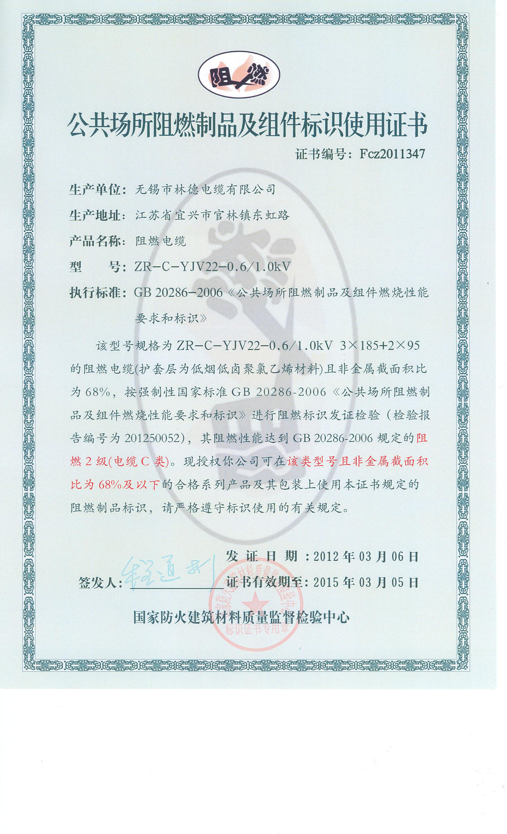 经检验,该ZR-C-YJV22-0.6/1.0kV 3×185+2×95阻燃电缆符合标准规定的阻燃2级(电缆C类) 要求。 按GB 20286-2006判定,该产品阻燃2级(电缆C类)合格。(以下空白)