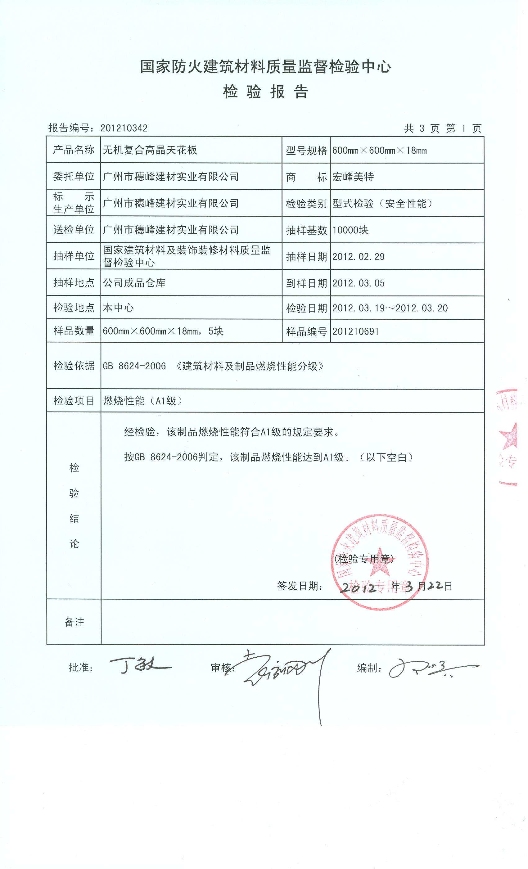 经检验,该制品燃烧性能符合A1级的规定要求。 按GB 8624-2006判定,该制品燃烧性能达到A1级。(以下空白)