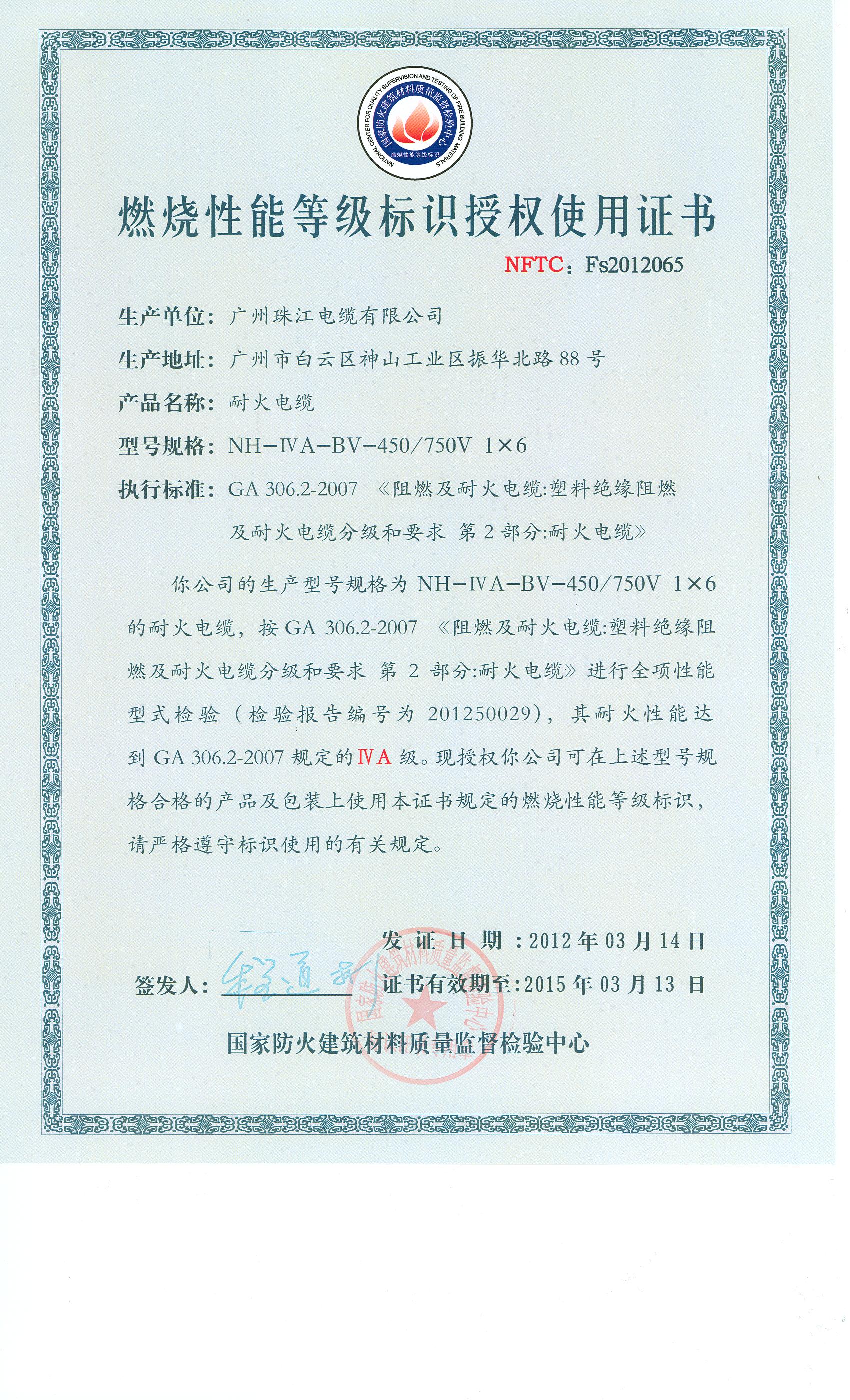 经检验,该NH-ⅣA-BV-450/750V 1×6耐火电缆耐火性能符合ⅣA级规定要求,其它各项技术指标均合格。 按GA 306.2-2007综合判定,该产品质量合格。(以下空白)
