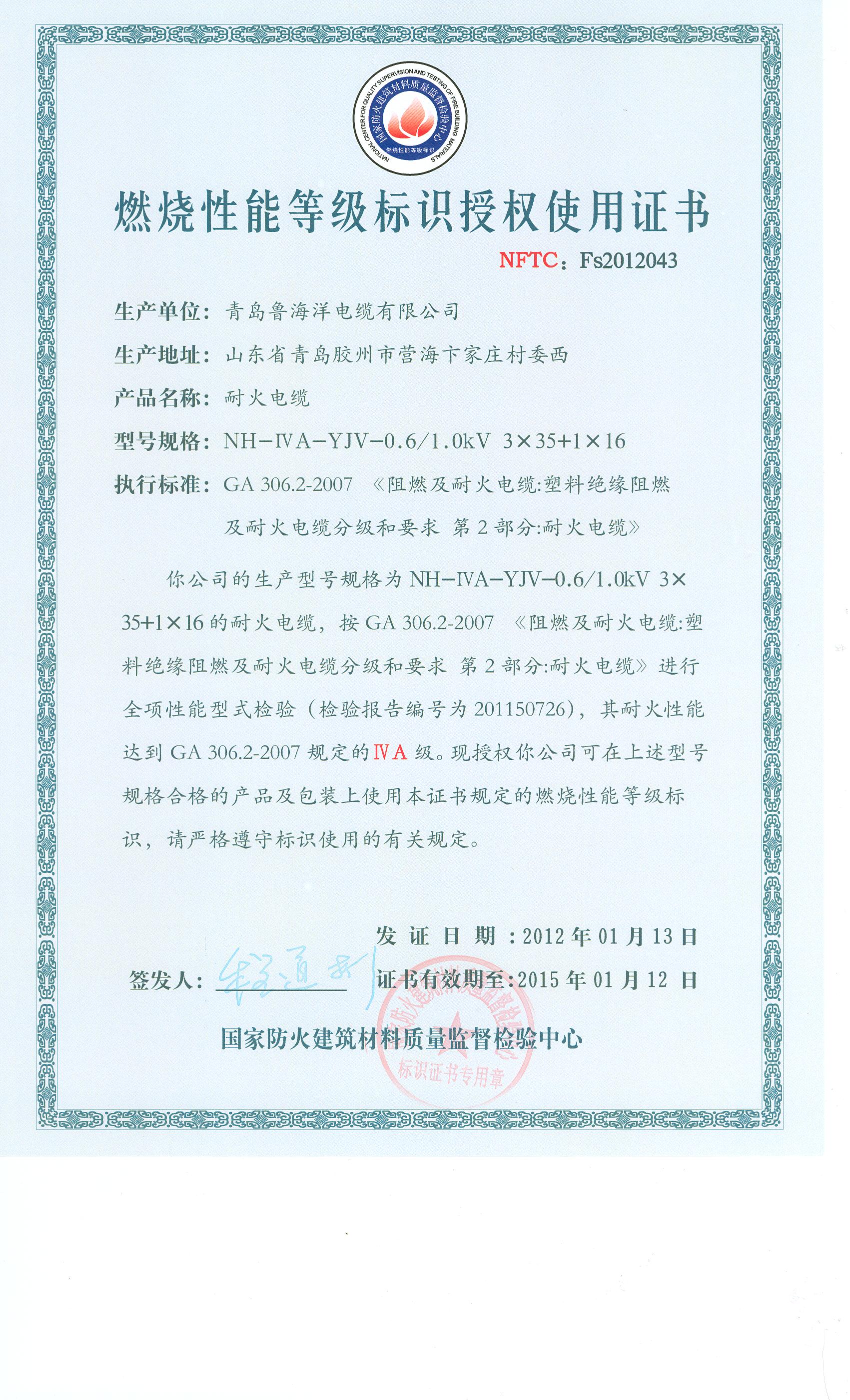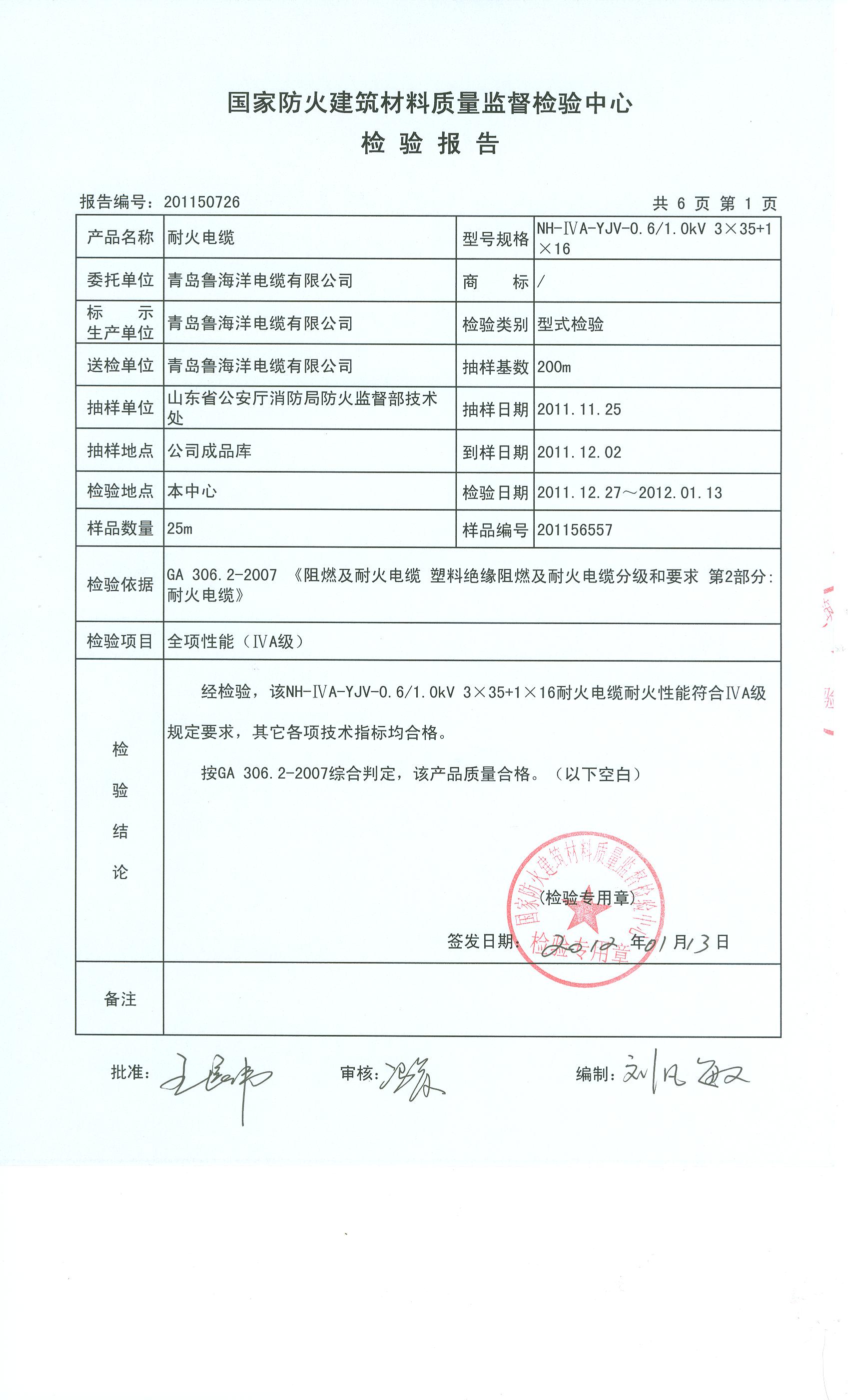 经检验,该NH-ⅣA-YJV-0.6/1.0kV 3×35+1×16耐火电缆耐火性能符合ⅣA级规定要求,其它各项技术指标均合格。 按GA 306.2-2007综合判定,该产品质量合格。(以下空白)