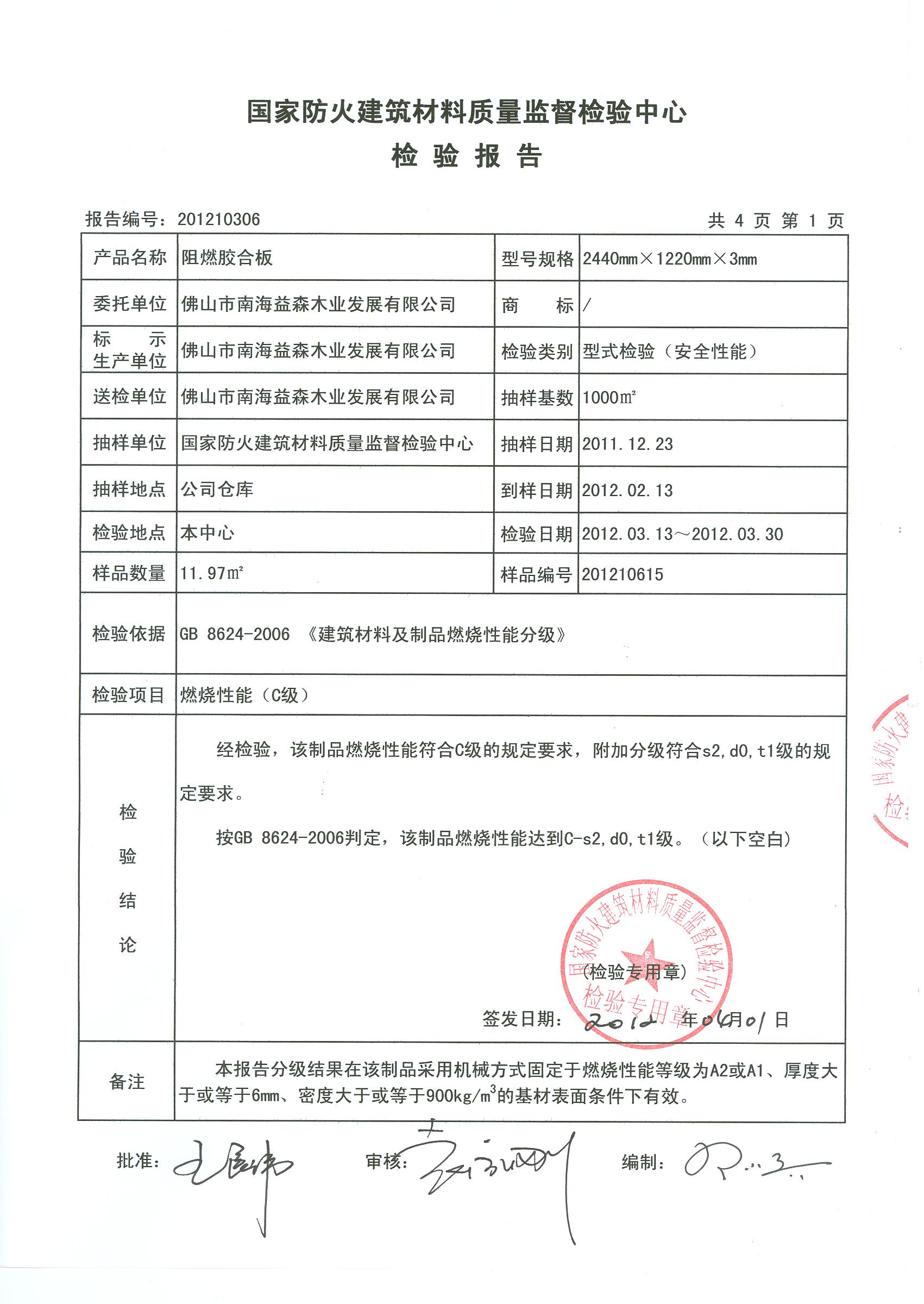经检验,该制品燃烧性能符合C级的规定要求,附加分级符合s2,d0,t1级的规定要求。 按GB 8624-2006判定,该制品燃烧性能达到C-s2,d0,t1级。(以下空白)