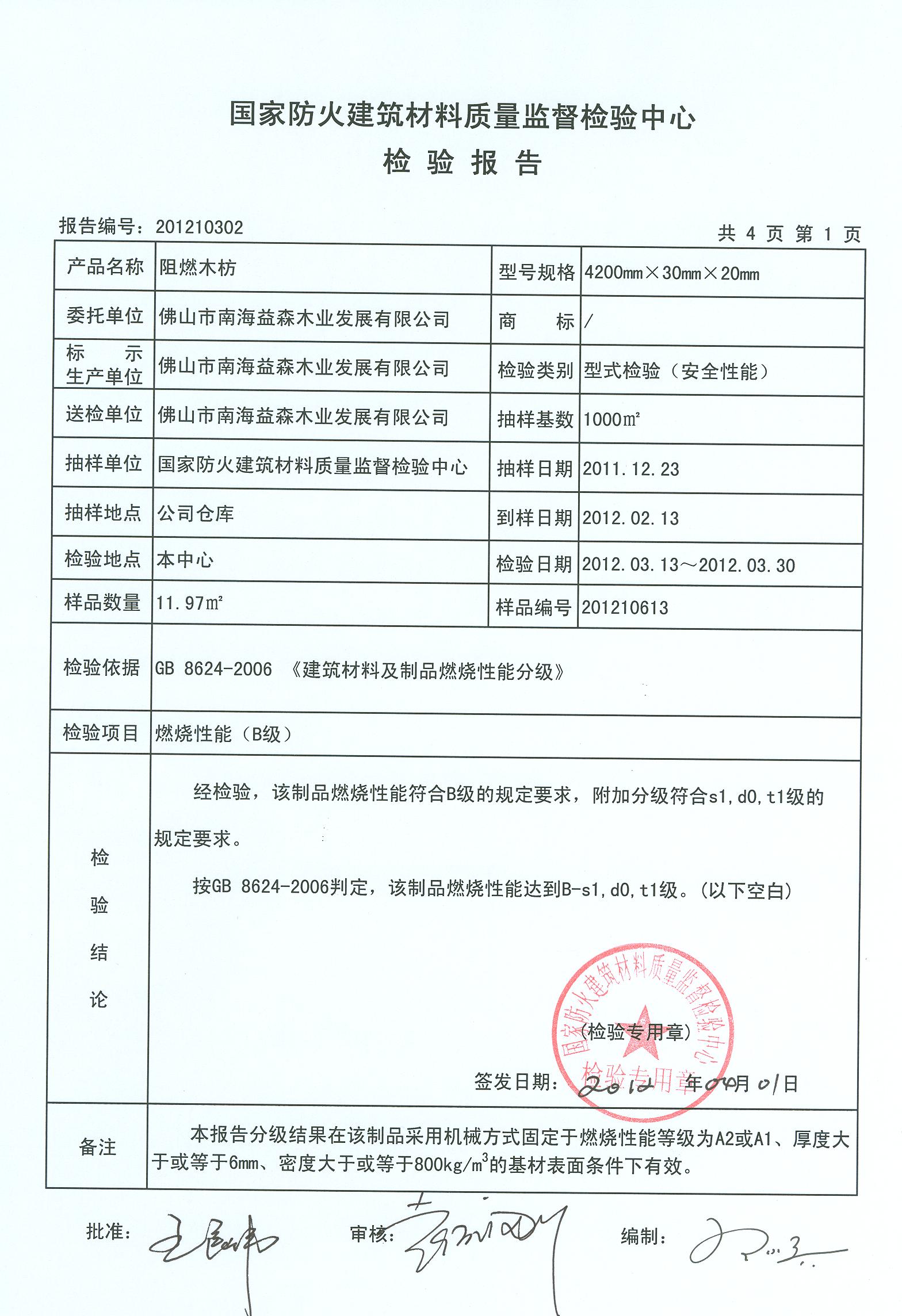 经检验,该制品燃烧性能符合B级的规定要求,附加分级符合s1,d0,t1级的 规定要求。 按GB 8624-2006判定,该制品燃烧性能达到B-s1,d0,t1级。(以下空白)