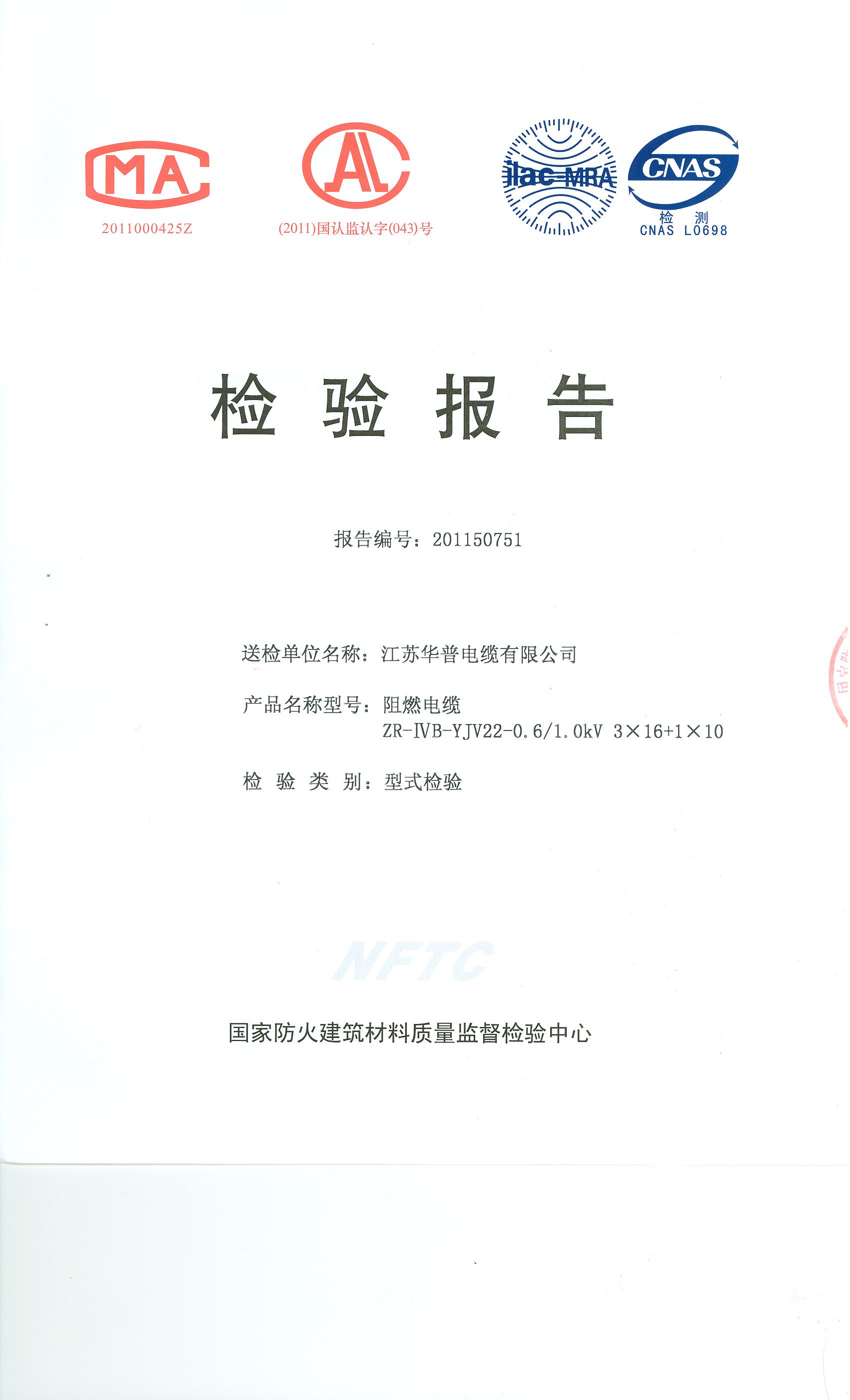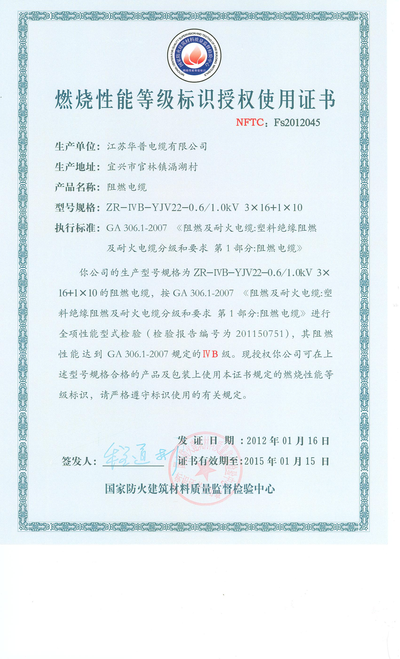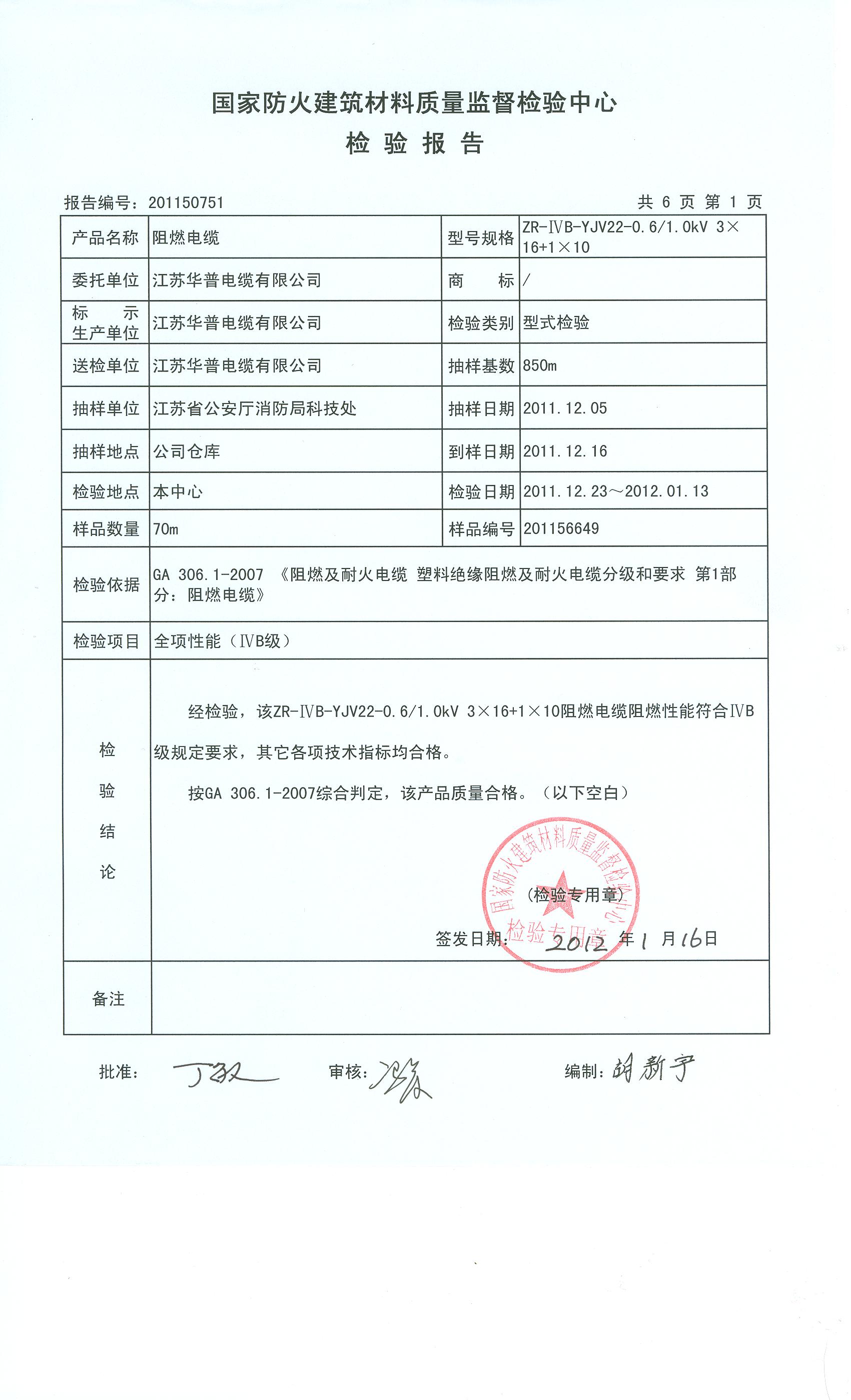 经检验,该ZR-ⅣB-YJV22-0.6/1.0kV 3×16+1×10阻燃电缆阻燃性能符合ⅣB级规定要求,其它各项技术指标均合格。 按GA 306.1-2007综合判定,该产品质量合格。(以下空白)