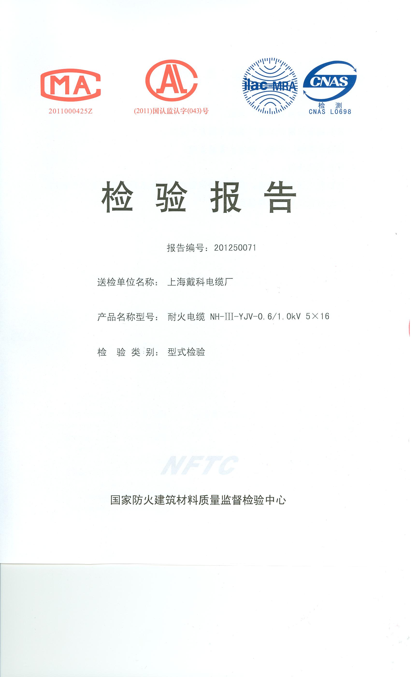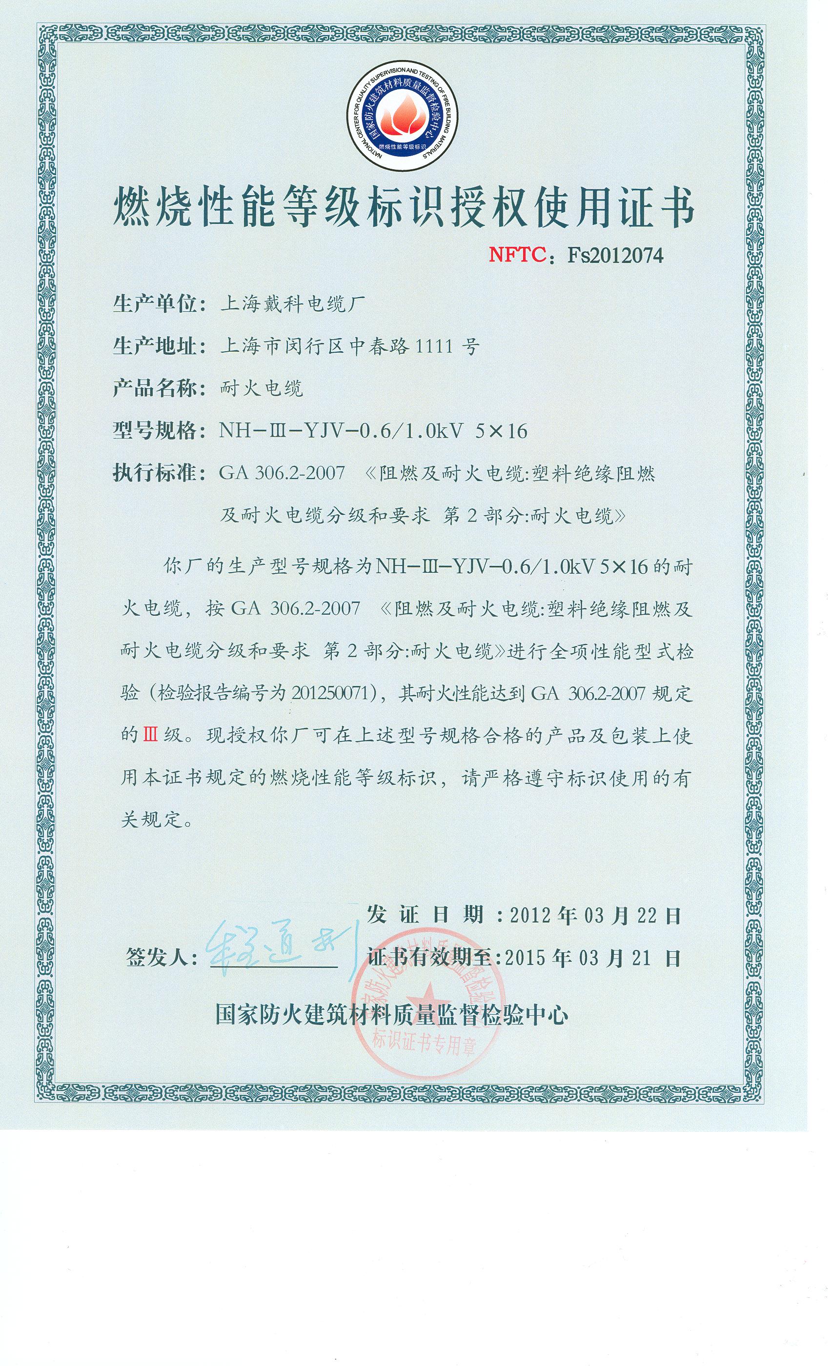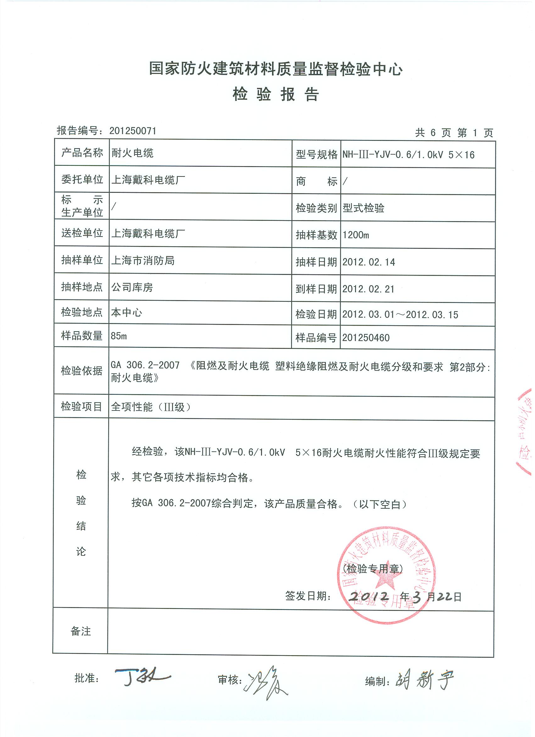 经检验,该NH-Ⅲ-YJV-0.6/1.0kV 5×16耐火电缆耐火性能符合Ⅲ级规定要求,其它各项技术指标均合格。 按GA 306.2-2007综合判定,该产品质量合格。(以下空白)
