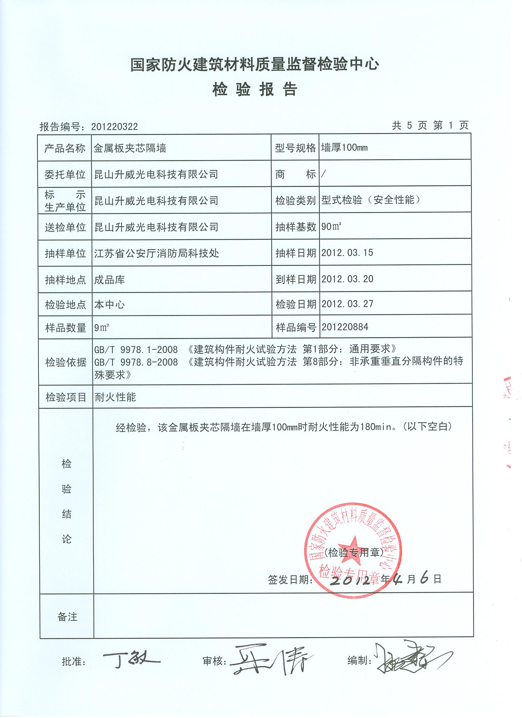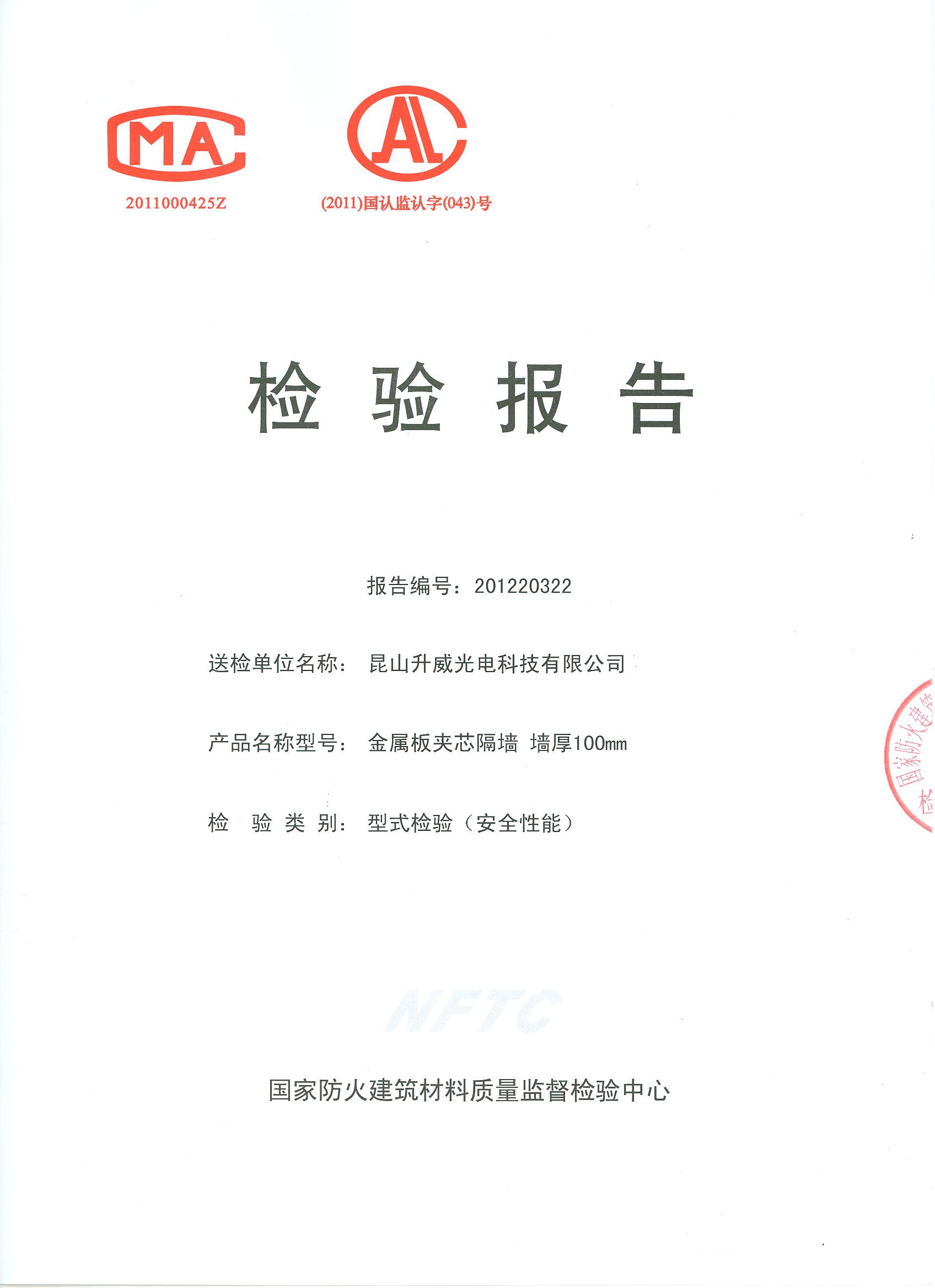 经检验,该金属板夹芯隔墙在墙厚100mm时耐火性能为180min。(以下空白)